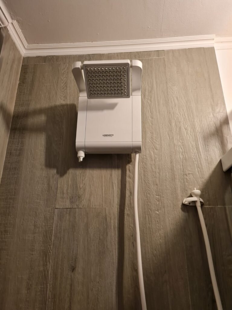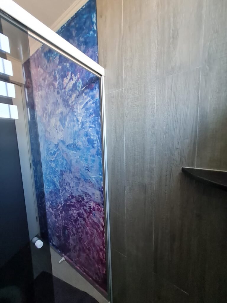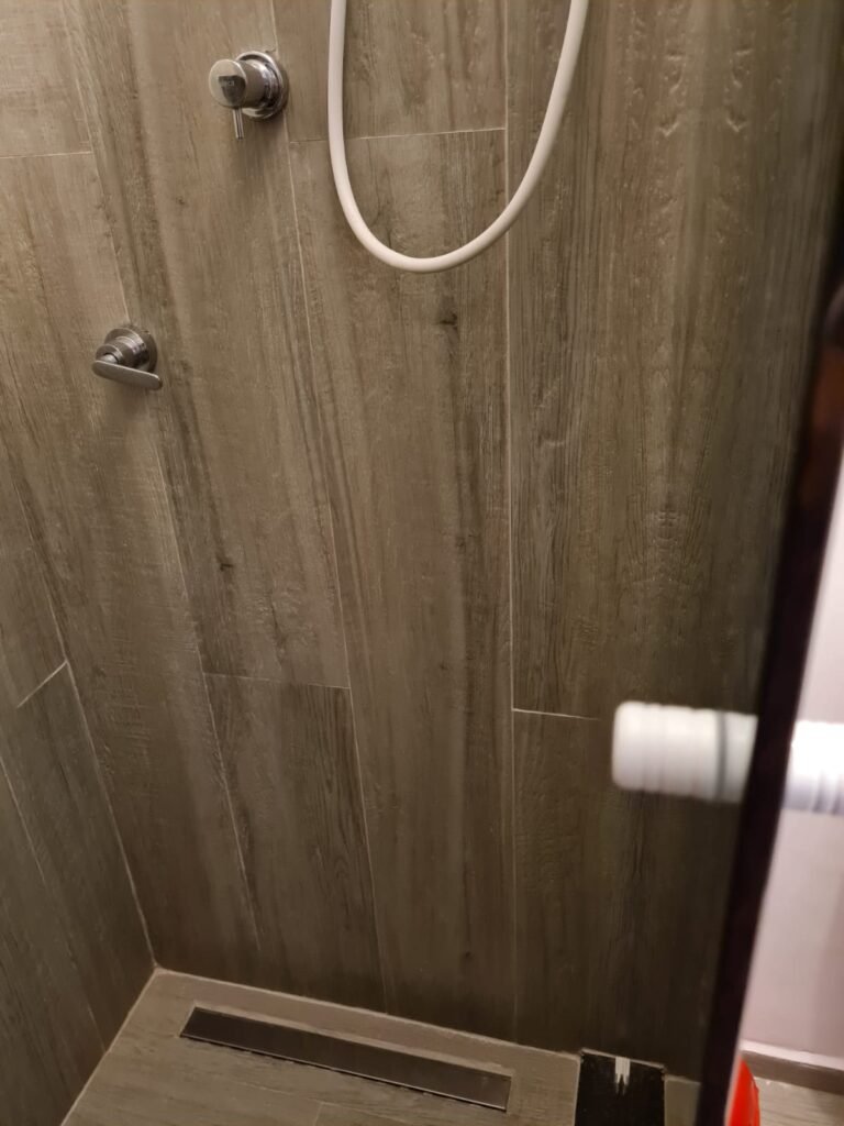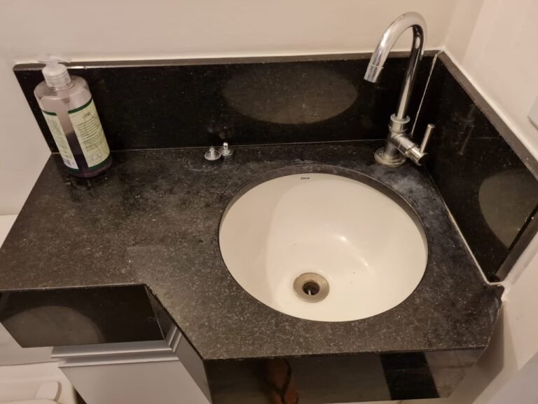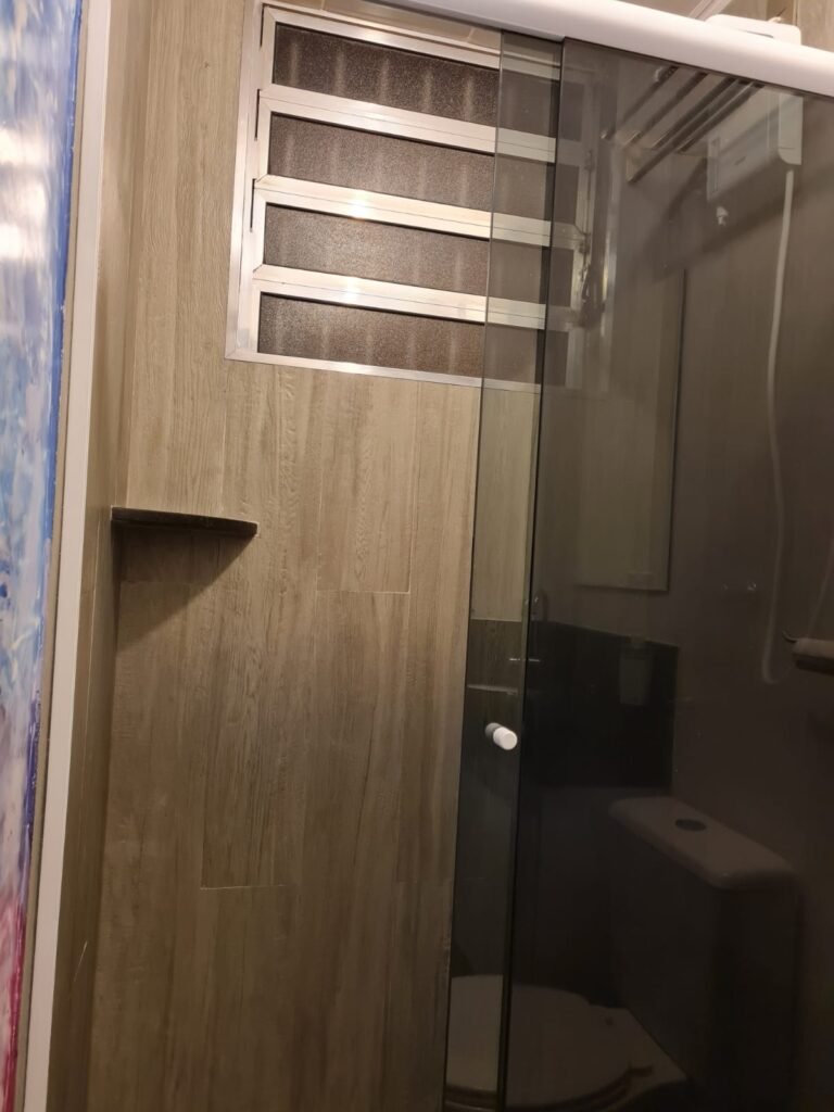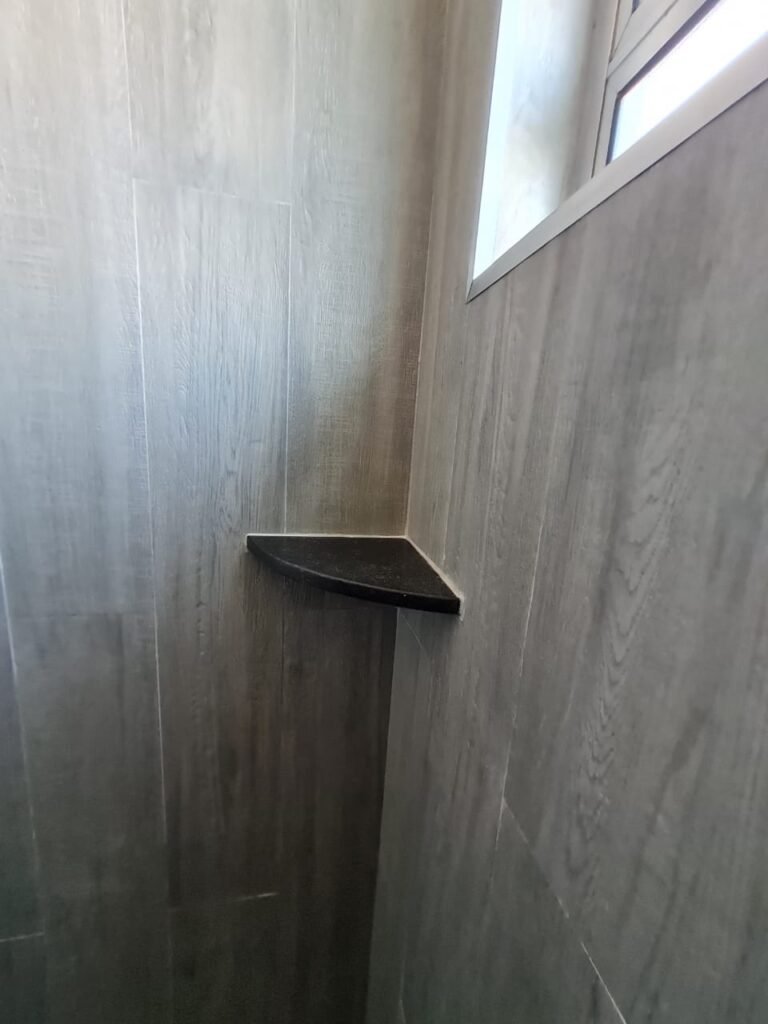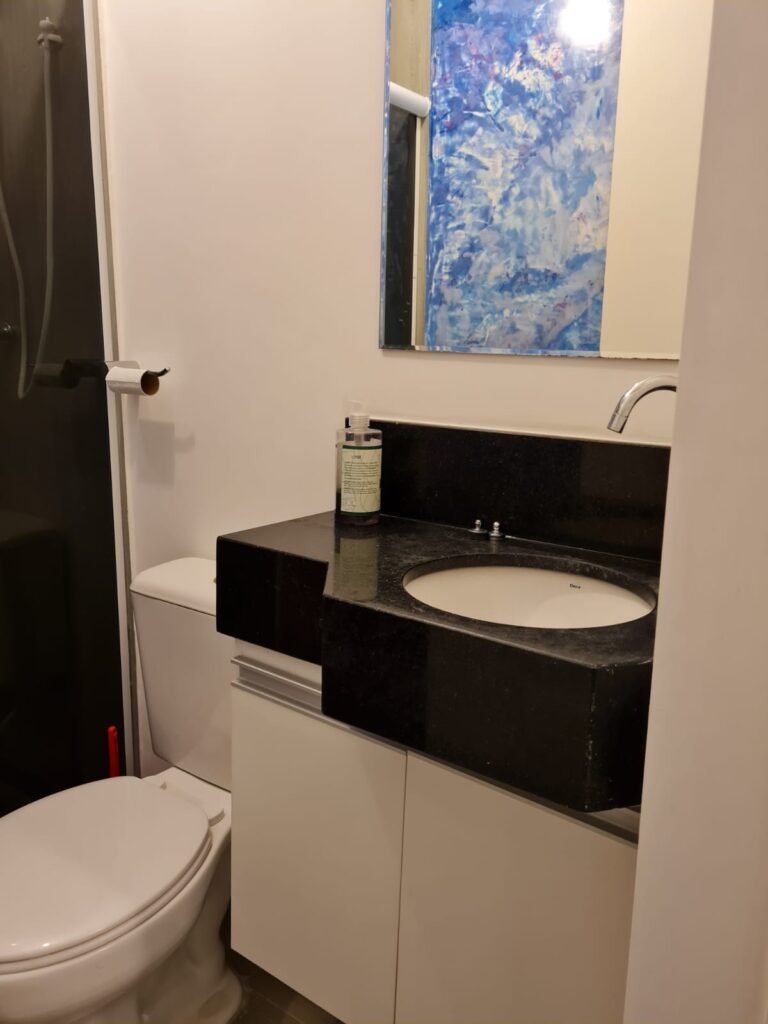 Banheiro:- Piso cerâmico porcelanato Eliane modelo madeira na cor cinza com rodapés em ordem, 01 soleira de granito São Gabriel em ordem, paredes dentro do box com revestimento cerâmico porcelanato Eliane modelo madeira na cinza até o teto em ordem, parede com massa acrílica com a pintura na cor branco neve em ordem, 01 parede de massa acrílica com efeito de cimento queimado colorido revestido de resina em ordem, teto na cor branco neve em ordem, gola de isopor na cor branco neve em ordem, 01 box de vidro blindex na cor fume com duas folhas sendo uma decorrer em ordem , 01 puxador em ordem, 01 ralo seco com tampa inox desentupido em ordem, 02 registros deca em ordem, 01 pia de granito São Gabriel com desgaste natural do tempo restante em ordem, 01 cuba de cerâmica branca marca Deca em ordem, 01 torneira bica móvel em ordem, 02 registros Deca sendo 01 do chuveiro e 01 geral em ordem, 01 armário embutido de madeira MDF 18 cm com a pintura na cor branco com duas portas em ordem, 04 dobradiças pneumáticas em ordem, 02 puxadores de inox em ordem, 01 porta papel higiênico de inox em ordem, 01 porta toalhas de aço inox em ordem, 01 spot com 01 lâmpada fluorescente em ordem, 01 espelho com parte lateral lascada o restante em ordem, 01 ralo com tampa inox desentupido em ordem, 01 conjunto de vaso sanitário e caixa acoplada cerâmica na cor branco marca incepa em ordem, 01 tampa vaso em acrílico em ordem, 01 interruptor para lâmpada e tomada com espelho em ordem, 01 janela de alumínio de abrir com 04 vidros em ordem, 01 prateleira de granito São Gabriel em ordem.