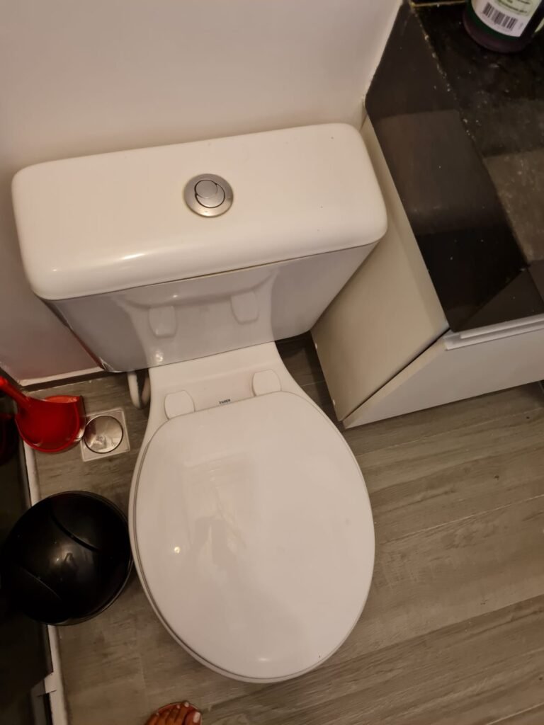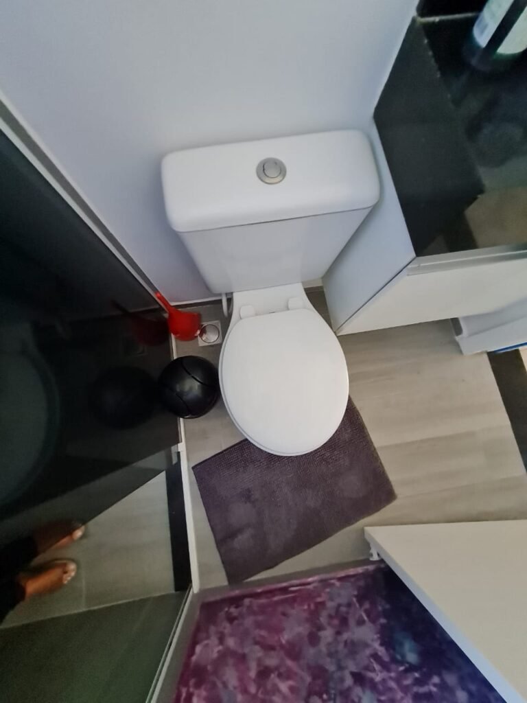 Banheiro:- 01 lixinho para banheiro preto em ordem, 01 vassourinha vermelha para vaso sanitário em ordem, 01 tapete Buettner microfibra antiderrapante Chenille 50x70cm.