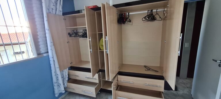 Mobília Quarto:- 01 guarda roupa com 06 portas em ordem, 04 gavetas com corrediças em ordem, 04 prateleiras em ordem, 15 dobradiças em ordem, 14 puxadores em ordem, 01 criado mudo de madeira MDF na cor branco com 01 gaveta em ordem, 01 escrivaninha de madeira MDF na cor branco em ordem, 01 varão de cortina na cor branco em ordem.