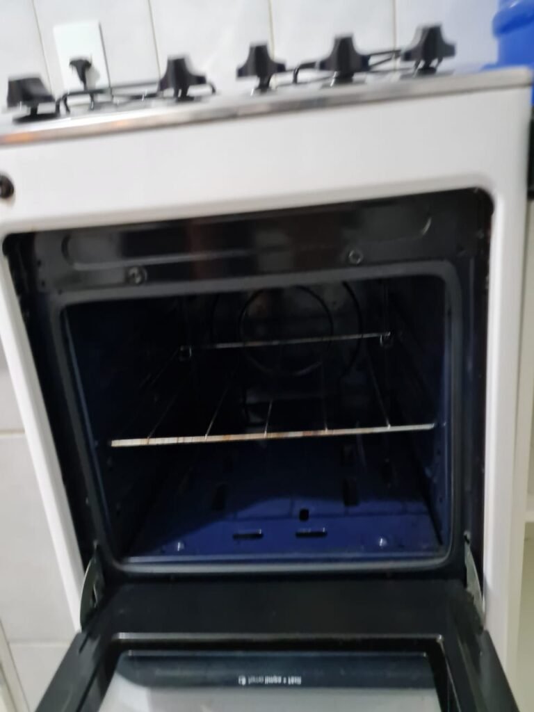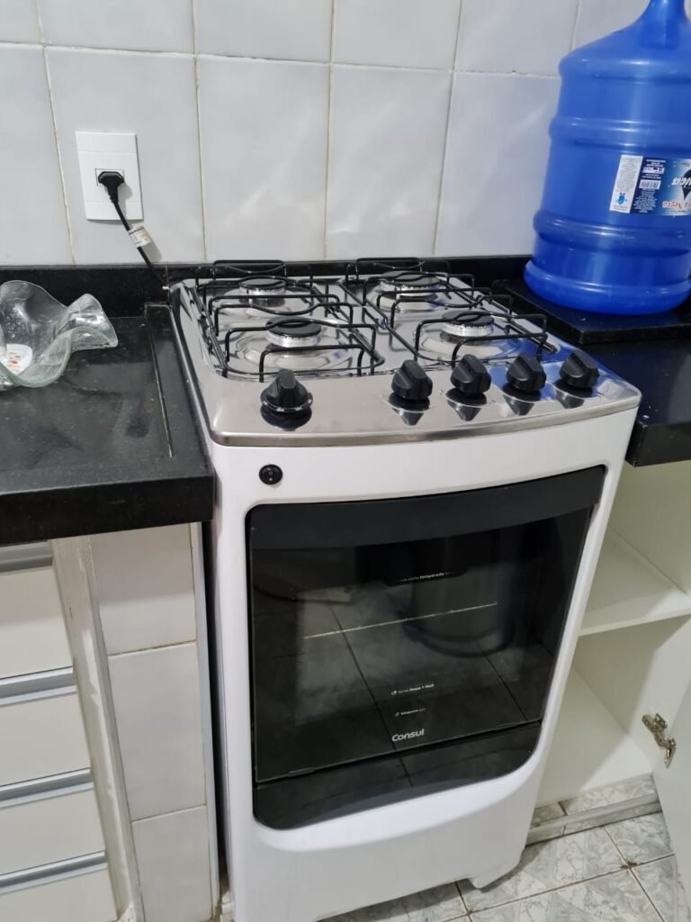Cozinha:- 01 fogão Consul de inox com acendimento automático modelo CF04NAR em ordem, 01 mesa Chá Mauá D80X76H Imbuia Etna com desgaste natural do tempo, 04 cadeiras modelo Sofia Tramontina com desgaste natural tempo em ordem, 01 tampa do fogão em ordem, 01 galão de agua de 20 litros com bomba manual em ordem, 01 varal de suspender em ordem, 01 varal de chão em ordem, 01 cortina de renda sintética na cor branca em ordem, 01 passadeira de cozinha antiderrapante.