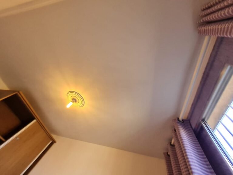 Quarto:- Piso frio cerâmico mesclado com desgaste natural do tempo restante em ordem, rodapés com desgaste natural do tempo restante em ordem, 01 porta de madeira concremwood 75 cm MDF na cor branco com guarnição nova em ordem, fixador para travar a porta na parede de plástico em ordem, paredes com a pintura na cor branco neve Coral em ordem, parede com grafiato com a pintura na cor lavanda Coral em ordem, 01 janela de alumínio de correr com uma folha de vidro em ordem, teto com pintura na cor branco com marcas de desempenar restante em ordem, duas golas de gesso em ordem, 1 gola de gesso no ponto de luz com uma parte lascada restante em ordem, 01 interruptor em ordem, 01 espelho de luz em ordem, 01 espelho de luz cego em ordem, 01 spot lâmpada fluorescente compacta em ordem.