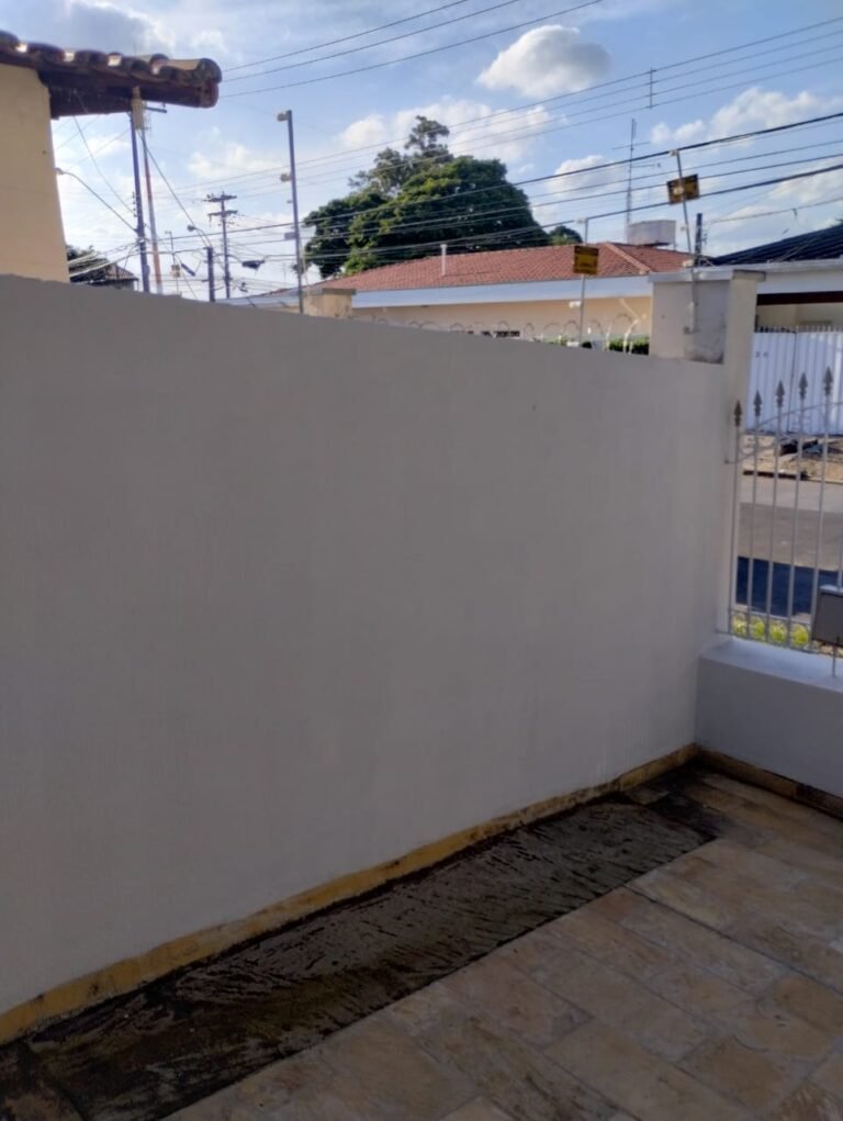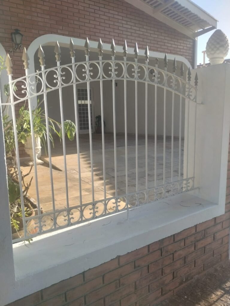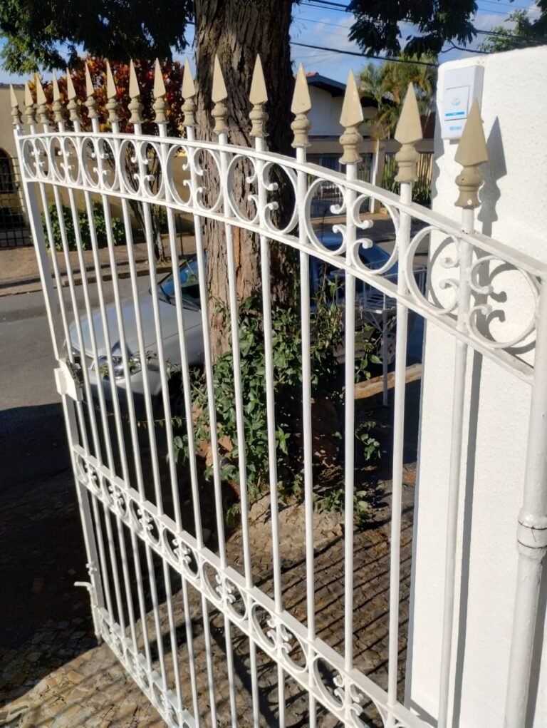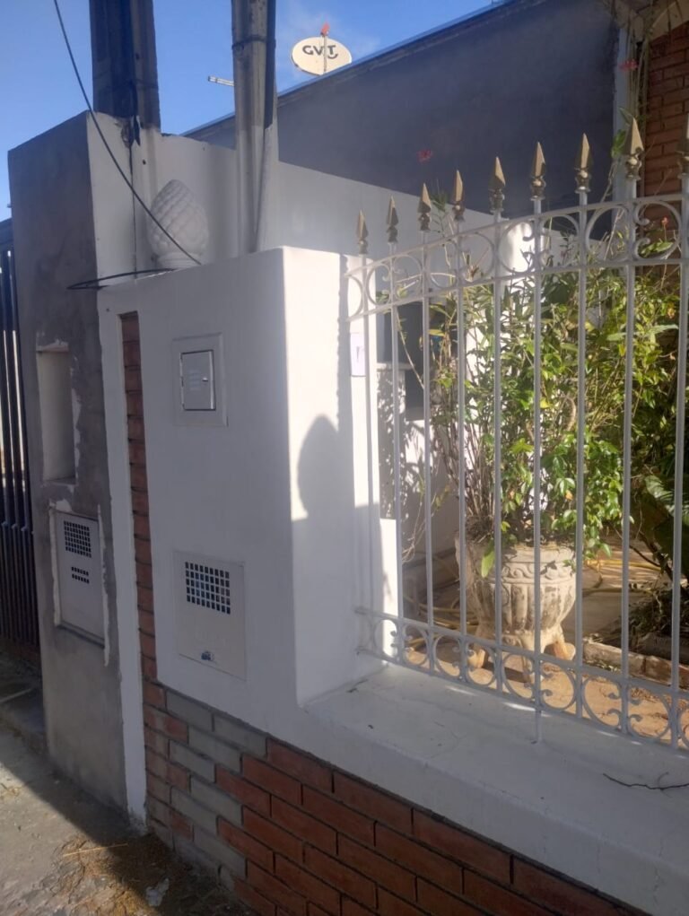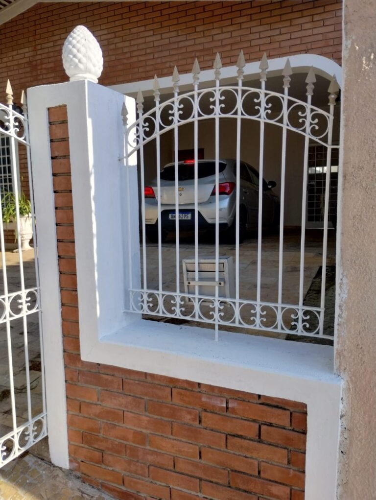 FACHADA:- Calçada em paralelepípedo com desgaste natural, faltando peças em volta da árvore e restante em ordem, portão com grades de ferro de abrir com a pintura nova na cor branco e em ordem, fechadura quebra e sem funcionamento, trava para portão com cadeado tranca e chaves em ordem, 03 grades de aço com a pintura nova na cor branco em ordem, 03 pinhas médias decorativas em cimento instaladas nos pilares do portão com a pintura nova na cor branco na cor branco e restante em ordem, muro em tijolinho a vista com desgaste natural, piso em Pedra São Tomé com desgaste natural e restante em ordem, paredes com a pintura nova na cor, teto com a pintura na cor branco em ordem, gola de gesso com a pintura na cor branco em ordem, 03 arandelas de jardim em ferro com vidros em ordem, sendo que 02 estão com as lâmpadas queimadas e 01 sem lâmpada e sem funcionamento, 01 jardim com plantas naturais com acabamento em madeira com a pintura na cor branco com cupim, 01 torneira de rosca de jardim em ordem, 01 caixa de correio fixada na grade do portão em ordem, 01 lixeira de ferro chumbada na caçada com a pintura na cor branco com desgastes naturais, ferrugem e está torta, relógio da Sanasa em ordem, relógio CPFL em ordem, 01 relógio da Comgás em ordem, 01 relógio com disjuntores bipolar Steck em ordem, 01 extensão fixada ao relógio com 05 saídas em ordem, 01 registro de água com tampa em ordem.