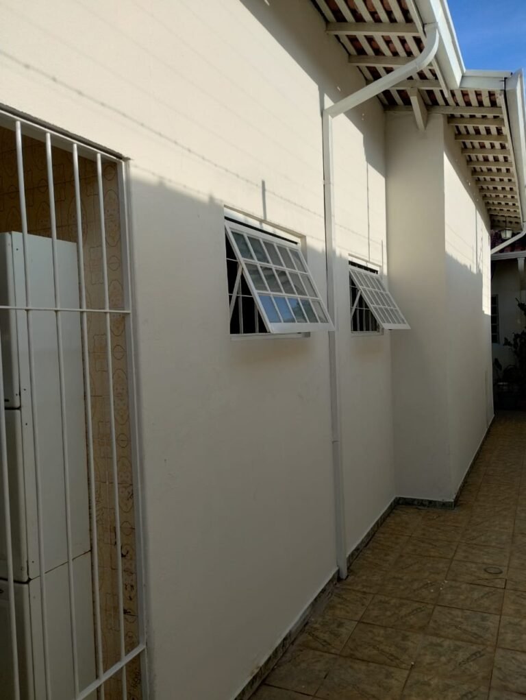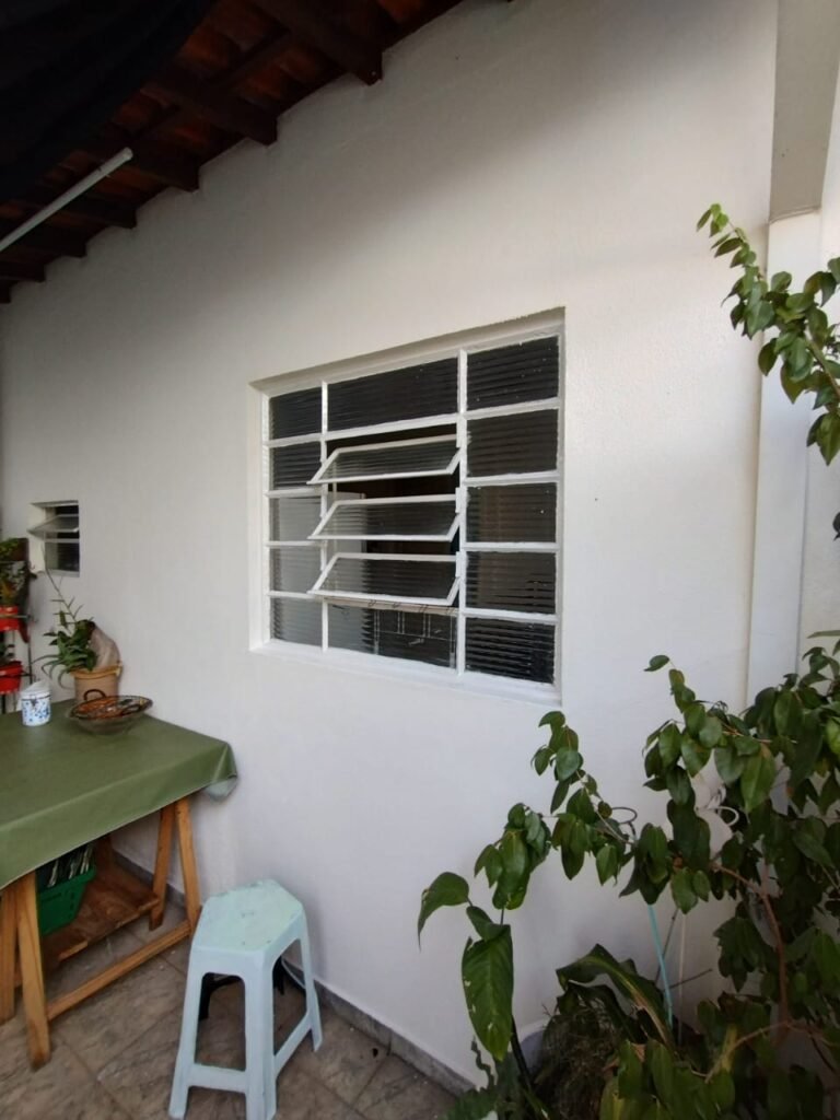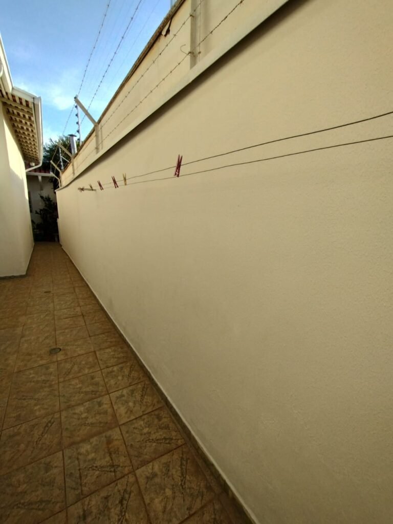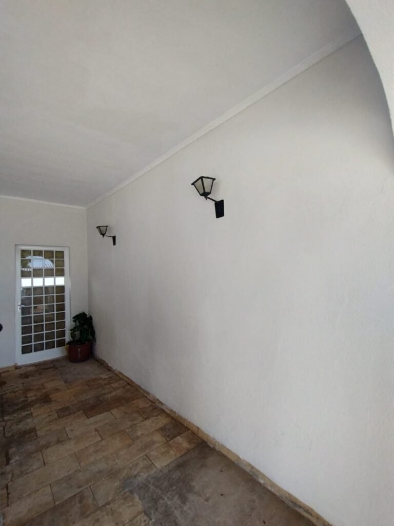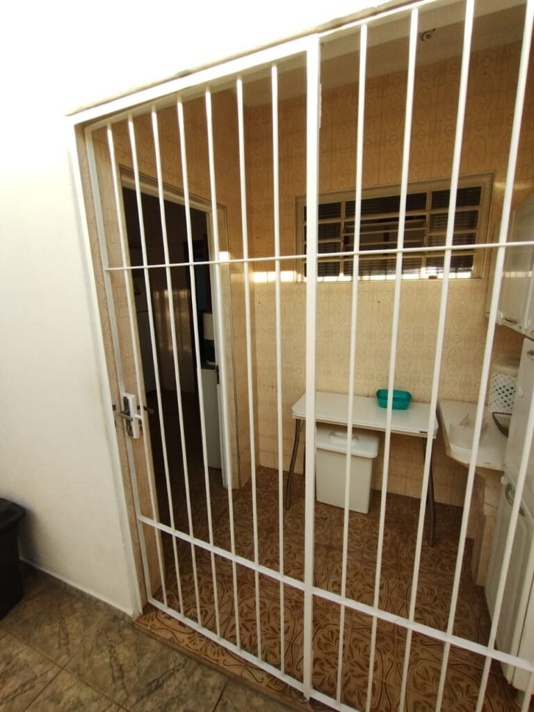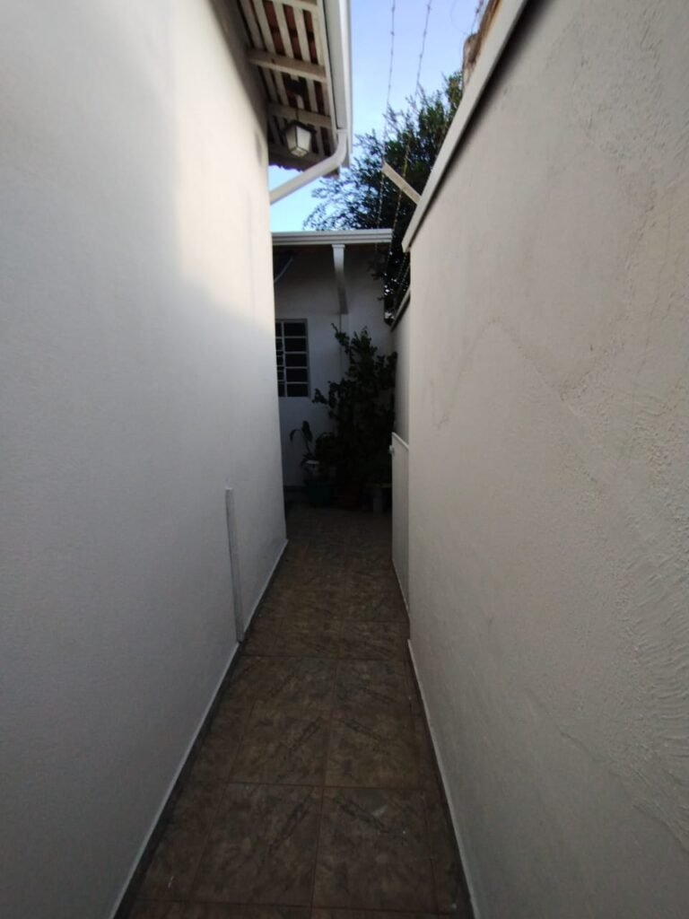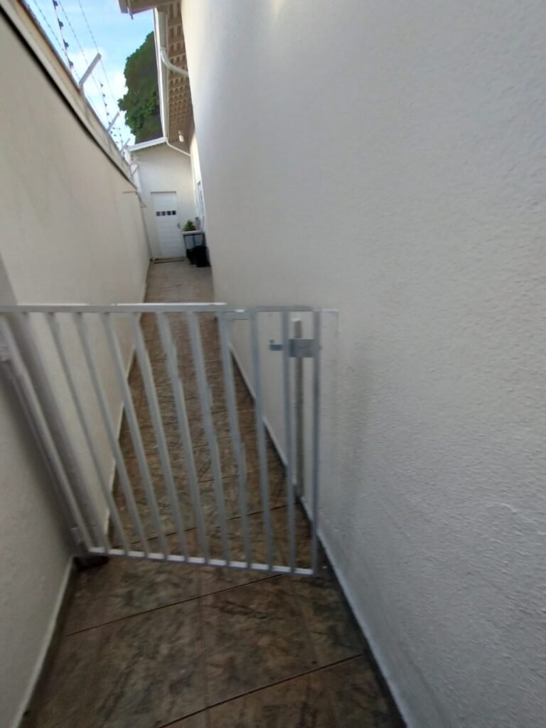 CORREDOR:- Piso cerâmico antiderrapante mesclado em ordem, rodapés em ordem, paredes com a pintura nova na cor branco em ordem, uma casinha rebocada e pintada, com parte superior com revestimento cerâmico antiderrapante em ordem, piso com mancha de ferrugem em 04 peças o restante em ordem, 01 botijão de gás com mangueira e registro em ordem, uma saída para gás (Comgás) em ordem, 01 porta de ferro com a pintura na cor branco em ordem, maçaneta em ordem, dobradiças em ordem, chave em ordem, 40 vidros pintados na cor branco, 041 vidros incolor (sem a pintura) em ordem, calha com a pintura na cor branco desentupida em ordem, 01 grelha com coletor desentupida em ordem, 02 ralos desentupidos em ordem, cerca em todo entorno do muro com arame esfarpado em ordem, 01 portãozinho ferro coma pintura na cor branco em ordem, trinco em ordem. Telhado com madeiramento aparente com a pintura na cor branco em ordem, 03 luminárias ferro de jardim com 02 lâmpada de led em ordem, 01 alçapão com porta de ferro e trinco em ordem.