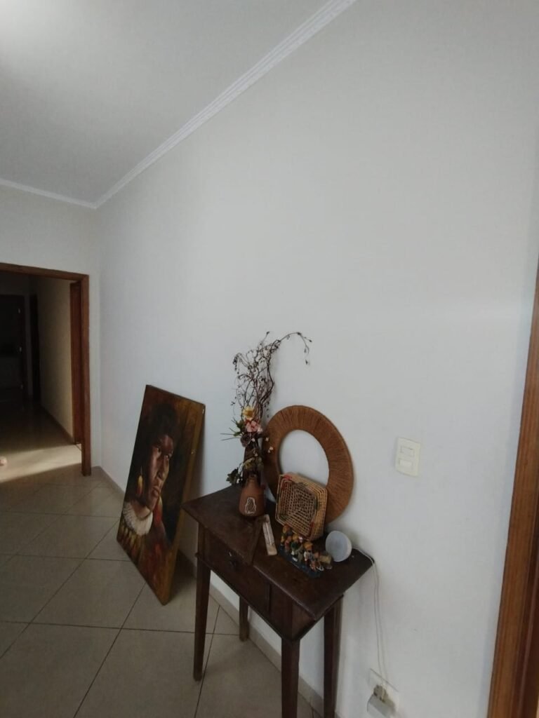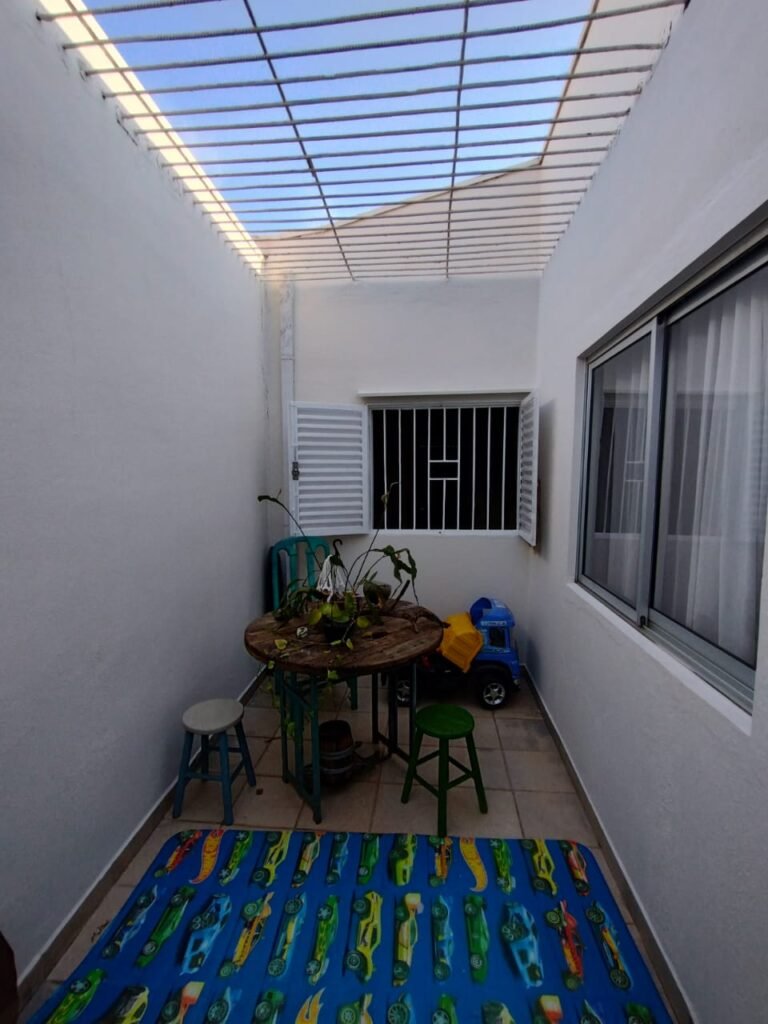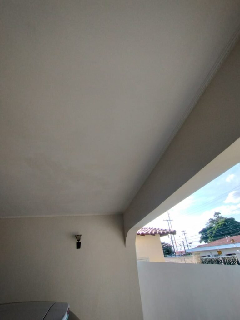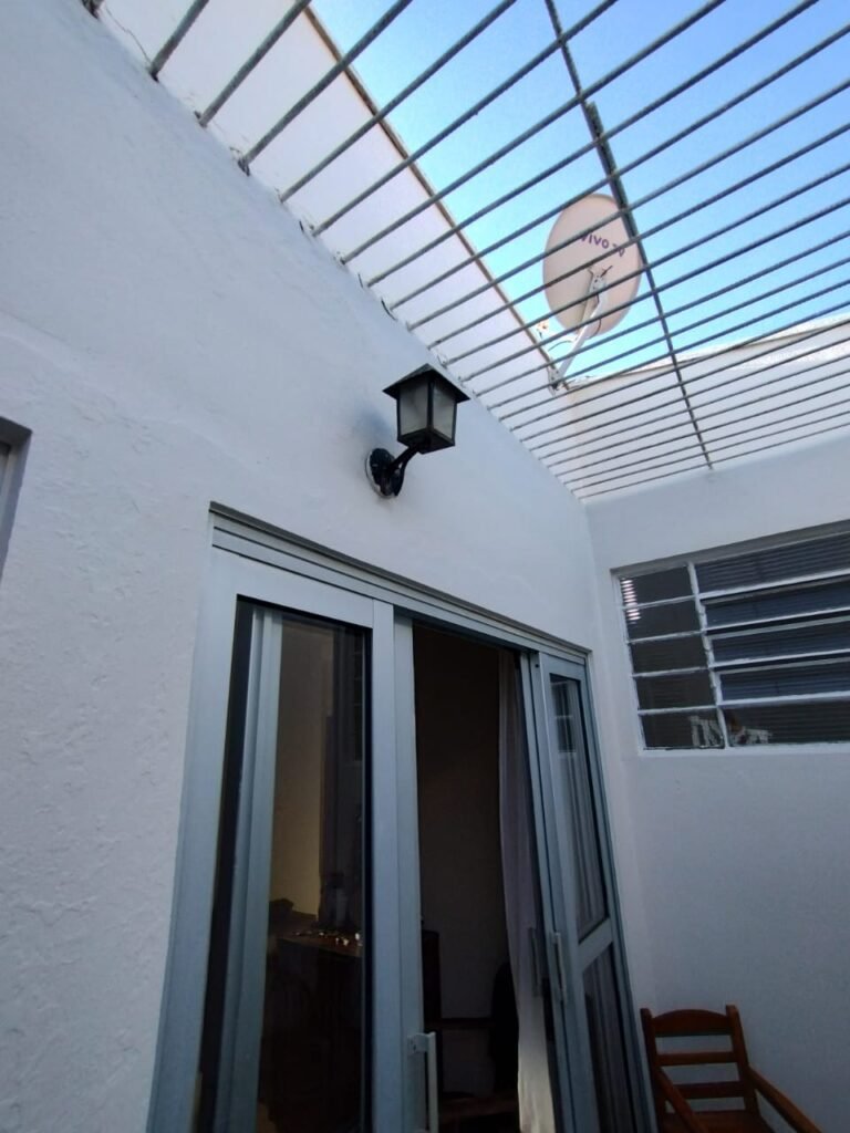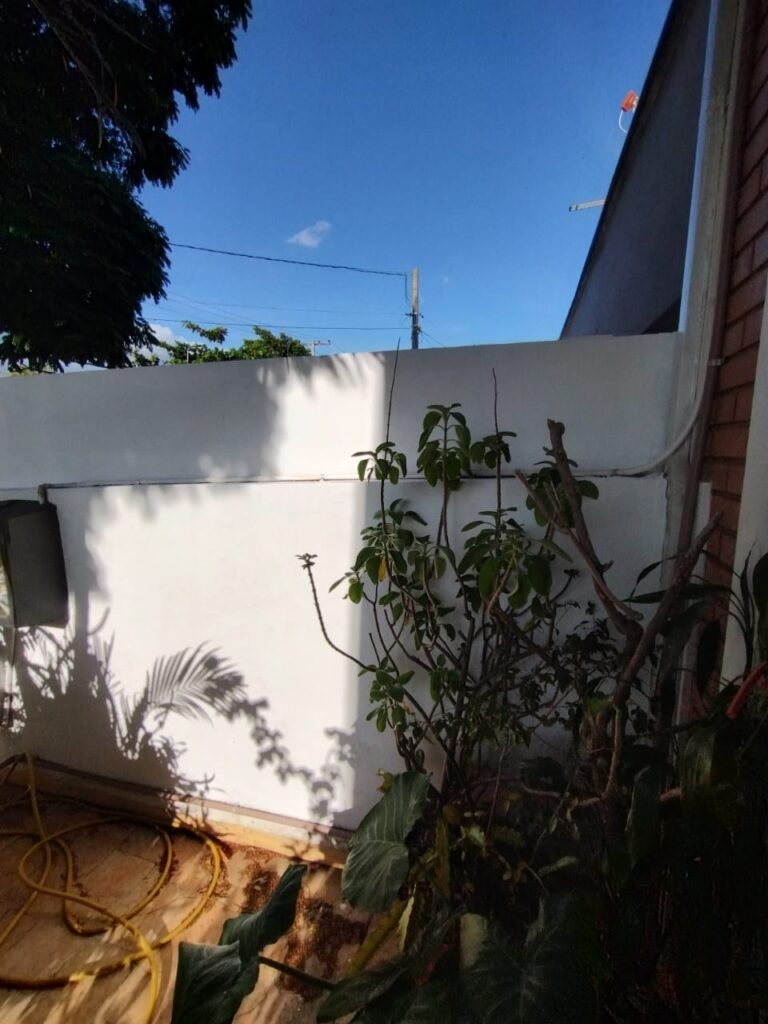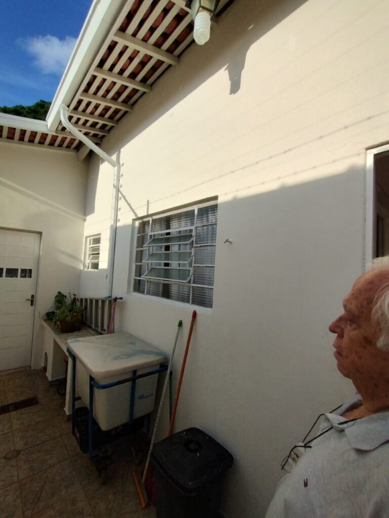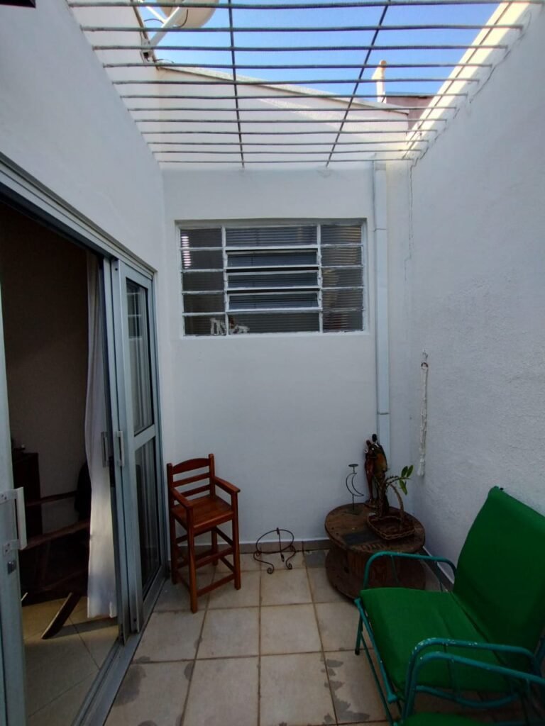 CORREDOR:- Piso cerâmico antiderrapante mesclado em ordem, rodapés em ordem, paredes com a pintura nova na cor branco em ordem, uma casinha rebocada e pintada, com parte superior com revestimento cerâmico antiderrapante em ordem, piso com mancha de ferrugem em 04 peças o restante em ordem, 01 botijão de gás com mangueira e registro em ordem, uma saída para gás (Comgás) em ordem, 01 porta de ferro com a pintura na cor branco em ordem, maçaneta em ordem, dobradiças em ordem, chave em ordem, 40 vidros pintados na cor branco, 041 vidros incolor (sem a pintura) em ordem, calha com a pintura na cor branco desentupida em ordem, 01 grelha com coletor desentupida em ordem, 02 ralos desentupidos em ordem, cerca em todo entorno do muro com arame esfarpado em ordem, 01 portãozinho ferro coma pintura na cor branco em ordem, trinco em ordem. Telhado com madeiramento aparente com a pintura na cor branco em ordem, 03 luminárias ferro de jardim com 02 lâmpada de led em ordem, 01 alçapão com porta de ferro e trinco em ordem.