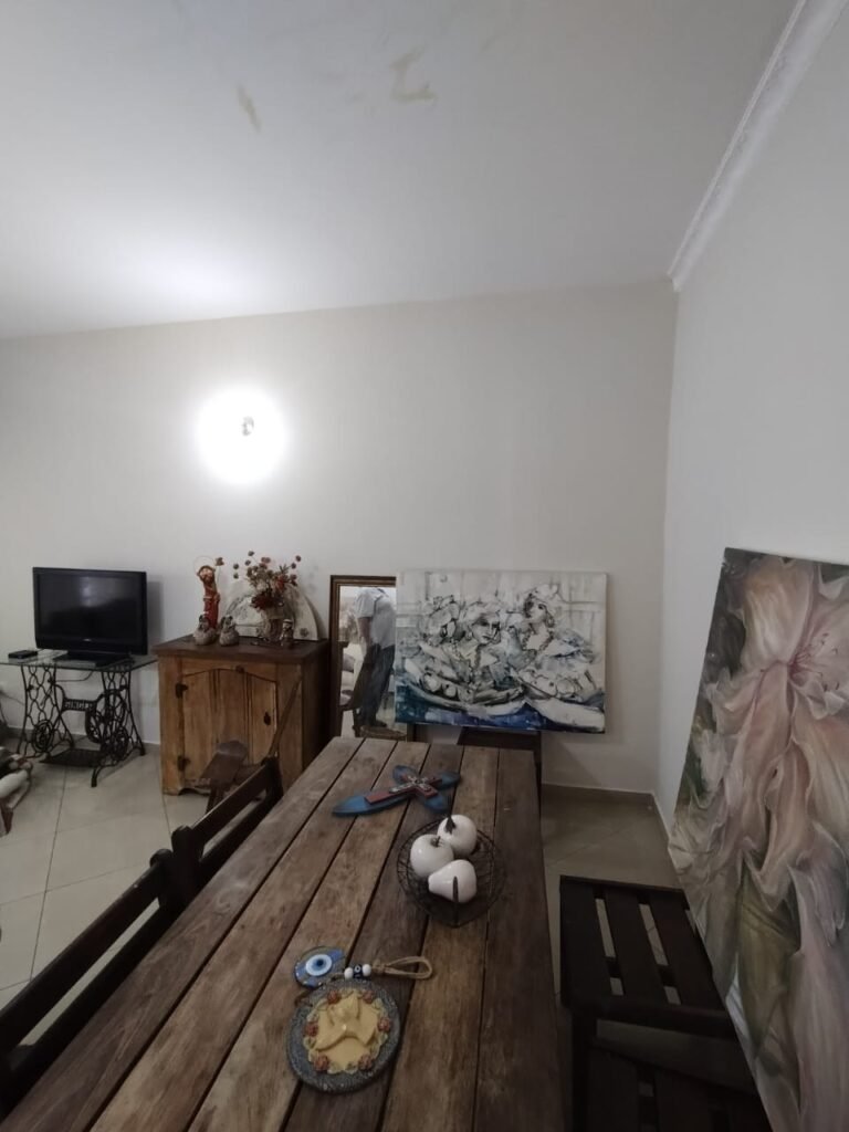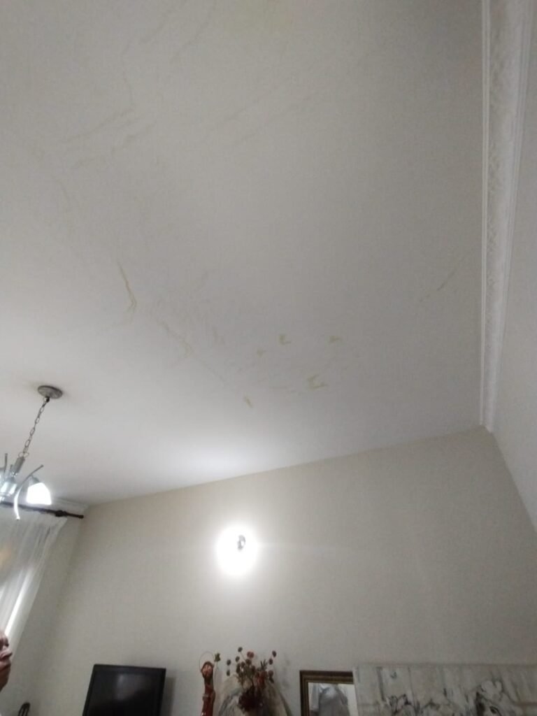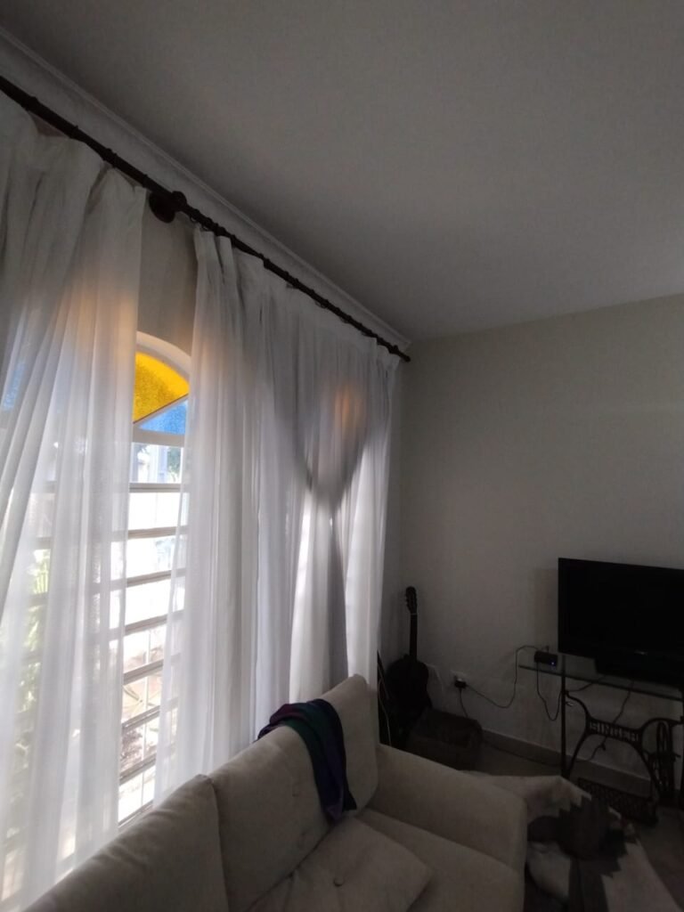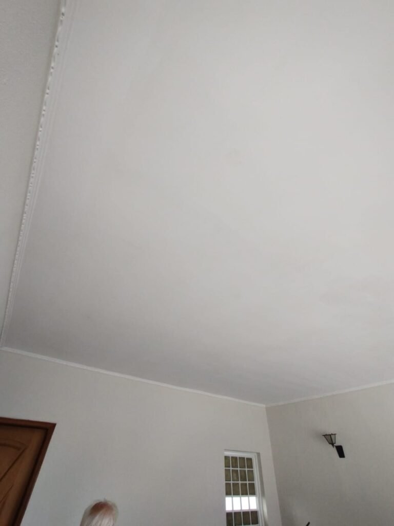 SALA 1:- Piso cerâmico porcelanato bege em ordem, rodapés em ordem, paredes com a pintura nova na cor branco em ordem, teto com a pintura na cor branco com desgaste natural, manchas de infiltração e restante em ordem, gola de gesso com a pintura na cor branco, com parte danificada e restante em ordem, soleira em mármore Travertino em ordem, porta de madeira com guarnição em ambos os lados em ordem, maçaneta e ordem, chaves em ordem, dobradiças em ordem, 01 varão de madeira em ordem, cortinas em tecido em ordem, 03 janelas de ferro em estilo colonial em ordem contendo 51 vidros transparentes em ordem, 06 vidros na cor azul em ordem, 06 vidros na cor amarelo em ordem, 03 parapeitos em granito Preto São Gabriel em ordem, 01 lustre clássico cromado contendo 03 lâmpadas de led em ordem, 02 spot cromados contendo duas lâmpadas de led em ordem, 01 interruptor duplo de luz em ordem, 02 interruptores de luz em ordem, 02 interruptor com saída para cabo em ordem, 05 espelhos com tomadas não testadas.