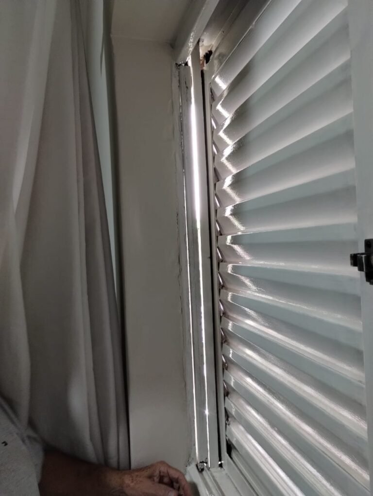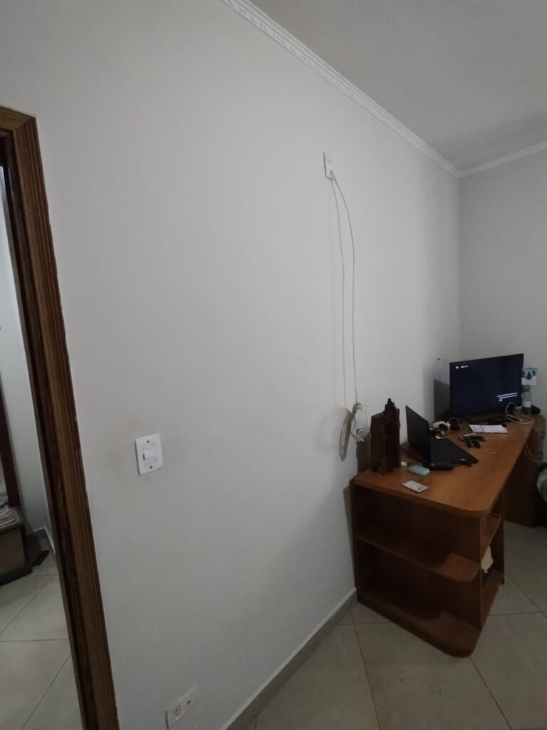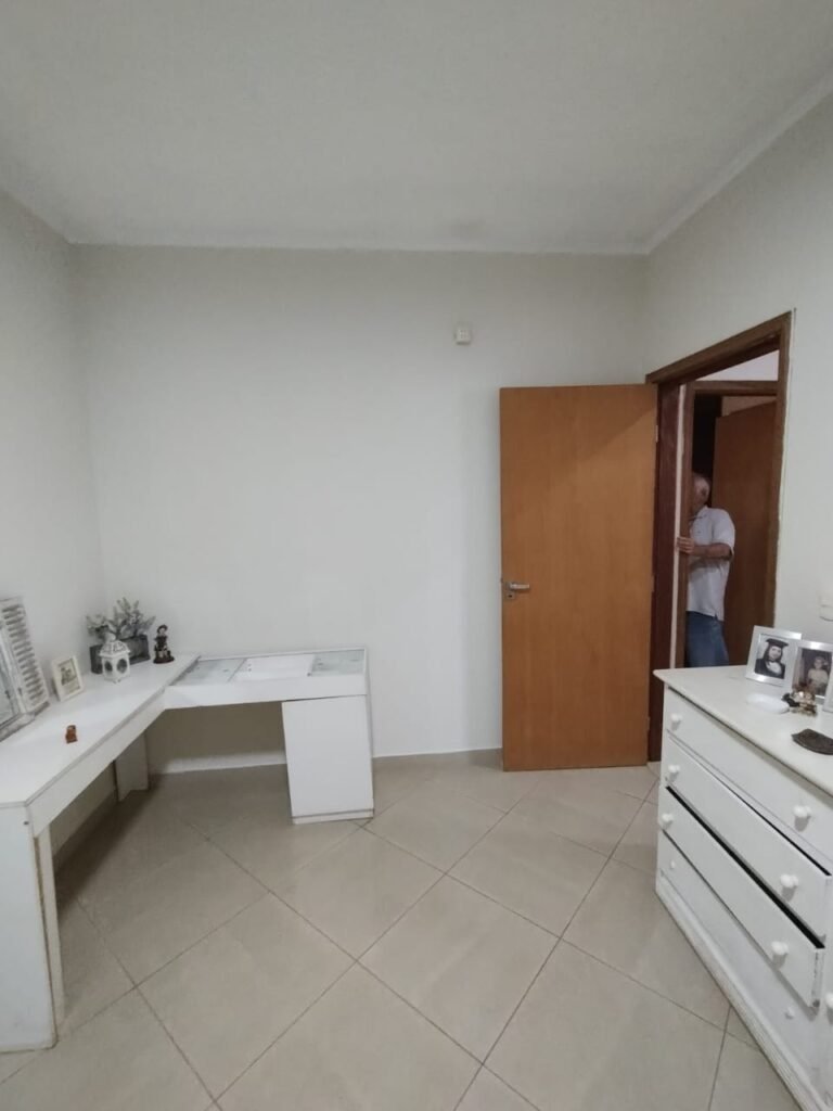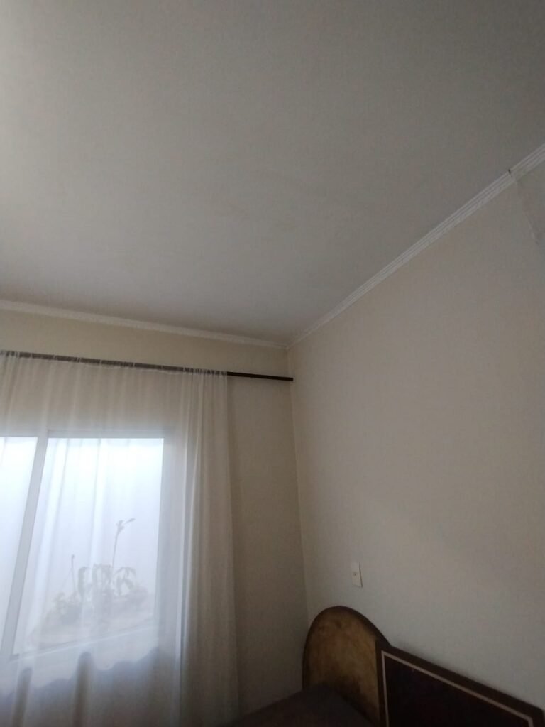 QUARTO 1:- Piso cerâmico porcelanato bege em ordem, rodapés em ordem, soleira em mármore Travertino em ordem, paredes com a pintura nova na cor branco em ordem, teto com a pintura na cor branco, gola de gesso com a pintura na cor branco em ordem, 01 porta de madeira em ordem, guarnição em ambos os lados em ordem, chave em ordem, dobradiça em ordem, 01 espelho na parede do quarto em ordem, janela veneziana de ferro com grade de correr em ordem, pintura na cor branco em ordem, uma trava solta a outra fixa o restante em ordem, trava que esta solta esta no parapeito da janela, 06 vidros incolor em ordem, 01 guarda roupas embutido em madeira em ordem, 12 portas em madeira com a pintura na cor branco em ordem, 12 puxadores, 30 dobradiças em ordem, 05 gavetas em ordem, 03 maleiros em ordem, 03 cabideiros em ordem, 06 prateleiras em madeira em ordem, 01 sapateira embutida com 06 divisórias fixas em ordem, 01 varão em madeira em ordem, 01 cortina em tecido em ordem, 02 interruptor em ordem, 02 tomada em ordem, 01 spot em ordem, 01 lâmpada de led em ordem.