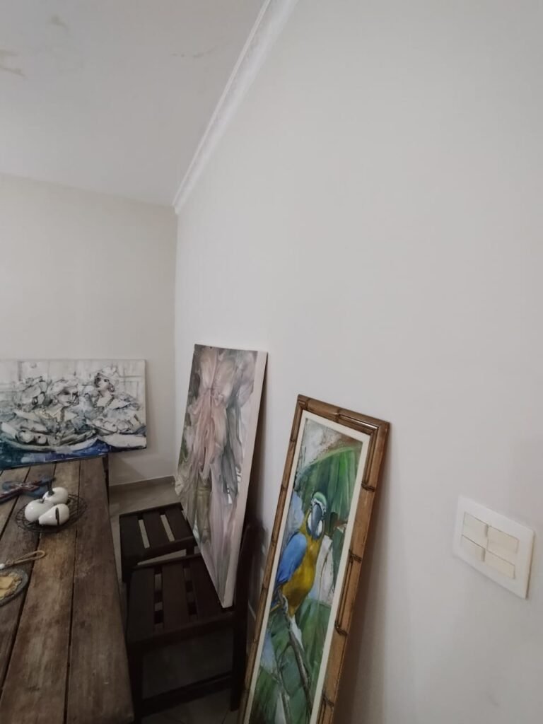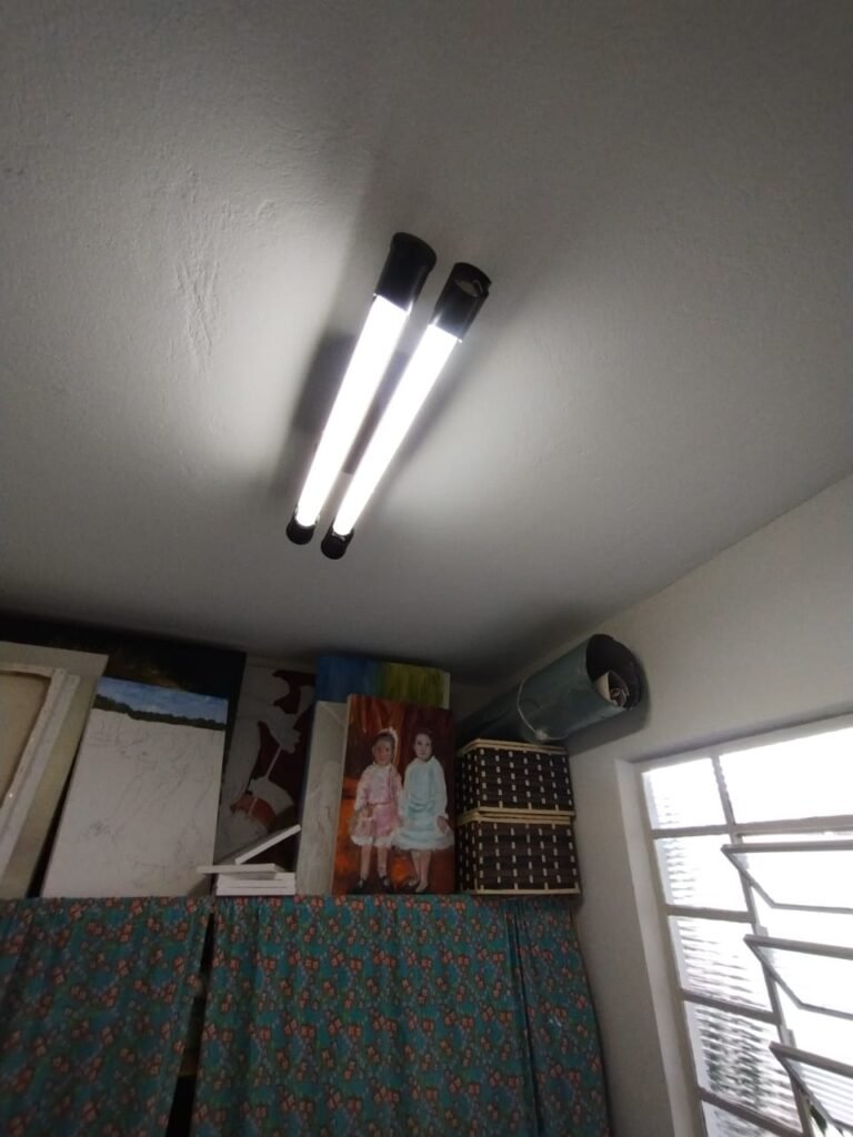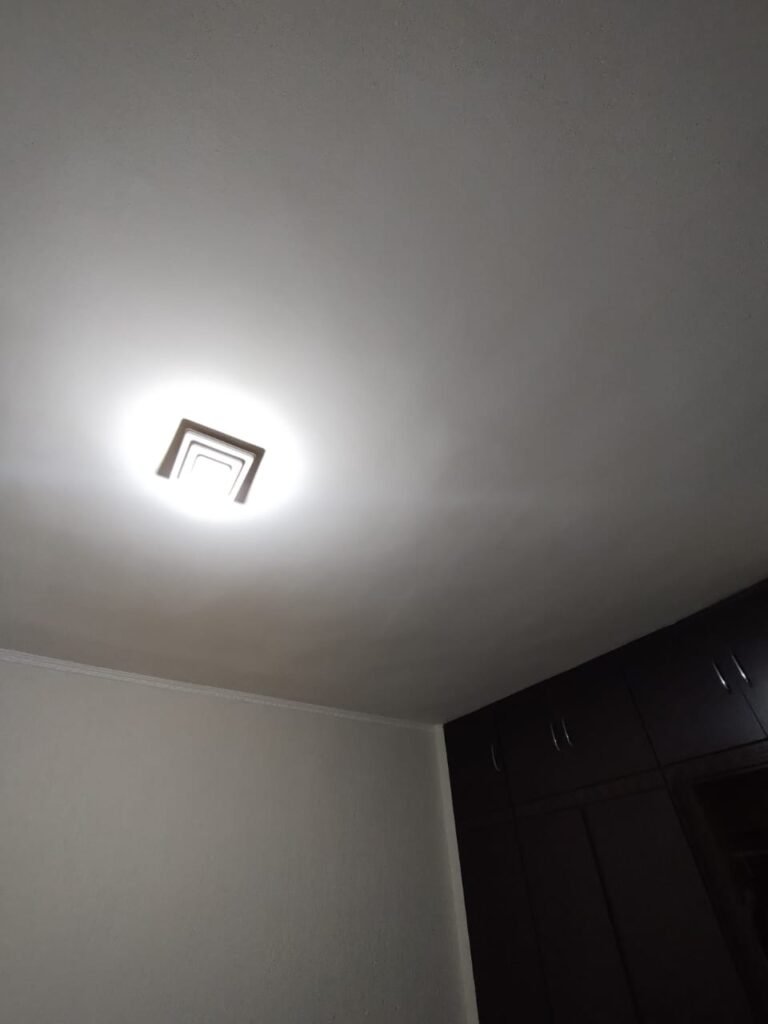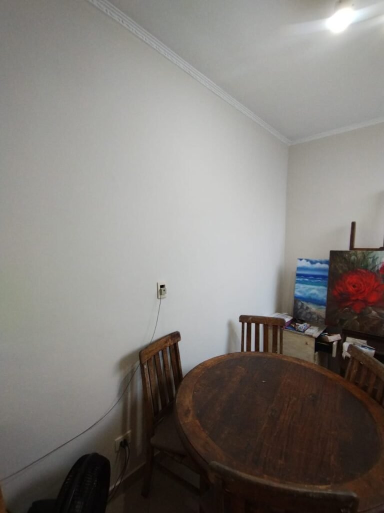 SALA 2:- Piso cerâmico porcelanato bege em ordem, rodapés em ordem, soleira em mármore Travertino em ordem, 01 porta de madeira em ordem, guarnição em ambos os lados em ordem, chaves em ordem, maçaneta em ordem, dobradiças em ordem, paredes com pintura nova na cor branca em ordem, teto com a pintura nova na cor branco, gola de gesso com a pintura na cor branco em ordem, 01 janela de ferro com a pintura na cor branco em ordem, puxador em ordem, contendo 15 vidros incolor em ordem, spot duplo com 01 lâmpadas de led e 01 lâmpada incandescente em ordem, 02 tomada de energia não testadas e aparentemente sem funcionamento, 01 interruptor de luz em ordem, 01 saída para cabo em ordem, 04 espelhos cego em ordem.