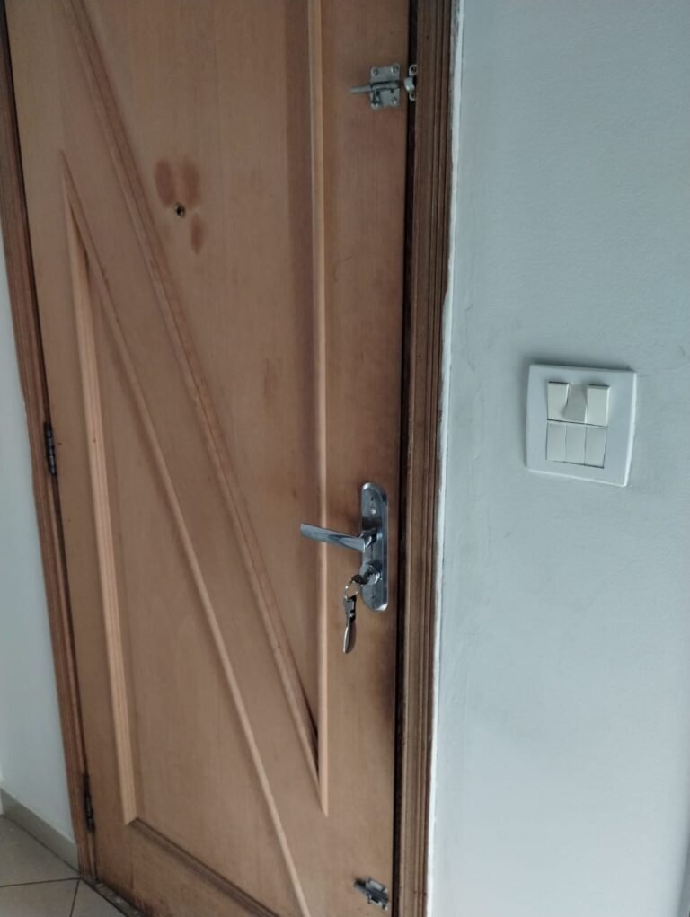 ENTRADA:- 01 porta de madeira com guarnição em ambos os lados, 01 chave tetra em ordem, 01 chave sem funcionamento e 01 buraco que está sem a fechadura, dobradiças em ordem, maçanetas em ordem, 02 travas internas sem funcionamento, soleira em mármore Travertino em ordem, piso em porcelanato bege em ordem.