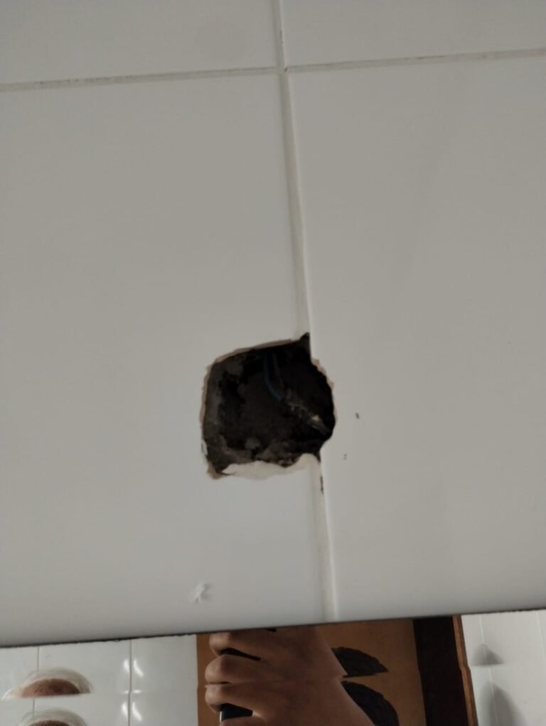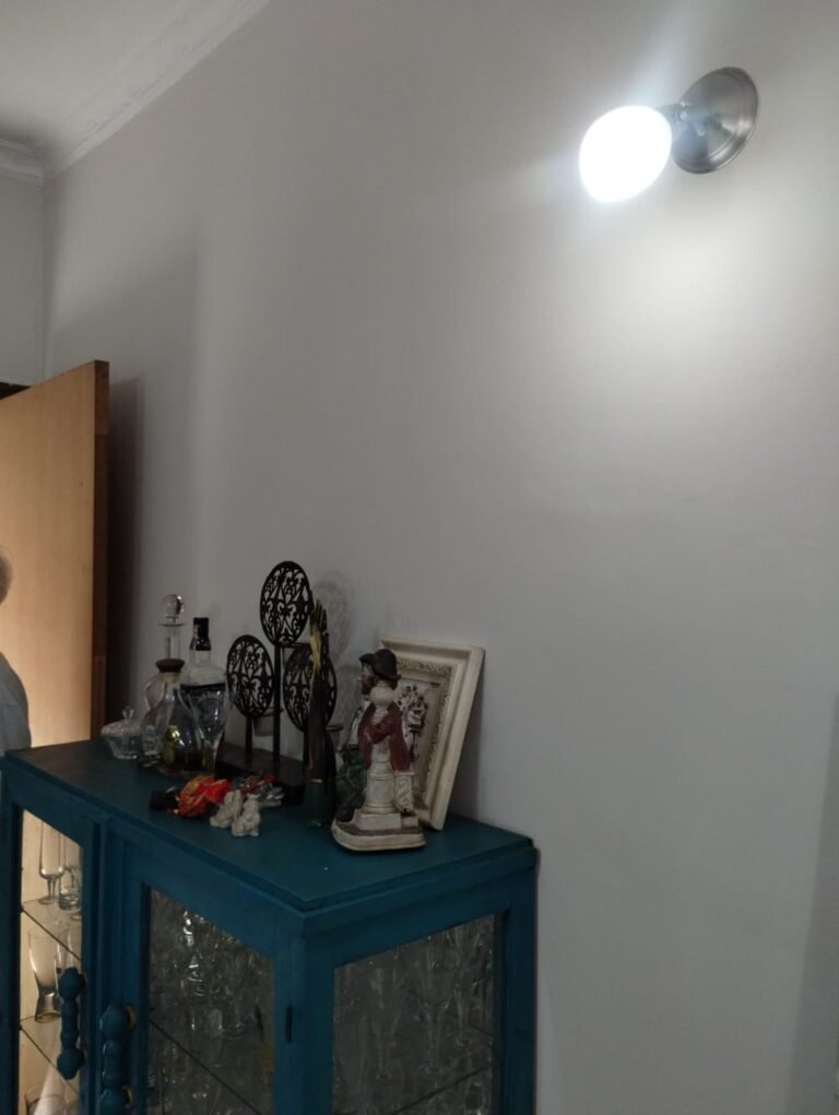 HALL:- 01 batente de madeira com guarnição em ambos os lados em ordem, piso porcelanato bege em ordem, rodapés em ordem, paredes com pintura nova na cor branco em ordem, teto com a pintura na cor branco em ordem, gola de gesso com a pintura na cor branco em ordem, 01 registro em ordem, 01 saída de água fechada em ordem, um spot sem lâmpada e restante em ordem, 01 tomada sem funcionamento, 01 espelho de luz, 01 espelho de luz com 01 interruptor e 01 tomada sem funcionamento, 01 espelho cego em ordem, 01janela de ferro com a pintura na cor branco contendo 10 vidros incolor em ordem, cabo TV em ordem, 01 alarme guardião sem funcionamento, 01 central de alarmes marca Guardião sem funcionamento.