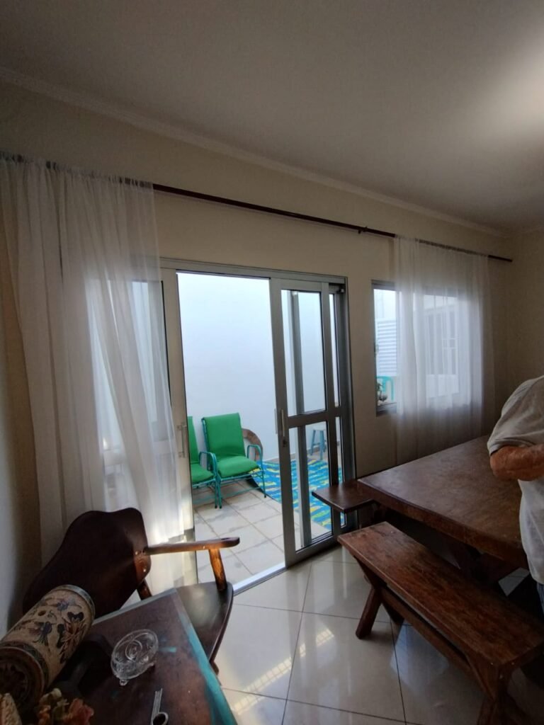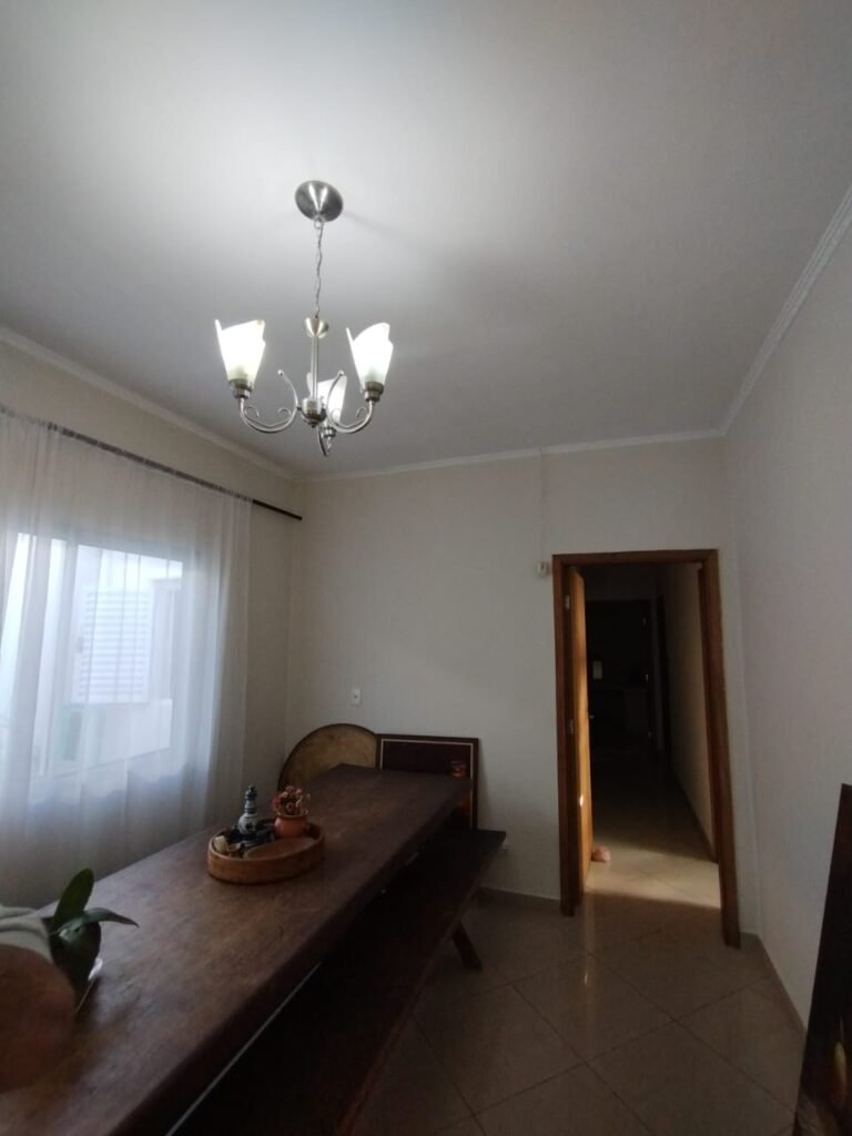 SALA DE JANTAR:- Piso cerâmico porcelanato bege em ordem, rodapés em ordem, 01 porta balcão de correr em alumínio escovado em ordem, contendo 08 folhas de vidro incolor em ordem, chaves em ordem, 01 janela em alumínio escovado de correr em ordem, contendo 02 folhas com vidro de correr em ordem, 02 puxadores em ordem, paredes com a pintura nova na cor branca em ordem, teto com a pintura na cor branco em ordem, gola de gesso com a pintura na cor branco em ordem, 01 lustre clássico cromado contendo 03 luminárias, sendo que, 01 delas está danificada, e 02 lâmpadas de led em ordem, 01 varão de madeira em ordem, cortinas em tecido em ordem, 01 interruptor de luz em ordem, 01 interruptor com saída para cabo em ordem, 02 espelhos em ordem.