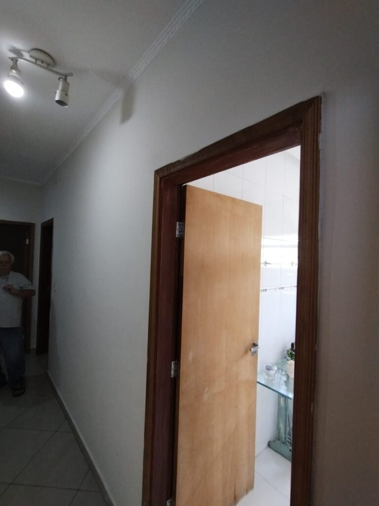 BANHEIRO SOCIAL:- Piso cerâmico na cor branco em ordem, soleira em mármore Travertino em ordem, porta de madeira em ordem, guarnição em ambos os lados em ordem, maçaneta em ordem, chave em ordem, dobradiças em ordem, paredes com azulejos branco ate o teto em ordem, filete de faixas em auto relevo em todo banheiro em ordem, teto com sanca de gesso com a pintura na cor branco em ordem, 05 luminárias de embutir, sendo que apenas 04 estão em ordem, 01 pia em mármore Travertino com frontão em mármore Travertino em ordem, 01 cuba sobrepor porcelana branca marca Incepa em ordem, 01 torneira para lavatório de bica alta em ordem, 01 sifão desentupido em ordem, válvula em ordem, 01 espelho bisotê retangular em ordem, 01 gabinete embutido em madeira com a pintura na cor branco em ordem, 04 gavetas em madeira com a pintura na cor branco, sendo que 01 delas está sem o fundo, restante em ordem, 04 puxadores em ordem, 02 portas em madeira com a pintura na cor branco em ordem, 02 puxadores em ordem, 04 dobradiças oxidadas o restante em ordem, 01 gaveteiro para roupas de correr com as 02 corrediças oxidadas o restante em ordem, 01 prateleira em madeira com a pintura na cor branco ordem, 01 vaso sanitário porcelana branca Marca Incepa em ordem, tampa do vaso em ordem, 01 acabamento para válvula de descarga marca Hydra em ordem, descarga quando acionada vasa água entre a base do vaso e o azulejo o restante em ordem, 01 ducha higiênica em ordem, 01 Box com acabamento branco, vidros Blindex incolor contendo 03 portas sendo duas portas fixas e uma porta de correr com puxador em ordem, 02 prateleiras em vidro blindex incolor de quina em ordem, 01 porta sabonete em inox em ordem, 01 porta papel higiênico em inox em ordem, 03 porta toalhas em inox em ordem, 01 chuveiro Lorenzetti Top Jet quebrado, 01 chuveirinho em ordem, 01 ralo de inox desentupido, 01 janela em alumínio escovado com grades em ordem, pintura na cor branco em ordem, trava em ordem, cantoneiras em alumínio entorno da janela. Em ordem, 14 vidros Jateados em ordem, 01 interruptor de luz e energia em ordem, 01 espelho em ordem, 01 registro de chuveiro com acabamento em ordem, 01 registro com acabamento em ordem.