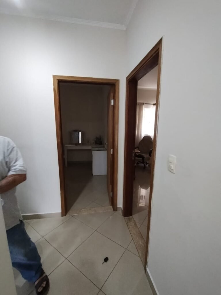 CORREDOR:- Piso cerâmico em porcelanato bege em ordem, rodapés em ordem, paredes com a pintura nova na cor branco em ordem, teto com a pintura na cor branco em ordem, gola de gesso com a pintura na cor branco em ordem, porta de madeira em ordem, guarnição em ambos os lados em ordem, maçaneta em ordem, chave em ordem, dobradiças em ordem, 01 spot de sobrepor em alumínio contendo 01 lâmpadas de led em ordem, 01 quadro força com 02 tampas sendo 01 encaixada e a outra esta quebrada, 14 disjuntores em ordem.
