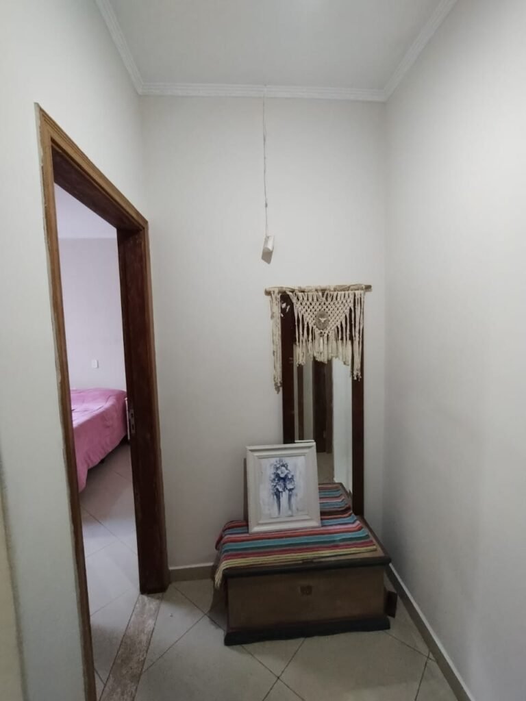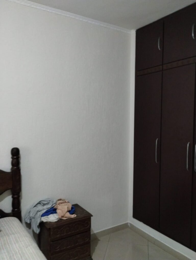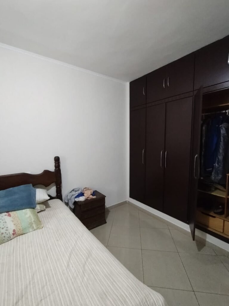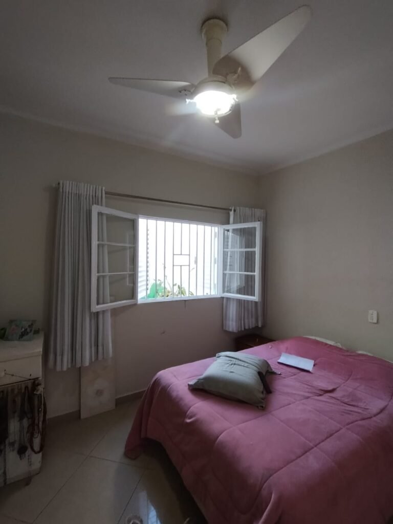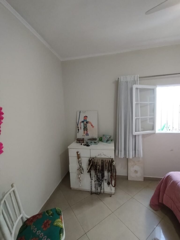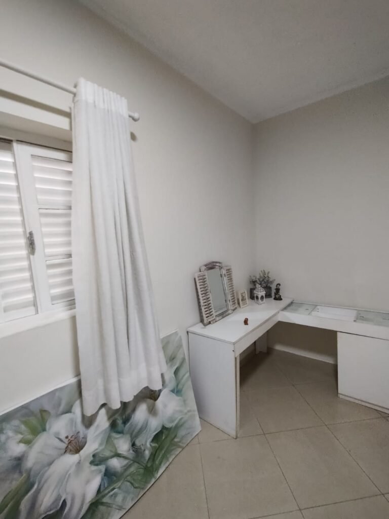 QUARTO 2:- Piso cerâmico porcelanato bege em ordem, rodapés em ordem, soleira em mármore Travertino em ordem, paredes com a pintura nova na cor branco em ordem, teto com a pintura na cor branco, gola de gesso com a pintura na cor branco em ordem, 01 porta de madeira em ordem, guarnição em ambos os lados em ordem, chave em ordem, dobradiça em ordem, 01 veneziana com grades em ordem, 02 folhas de vidro contendo 06 vidros incolor em ordem, 02 folhas de abrir em abrir em ordem, 01 ventilador de teto sem o lustre, e restante em ordem, 01 lâmpada de led em ordem, um guarda roupas embutido em madeira em ordem, 12 portas de madeiras com a pintura na cor branco em ordem, 30 dobradiças em ordem, 12 puxadores em ordem, 05 prateleiras em ordem, 05 gavetas em madeira em ordem, 02 cabideiros em ordem, 03 maleiros em ordem, 01sapateira fixa em ordem, 06 prateleiras fixa em ordem, 02 base do armário estão lascadas o restante em ordem, 01 varão de maneira em ordem, 01 cortina em tecido em ordem.