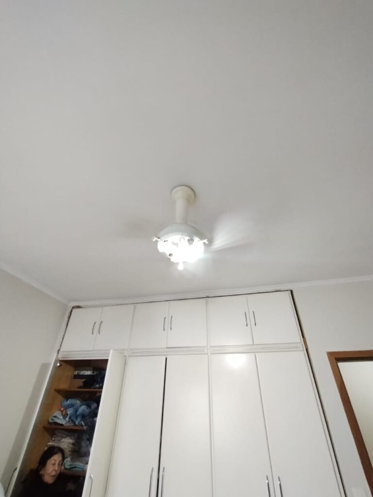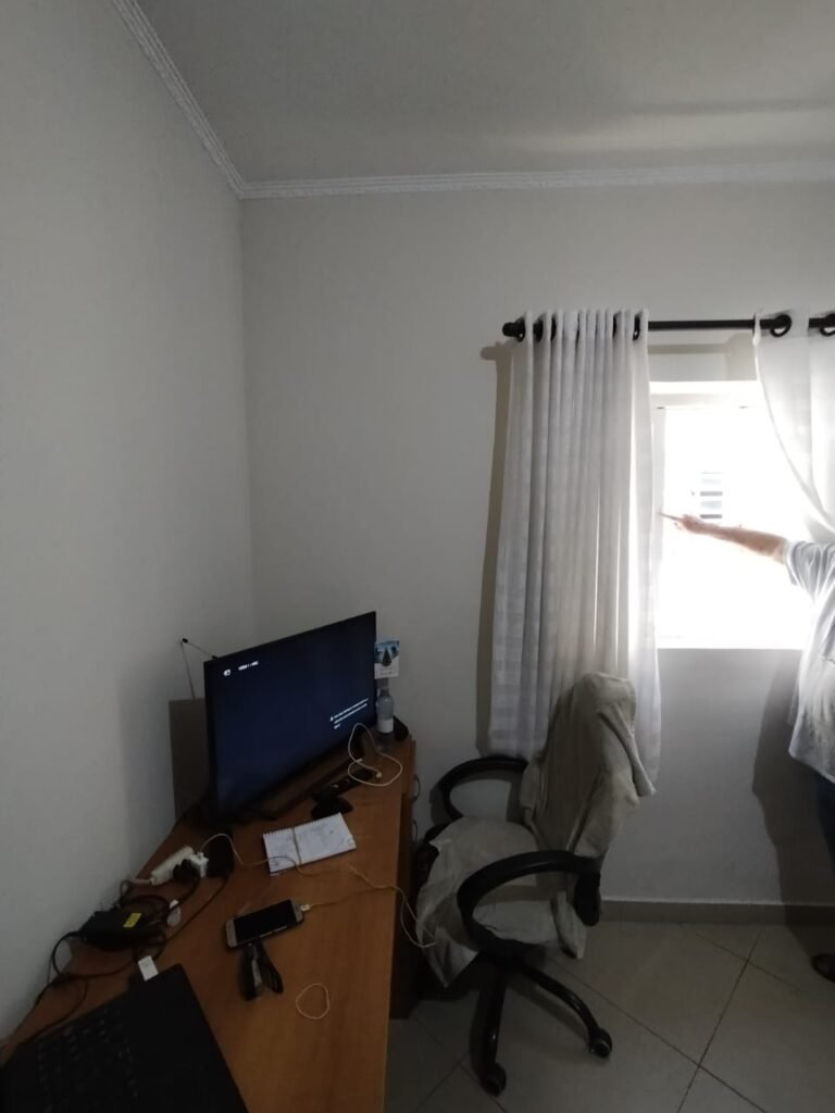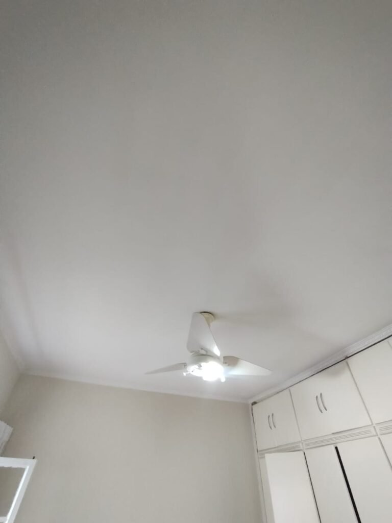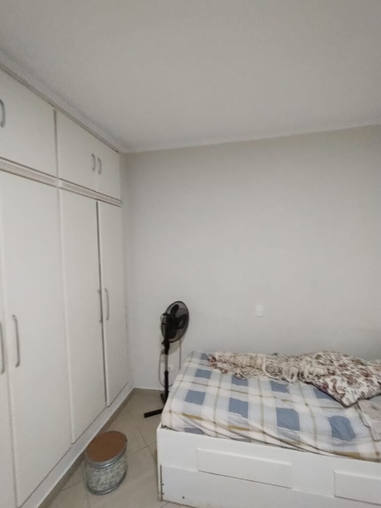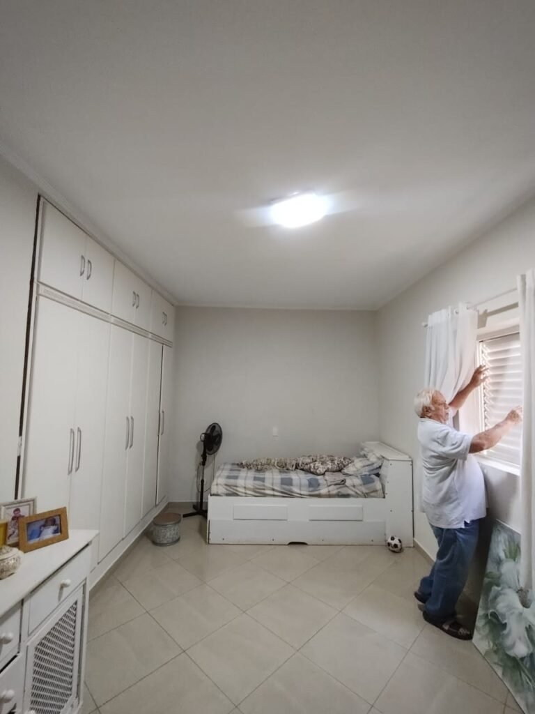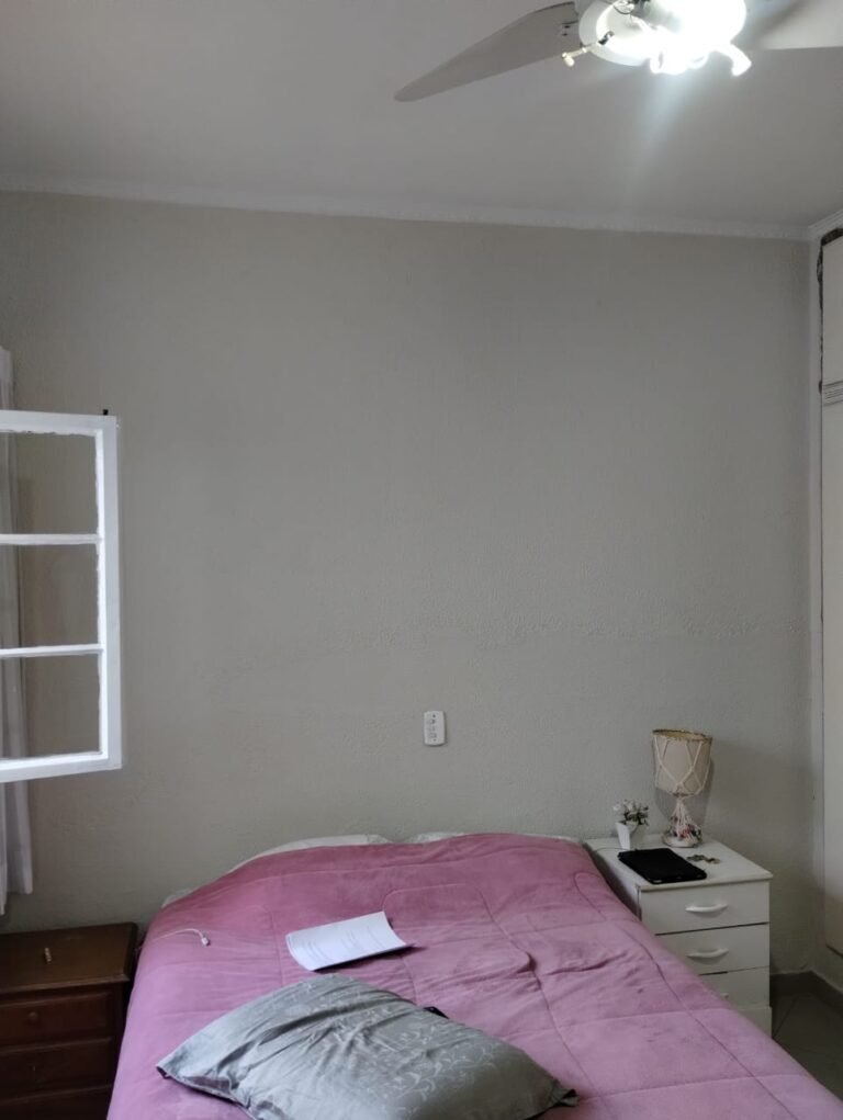 QUARTO 2:- Piso cerâmico porcelanato bege em ordem, rodapés em ordem, soleira em mármore Travertino em ordem, paredes com a pintura nova na cor branco em ordem, teto com a pintura na cor branco, gola de gesso com a pintura na cor branco em ordem, 01 porta de madeira em ordem, guarnição em ambos os lados em ordem, chave em ordem, dobradiça em ordem, 01 veneziana com grades em ordem, 02 folhas de vidro contendo 06 vidros incolor em ordem, 02 folhas de abrir em abrir em ordem, 01 ventilador de teto sem o lustre, e restante em ordem, 01 lâmpada de led em ordem, um guarda roupas embutido em madeira em ordem, 12 portas de madeiras com a pintura na cor branco em ordem, 30 dobradiças em ordem, 12 puxadores em ordem, 05 prateleiras em ordem, 05 gavetas em madeira em ordem, 02 cabideiros em ordem, 03 maleiros em ordem, 01sapateira fixa em ordem, 06 prateleiras fixa em ordem, 02 base do armário estão lascadas o restante em ordem, 01 varão de maneira em ordem, 01 cortina em tecido em ordem.