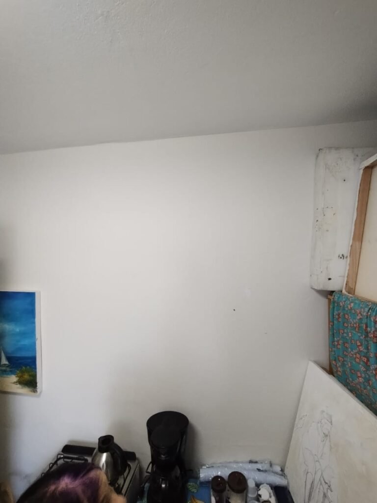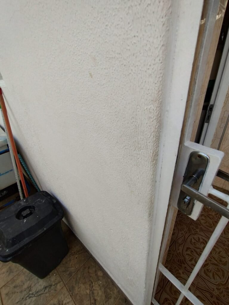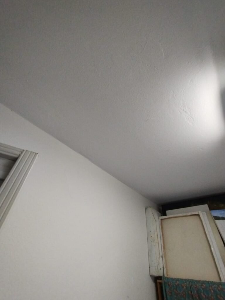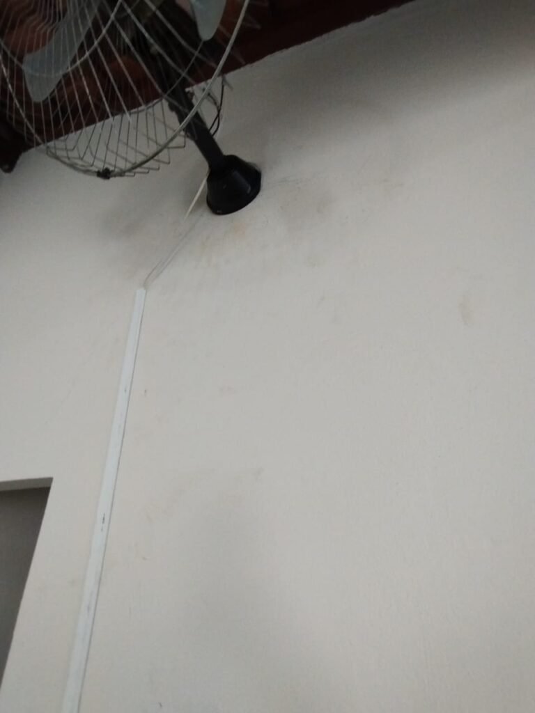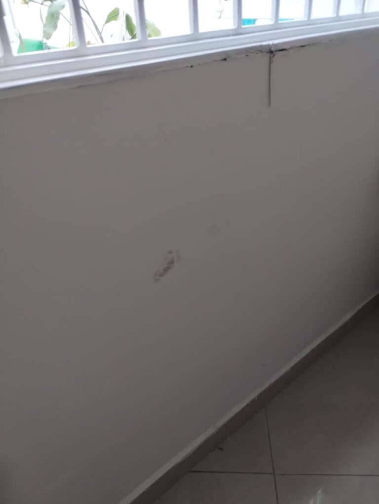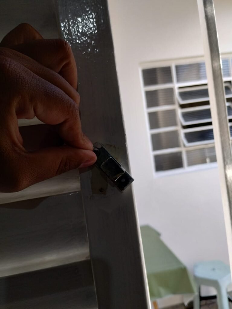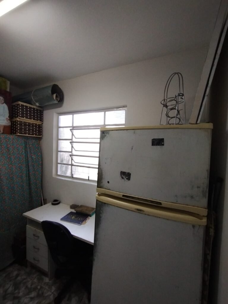 QUARTO DA EDÍCULA:- Piso cerâmico mesclado antiderrapante em ordem, rodapés em ordem, 01 soleira em mármore preto são Gabriel em ordem, 01 porta de ferro em ordem, maçaneta quebrada, dobradiças em ordem, paredes com a pintura na cor branco com manchas de tinta e marcas de infiltração o restante em ordem, teto com a pintura na cor branco em ordem, 01 armário de madeira sem os pés o restante em ordem, contendo com 03 gavetas, 03 puxadores, 08 prateleiras em ordem, 01 luminária tubular contendo 02 lâmpadas fluorescente em ordem, 01 janela de ferro contendo 15 vidros incolor em ordem, 01 puxador em ordem, 01 interruptor de luz em ordem, 01 tomada em ordem, 03 espelhos em ordem.
