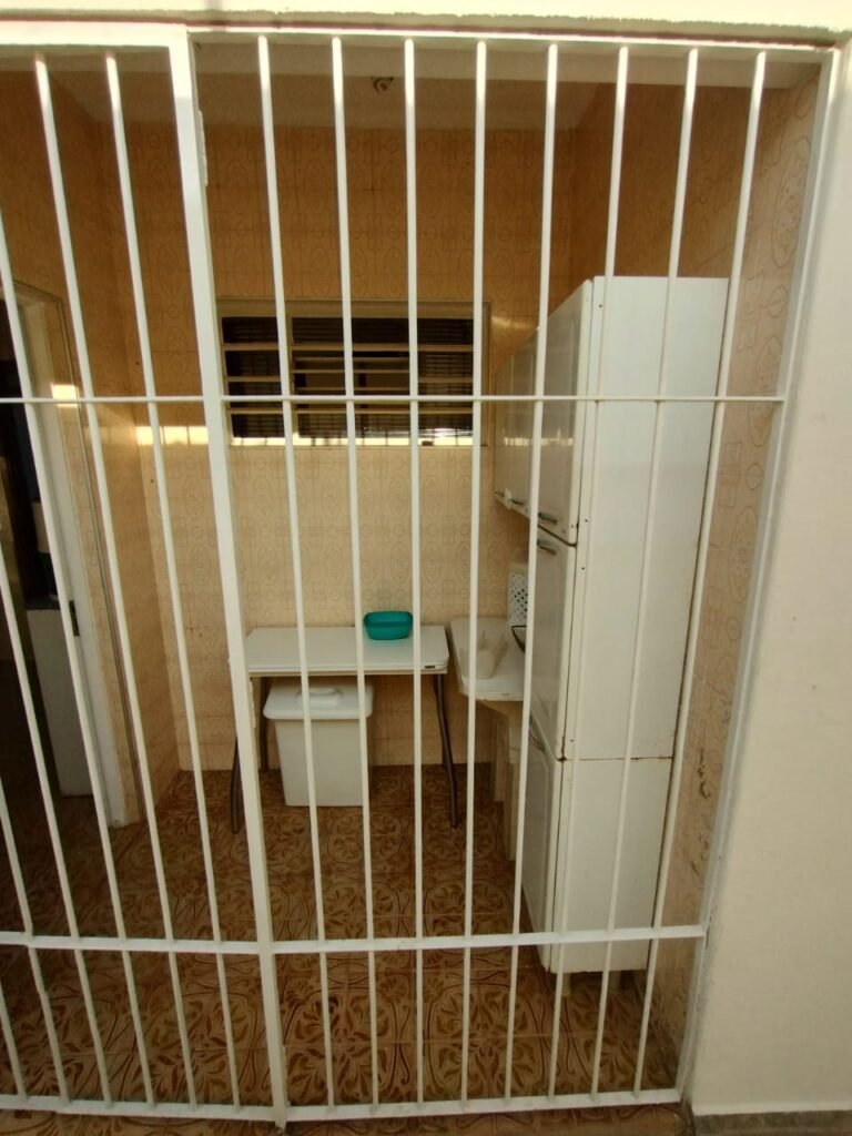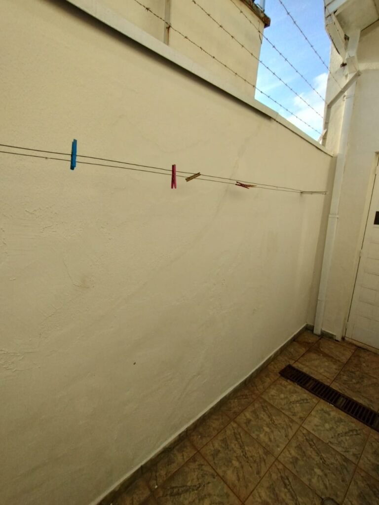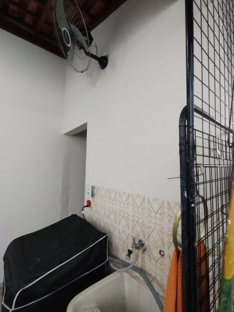 LAVANDERIA:- Piso cerâmico mesclado com desgaste natural do tempo o restante em ordem, paredes com azulejos mesclados ate o teto em ordem, 01 tanque desentupido em cimento com sua base e o seu interior com revestimento cerâmico em ordem, uma saída de agua em ordem, 01 porta de ferro com grades com a pintura na cor branco, maçaneta em ordem, chave em ordem, 01 spot com 01 lâmpada de led em ordem.