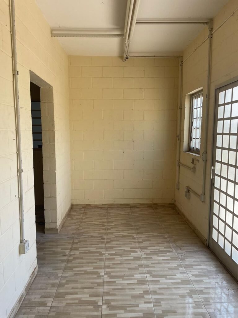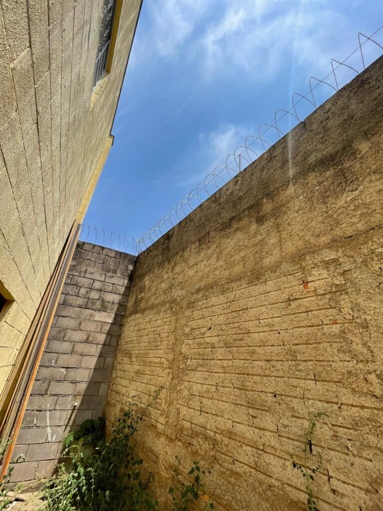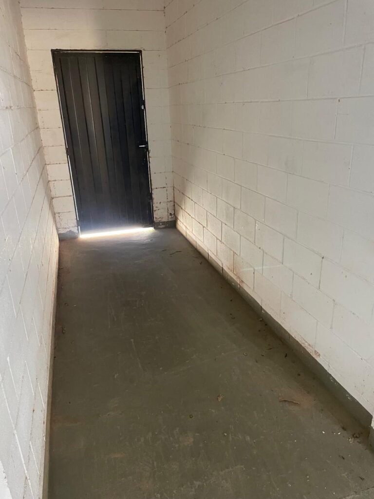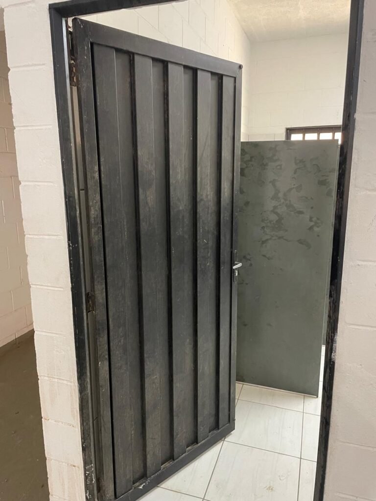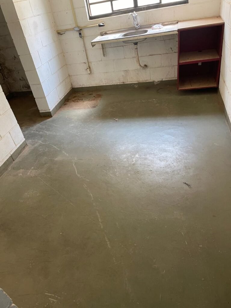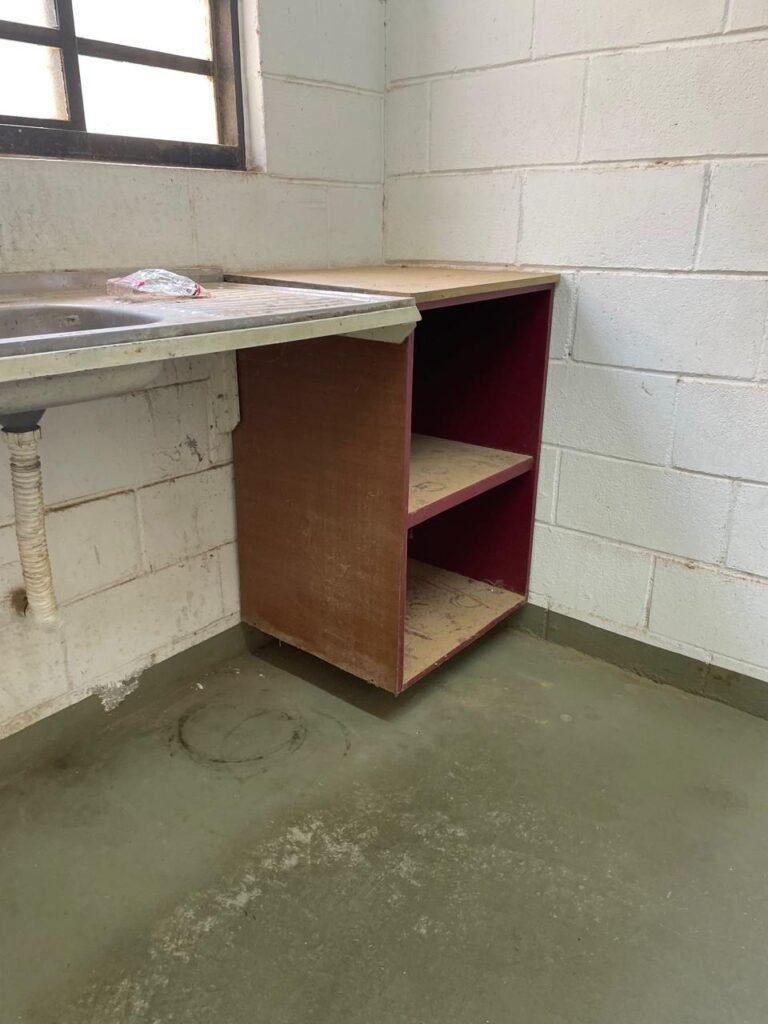 FUNDOS:- muro de bloco chapiscado, piso concreto polido, 01 porta de chapa dobrada de ferro cor preto em ordem, fechadura e chave em ordem, 01 ralo sem tampa, 01 caixa de gordura ok, 01 ponto de água e esgoto ok, cercas serpentinas em ordem