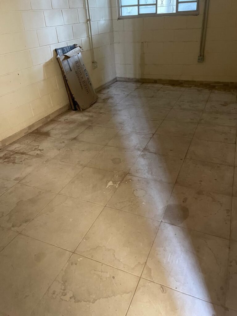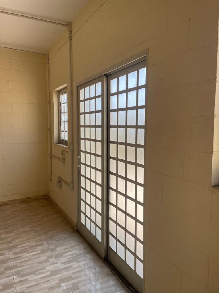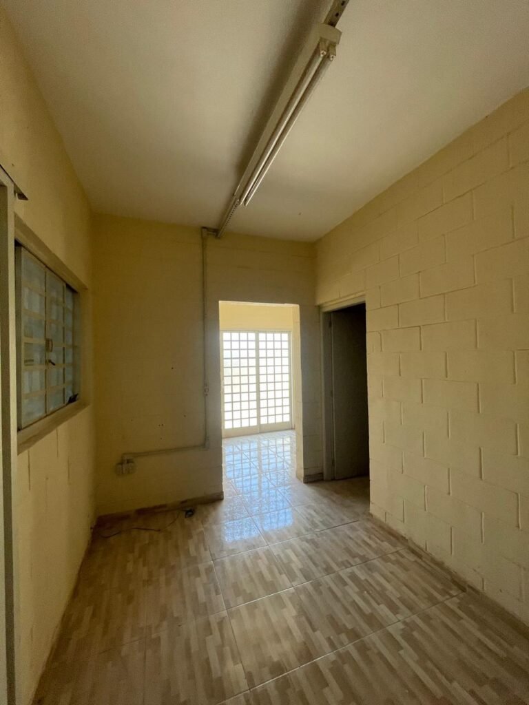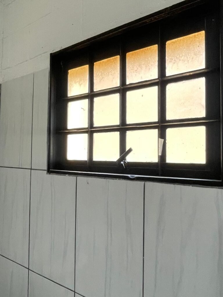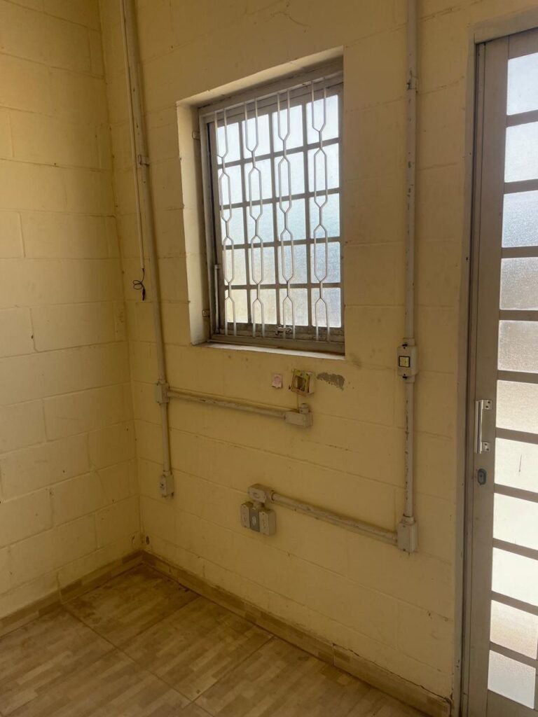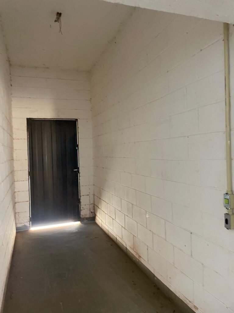 FUNDOS:- muro de bloco chapiscado, piso concreto polido, 01 porta de chapa dobrada de ferro cor preto em ordem, fechadura e chave em ordem, 01 ralo sem tampa, 01 caixa de gordura ok, 01 ponto de água e esgoto ok, cercas serpentinas em ordem