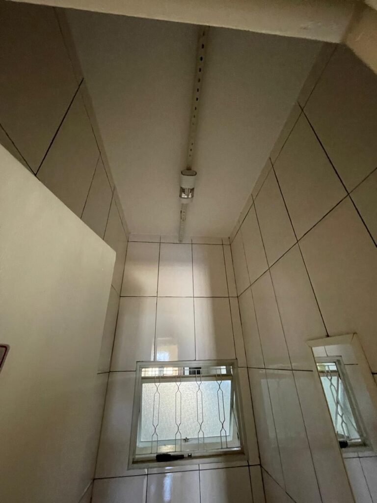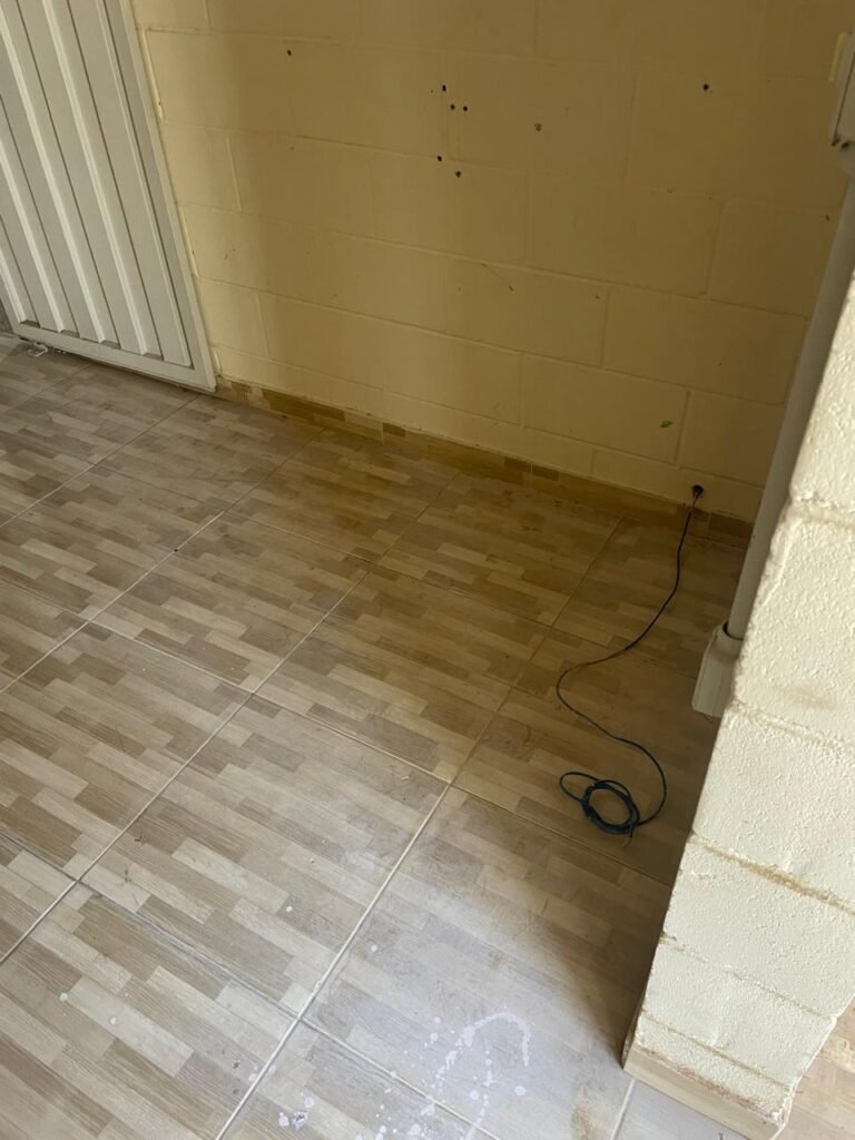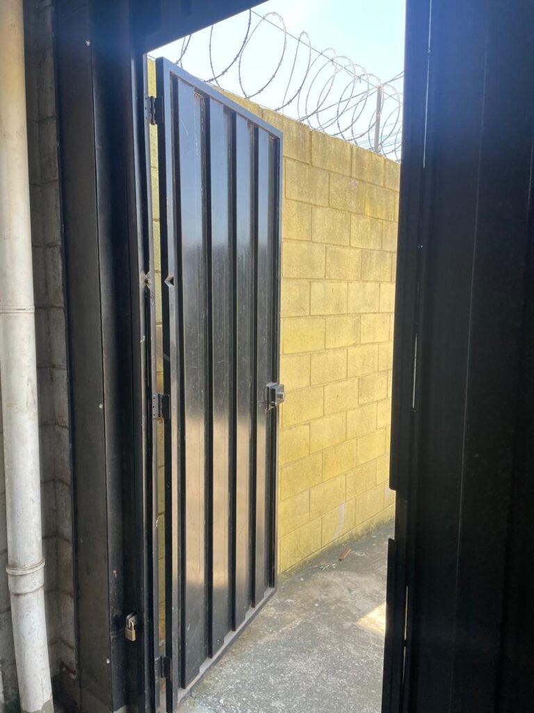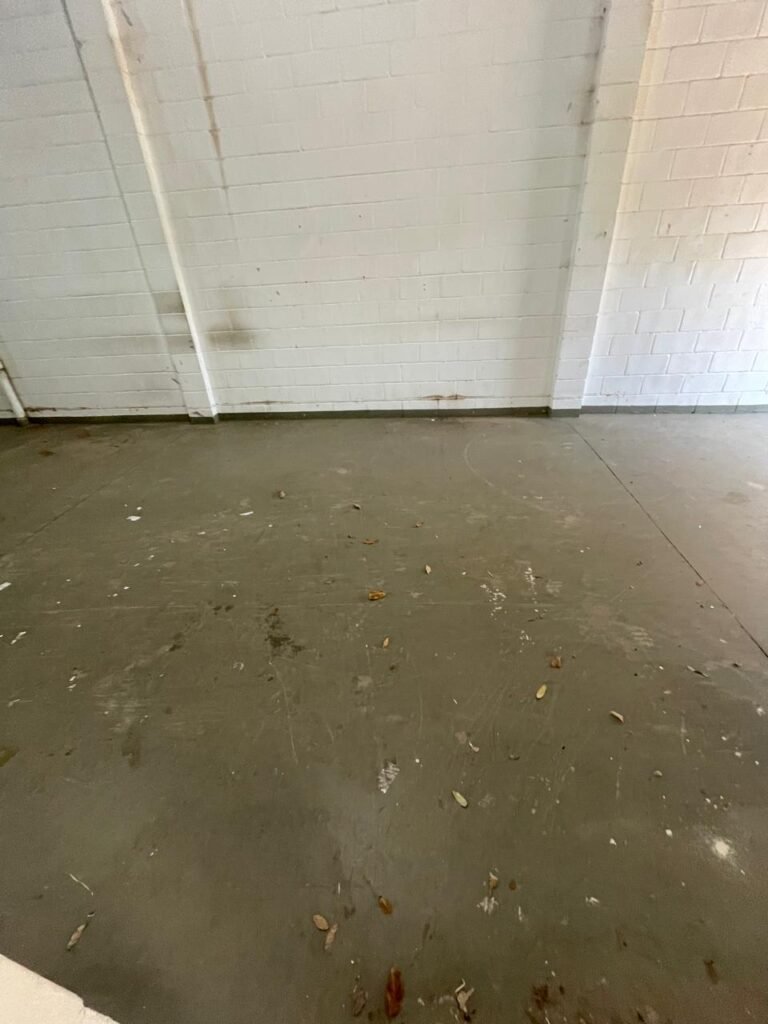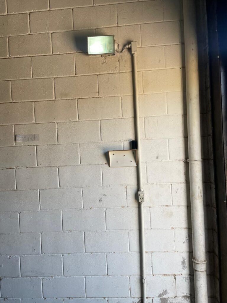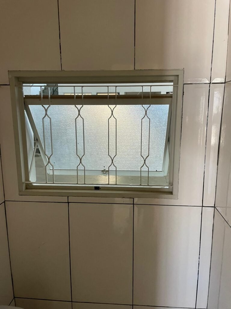 FUNDOS:- muro de bloco chapiscado, piso concreto polido, 01 porta de chapa dobrada de ferro cor preto em ordem, fechadura e chave em ordem, 01 ralo sem tampa, 01 caixa de gordura ok, 01 ponto de água e esgoto ok, cercas serpentinas em ordem