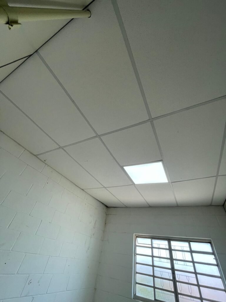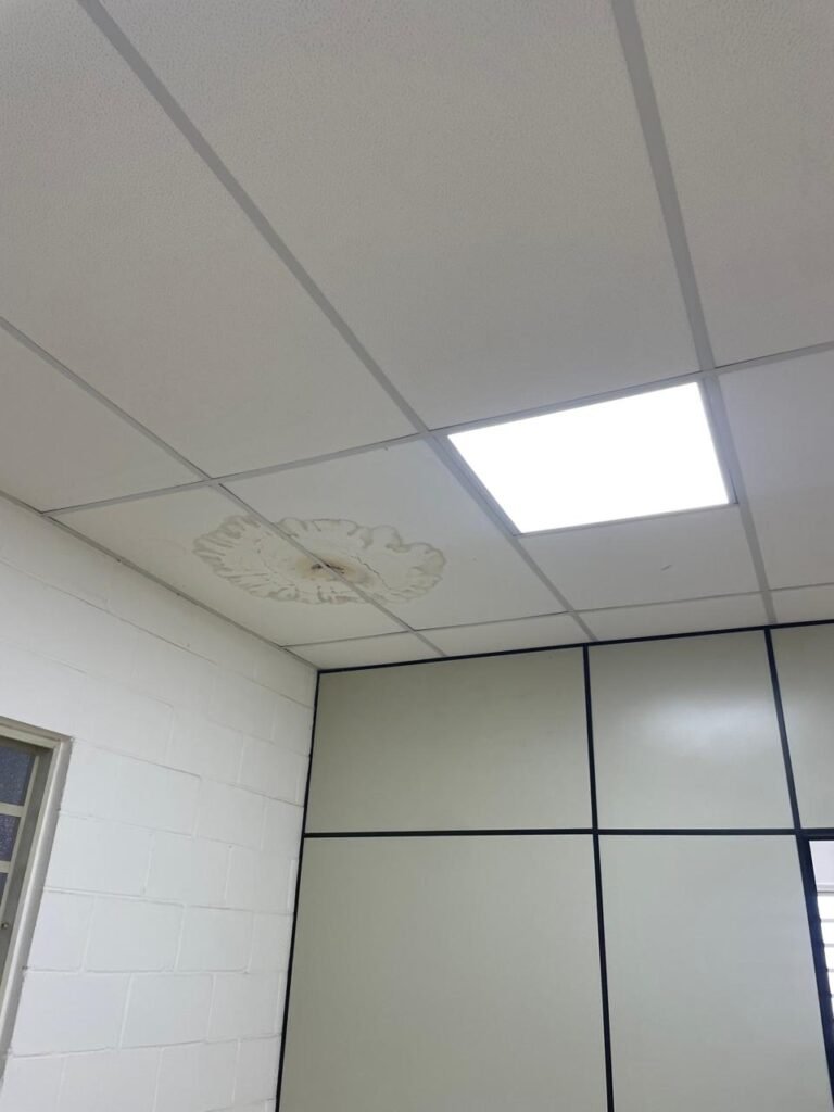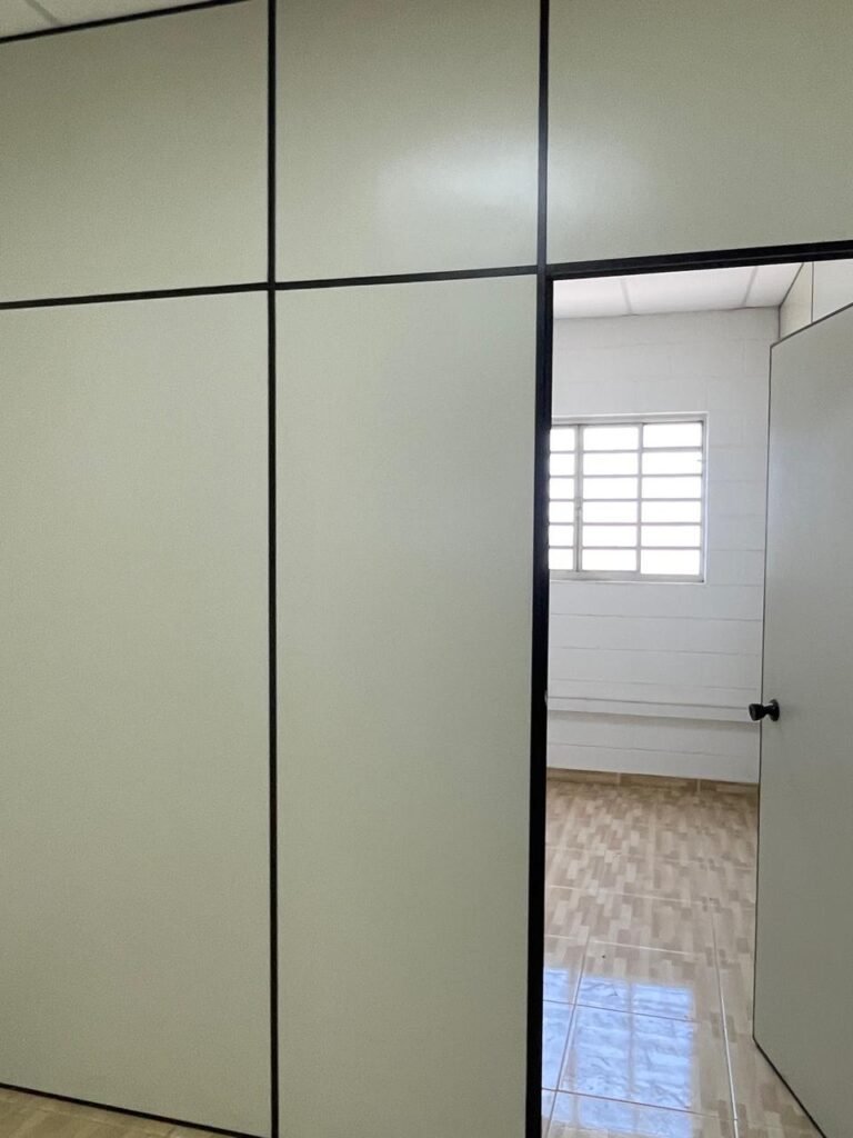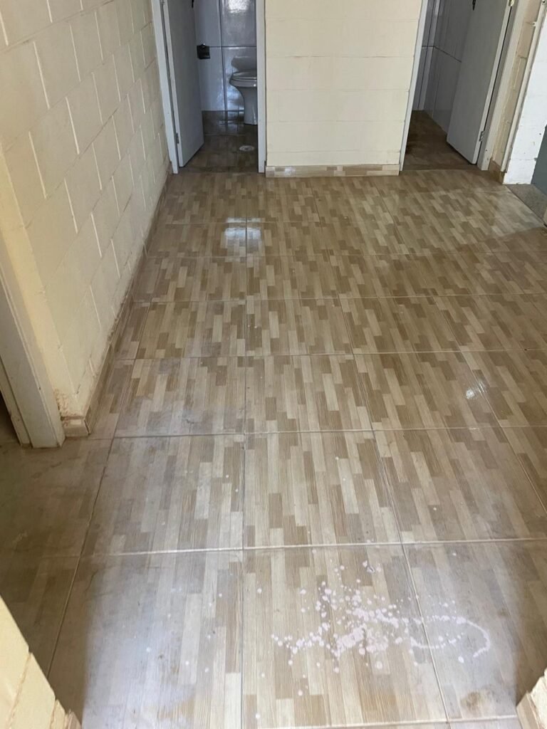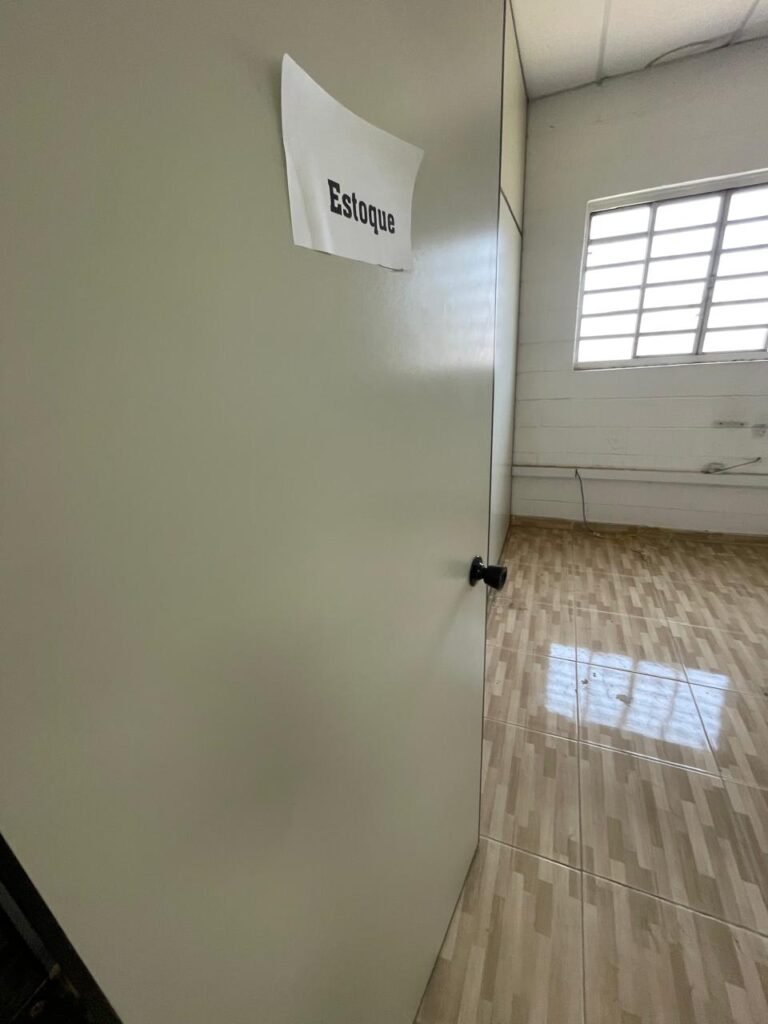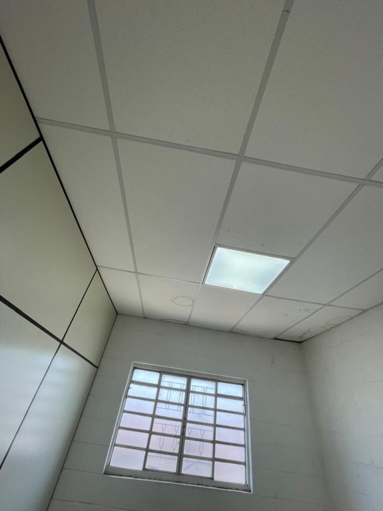 ADMINISTRATIVO 1º ANDAR/SALA:- 01 porta de madeira com pintura na cor branco com desgastes naturais, maçanetas e fechadura em inox, marca Stam em ordem, piso e rodapés revestido de pisos frio cerâmicos na cor bege em ordem, parede de blocos aparente com pintura na cor branco neve com desgastes naturais, com manchas e descasques pela extensão, 04 janelas deslizantes com 24 vidros e 01 fechadura em ordem em cada, divisórias navais em ordem com 02 portas sociais com maçaneta e fechadura embutida em ordem, conduítes externos contendo 06 tomadas, 04 interruptores, fiações aparente, forro de gesso na cor branco com partes com infiltrações e danificadas, 06 luminárias plafon embutidas com LED em ordem.