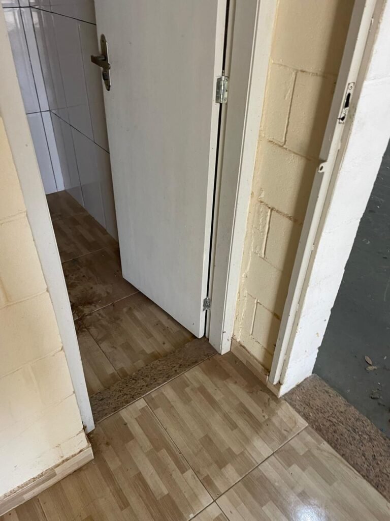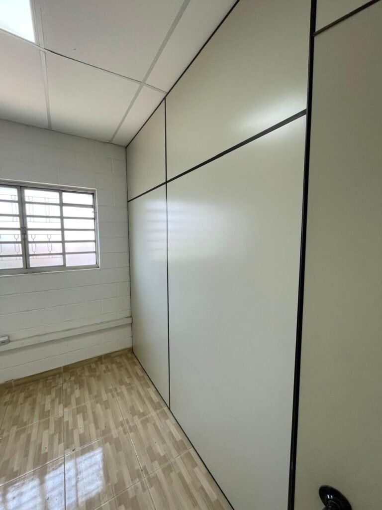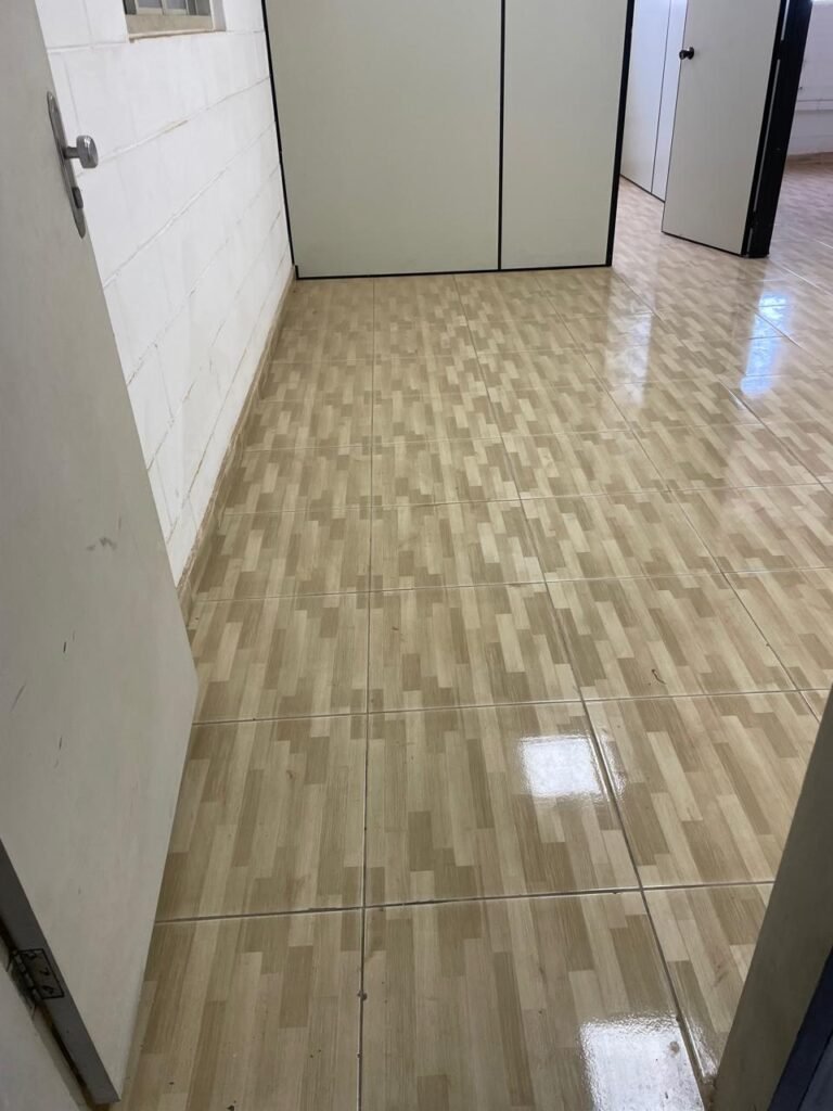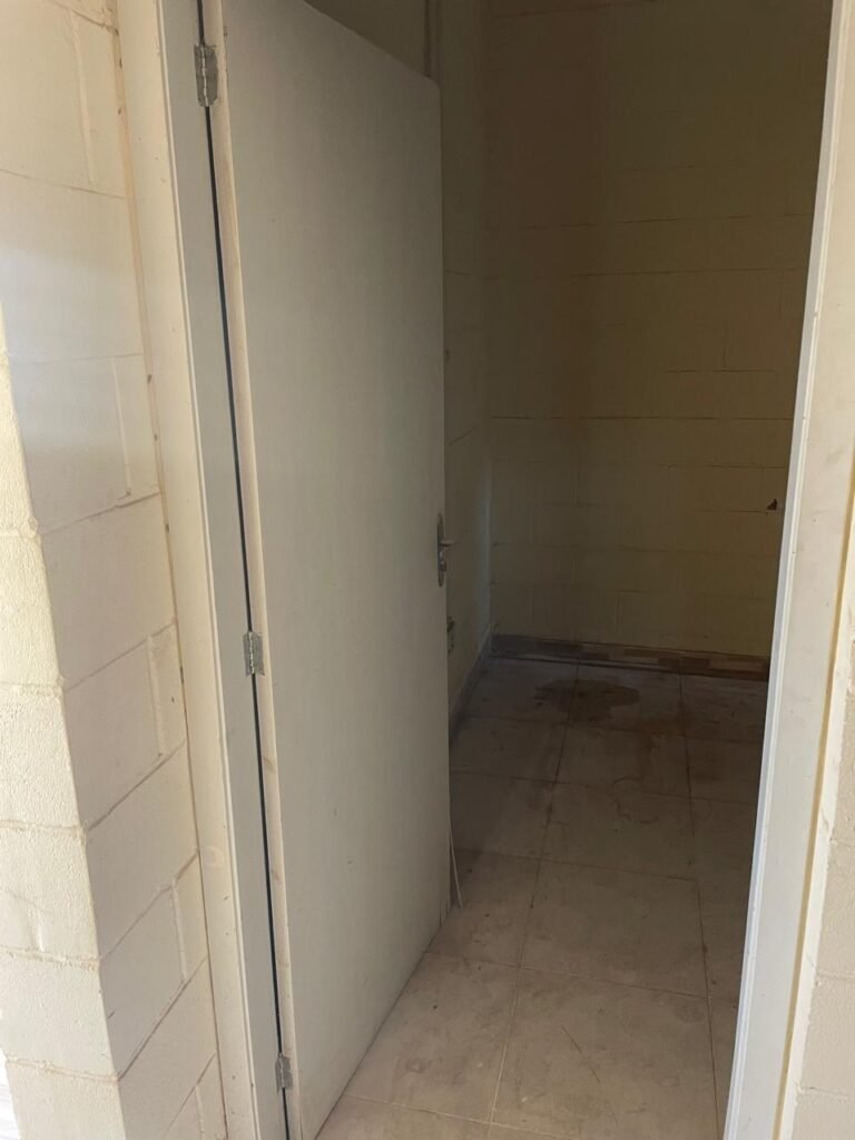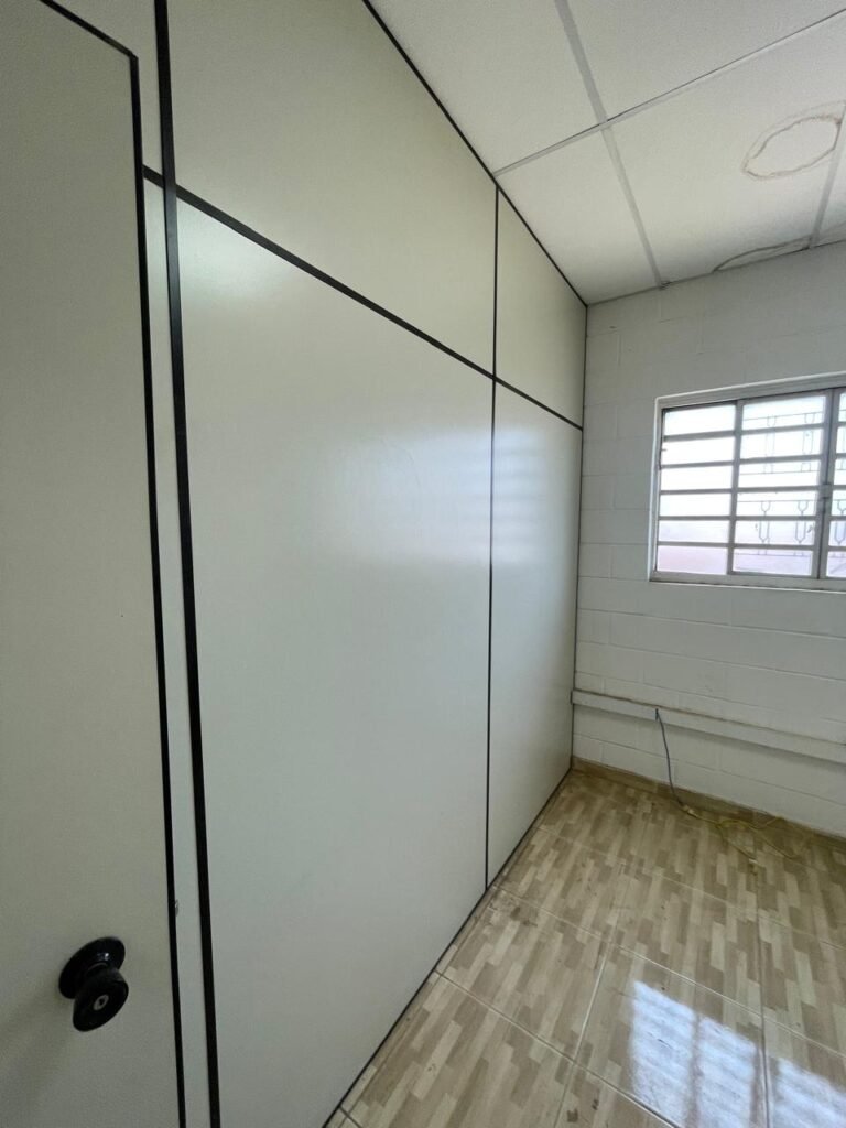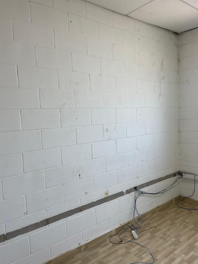 ADMINISTRATIVO 1º ANDAR/SALA:- 01 porta de madeira com pintura na cor branco com desgastes naturais, maçanetas e fechadura em inox, marca Stam em ordem, piso e rodapés revestido de pisos frio cerâmicos na cor bege em ordem, parede de blocos aparente com pintura na cor branco neve com desgastes naturais, com manchas e descasques pela extensão, 04 janelas deslizantes com 24 vidros e 01 fechadura em ordem em cada, divisórias navais em ordem com 02 portas sociais com maçaneta e fechadura embutida em ordem, conduítes externos contendo 06 tomadas, 04 interruptores, fiações aparente, forro de gesso na cor branco com partes com infiltrações e danificadas, 06 luminárias plafon embutidas com LED em ordem.