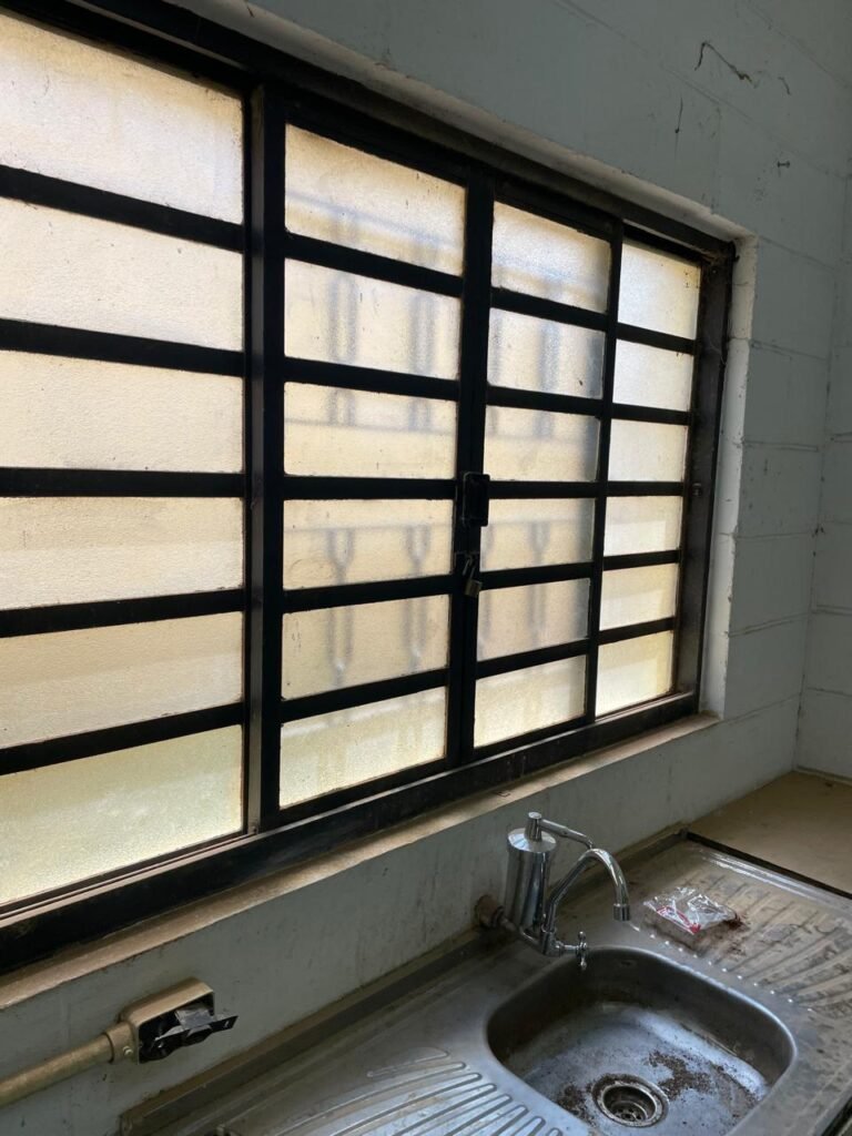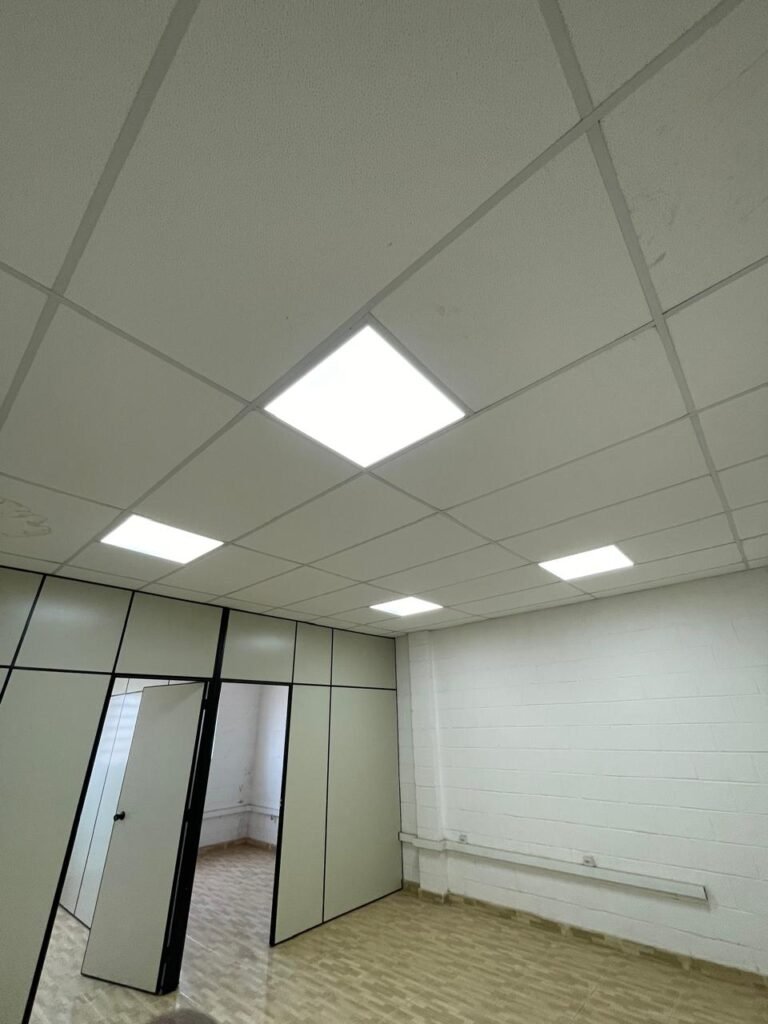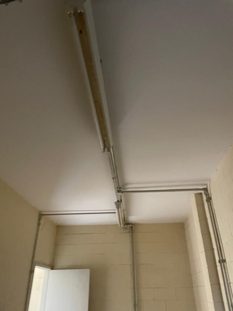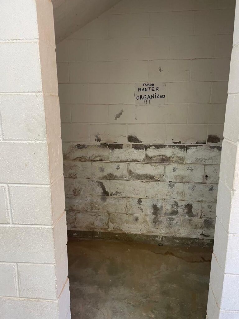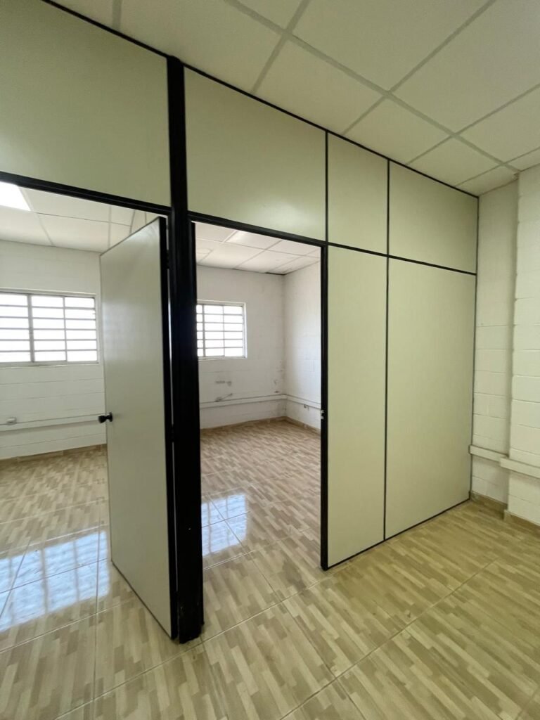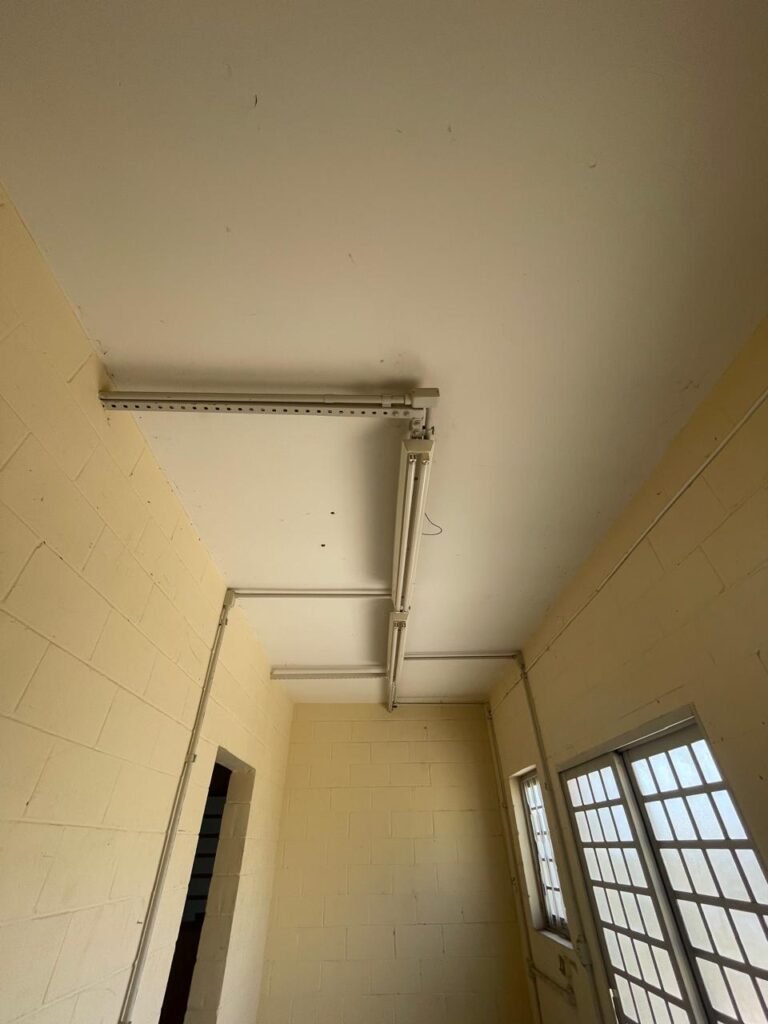 ADMINISTRATIVO 1º ANDAR/SALA:- 01 porta de madeira com pintura na cor branco com desgastes naturais, maçanetas e fechadura em inox, marca Stam em ordem, piso e rodapés revestido de pisos frio cerâmicos na cor bege em ordem, parede de blocos aparente com pintura na cor branco neve com desgastes naturais, com manchas e descasques pela extensão, 04 janelas deslizantes com 24 vidros e 01 fechadura em ordem em cada, divisórias navais em ordem com 02 portas sociais com maçaneta e fechadura embutida em ordem, conduítes externos contendo 06 tomadas, 04 interruptores, fiações aparente, forro de gesso na cor branco com partes com infiltrações e danificadas, 06 luminárias plafon embutidas com LED em ordem.