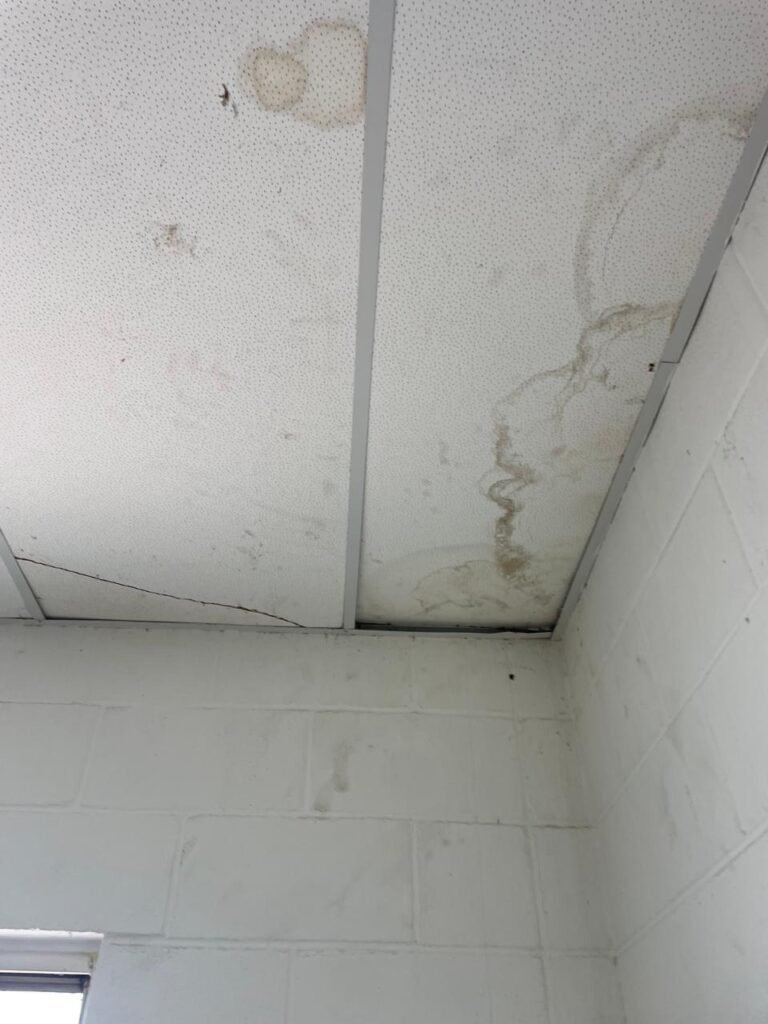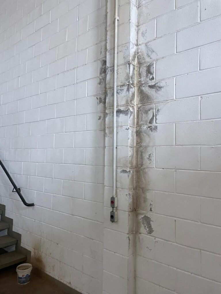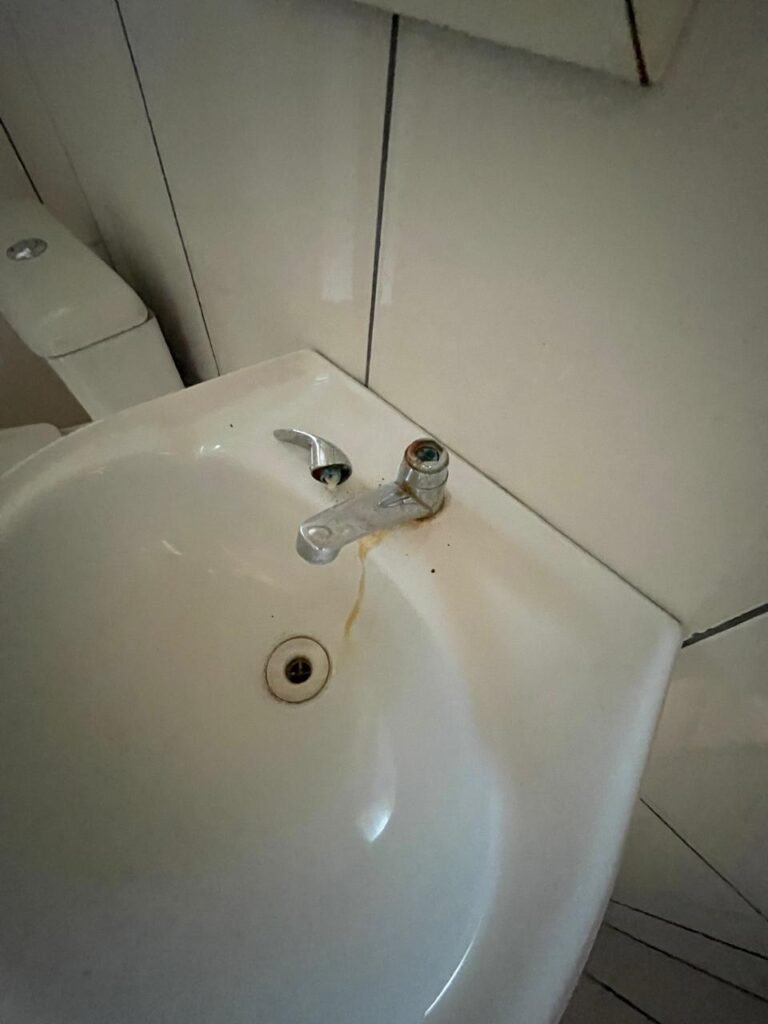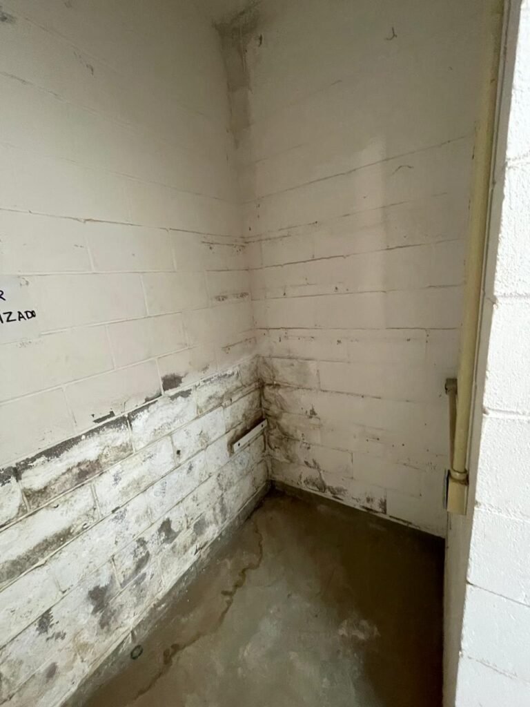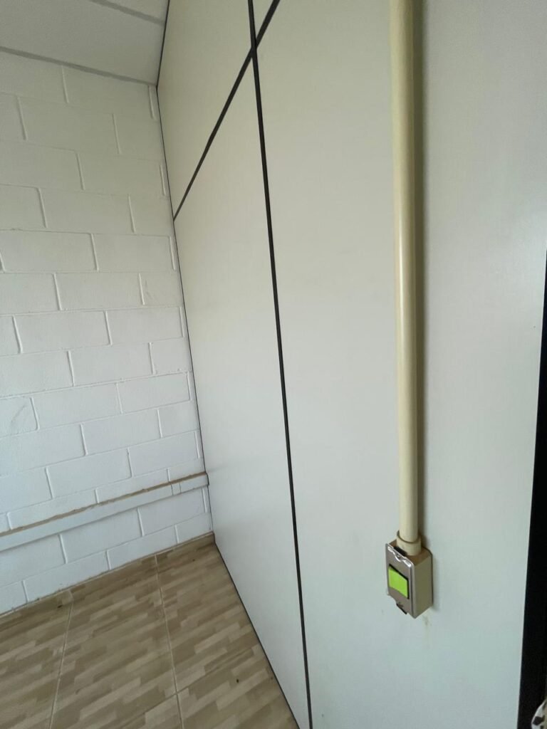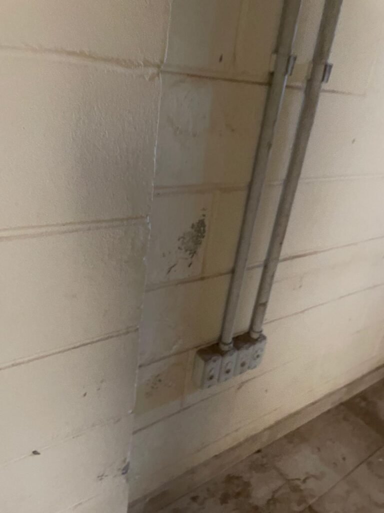 ADMINISTRATIVO 1º ANDAR/SALA:- 01 porta de madeira com pintura na cor branco com desgastes naturais, maçanetas e fechadura em inox, marca Stam em ordem, piso e rodapés revestido de pisos frio cerâmicos na cor bege em ordem, parede de blocos aparente com pintura na cor branco neve com desgastes naturais, com manchas e descasques pela extensão, 04 janelas deslizantes com 24 vidros e 01 fechadura em ordem em cada, divisórias navais em ordem com 02 portas sociais com maçaneta e fechadura embutida em ordem, conduítes externos contendo 06 tomadas, 04 interruptores, fiações aparente, forro de gesso na cor branco com partes com infiltrações e danificadas, 06 luminárias plafon embutidas com LED em ordem.
