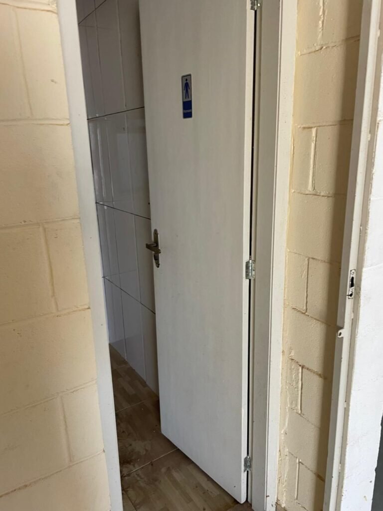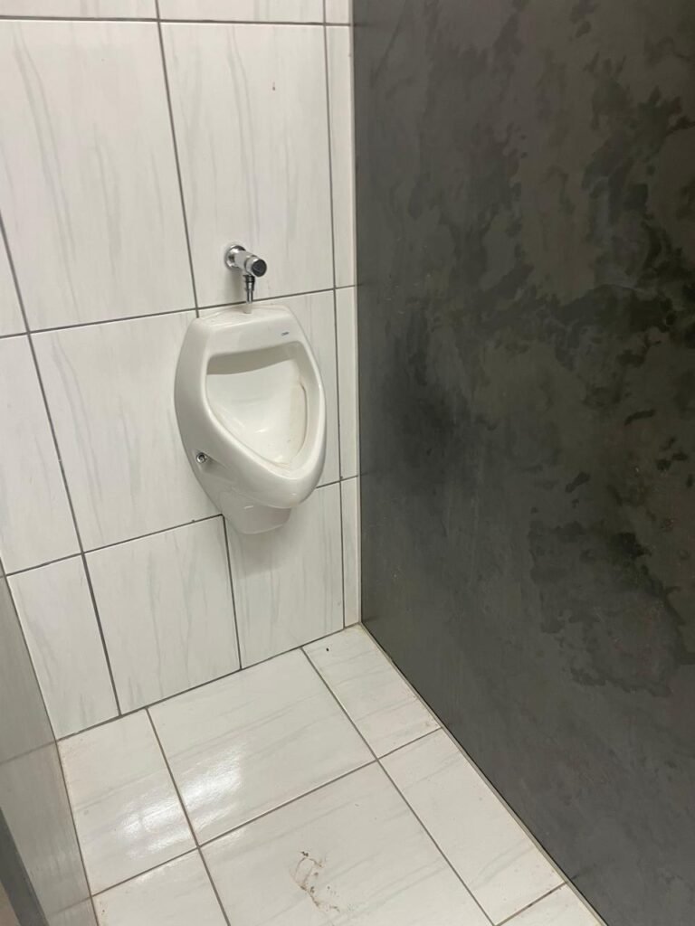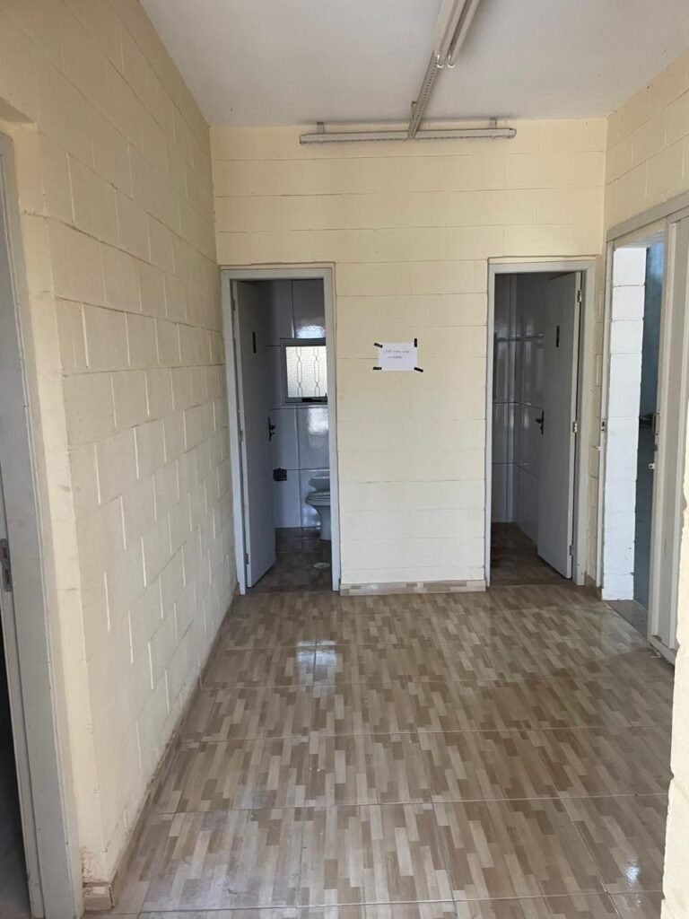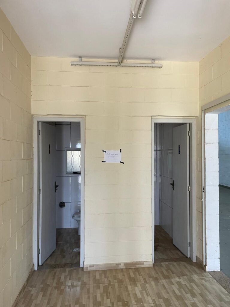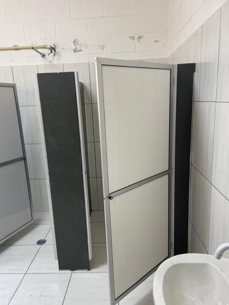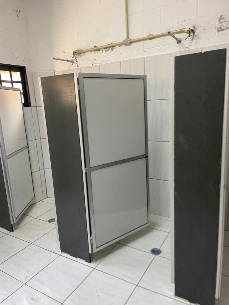 WC/3 BARRACÃO:- Piso frio cerâmica cor branco em ordem, parede com azulejos branco e cinza em ordem até meia altura e restante de bloco cor branca com desgastes naturais e descascando , 01 pia com coluna cor branca em ordem, torneira e sifão em ordem,01 mictório branco em ordem, 04 box com divisórias de ardósia cinza e portas de alumínio e acrílico branco em ordem, 02 conjuntos vaso sanitário e caixa acoplada de descarga vazando no acionamento da descarga, 02 registros de chuveiro, sem chuveiros com fios em conduites externos sem tomadas, 03 vitrôs maxim-ar de ferro cor preto com vidro ok, porta de chapa dobrada de ferro cor preto em ordem, maçanetas em ordem, fechadura e chave fixa em ordem, teto de reboco branco ok, 01 interruptor com conduite externo ok, 01 lâmpada de LED em ordem, 03 ralos sendo 01 aberto. Observação: parte hidráulica não foi testada pois está sem água.