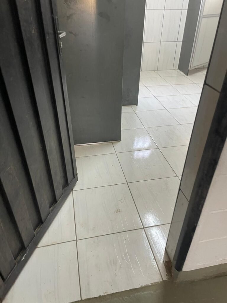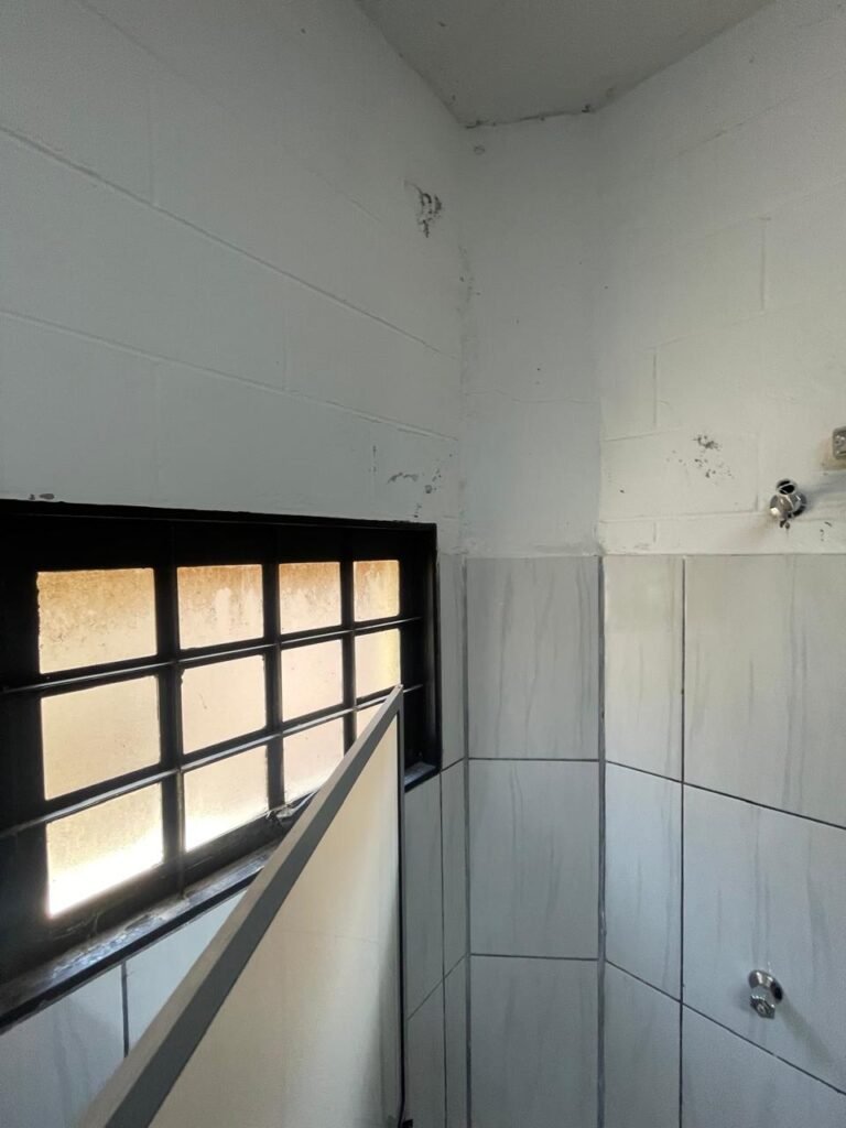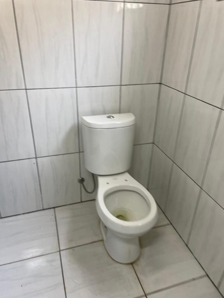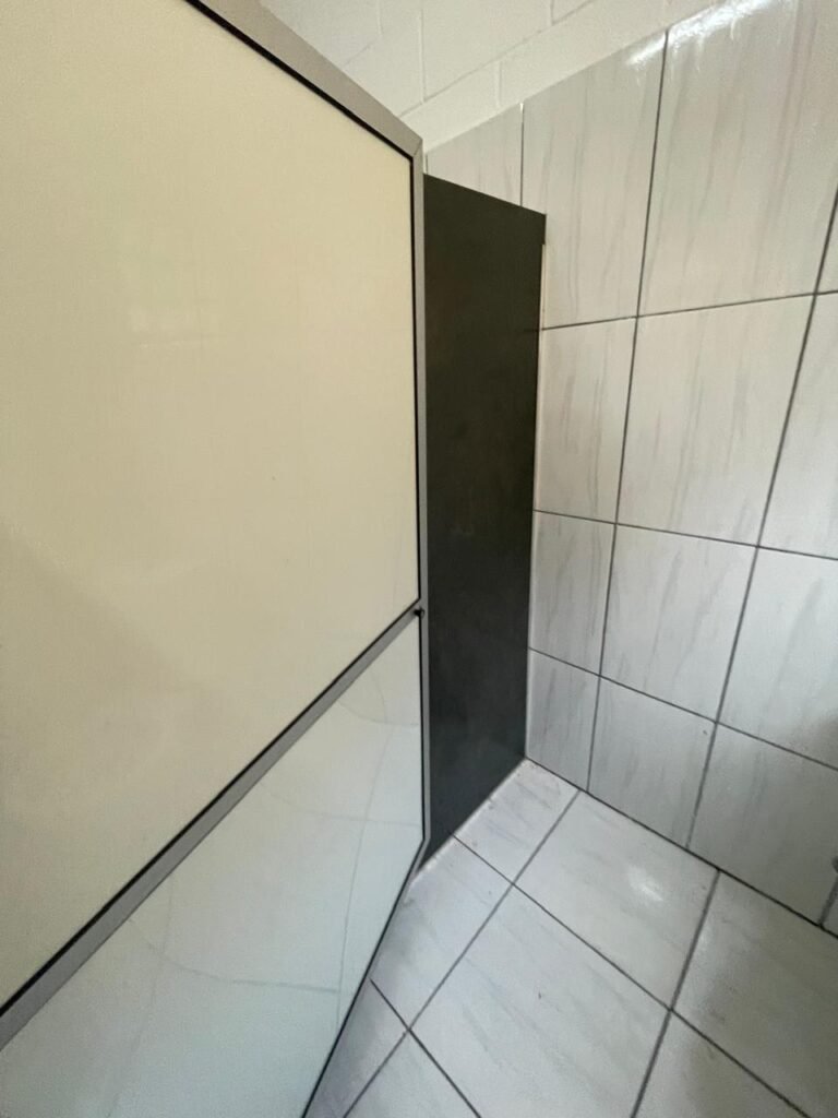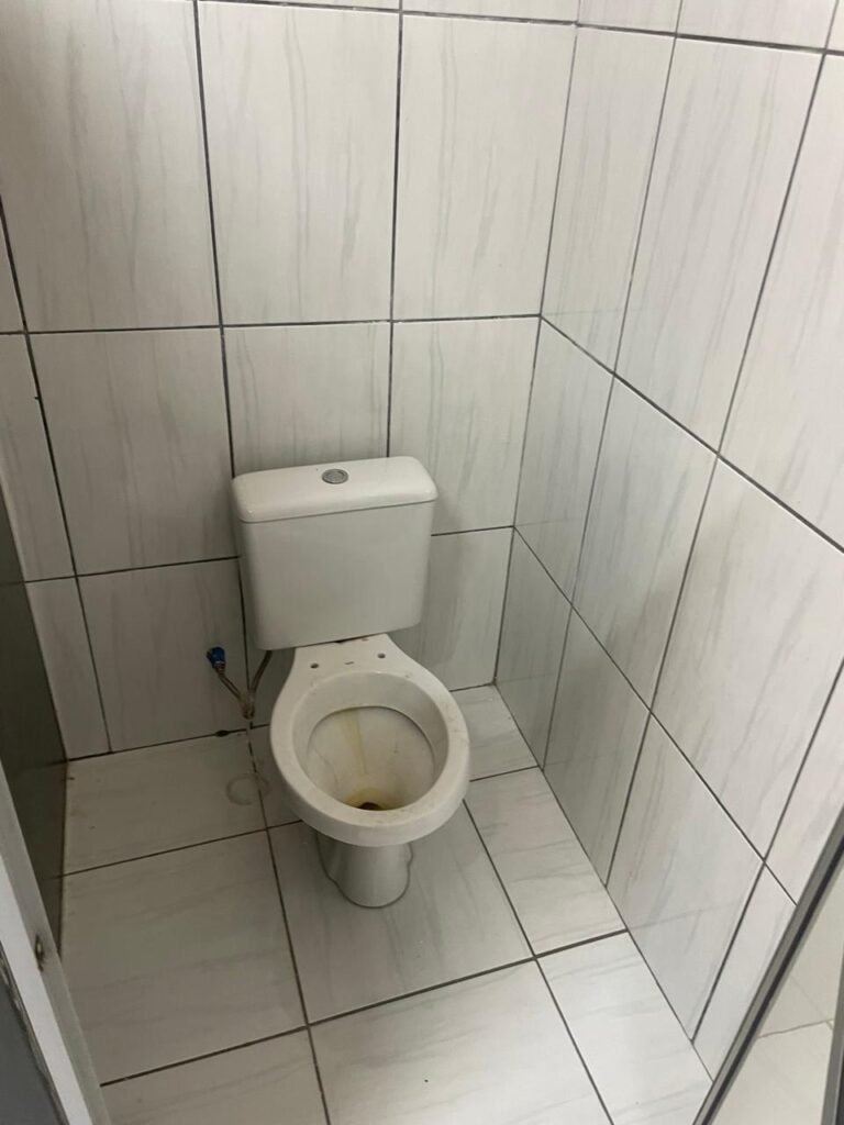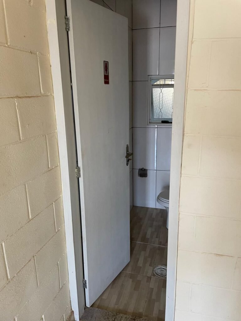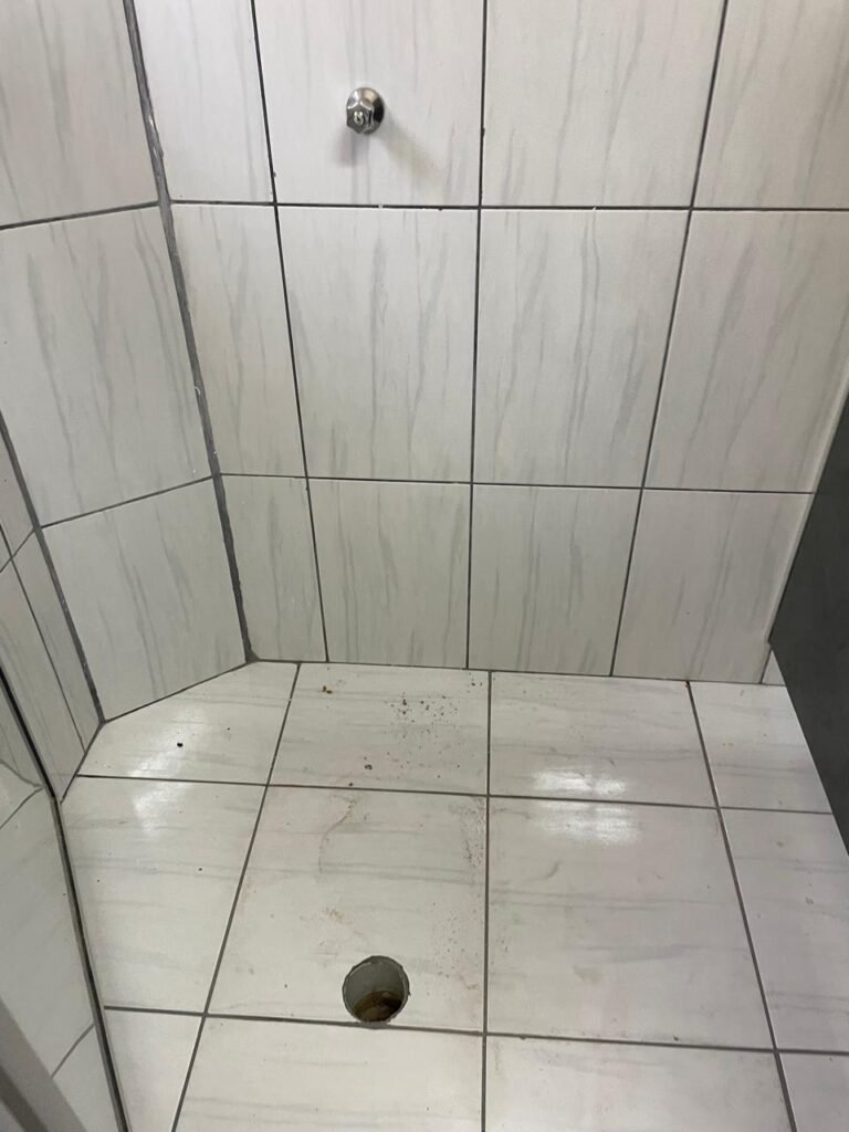 WC/3 BARRACÃO:- Piso frio cerâmica cor branco em ordem, parede com azulejos branco e cinza em ordem até meia altura e restante de bloco cor branca com desgastes naturais e descascando , 01 pia com coluna cor branca em ordem, torneira e sifão em ordem,01 mictório branco em ordem, 04 box com divisórias de ardósia cinza e portas de alumínio e acrílico branco em ordem, 02 conjuntos vaso sanitário e caixa acoplada de descarga vazando no acionamento da descarga, 02 registros de chuveiro, sem chuveiros com fios em conduites externos sem tomadas, 03 vitrôs maxim-ar de ferro cor preto com vidro ok, porta de chapa dobrada de ferro cor preto em ordem, maçanetas em ordem, fechadura e chave fixa em ordem, teto de reboco branco ok, 01 interruptor com conduite externo ok, 01 lâmpada de LED em ordem, 03 ralos sendo 01 aberto. Observação: parte hidráulica não foi testada pois está sem água.
