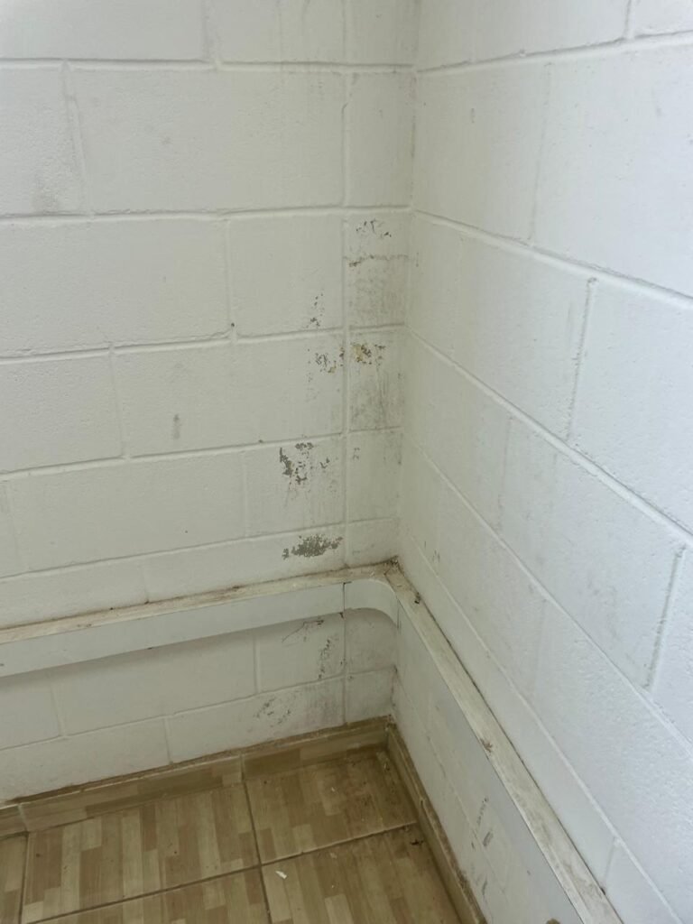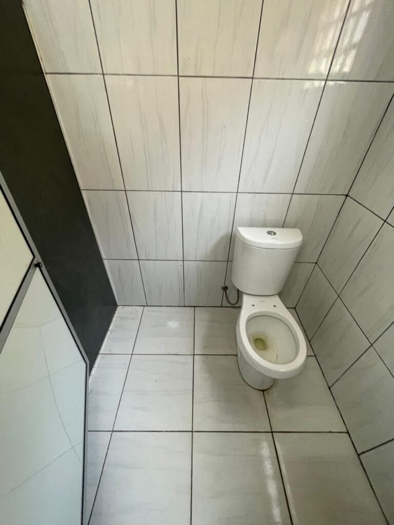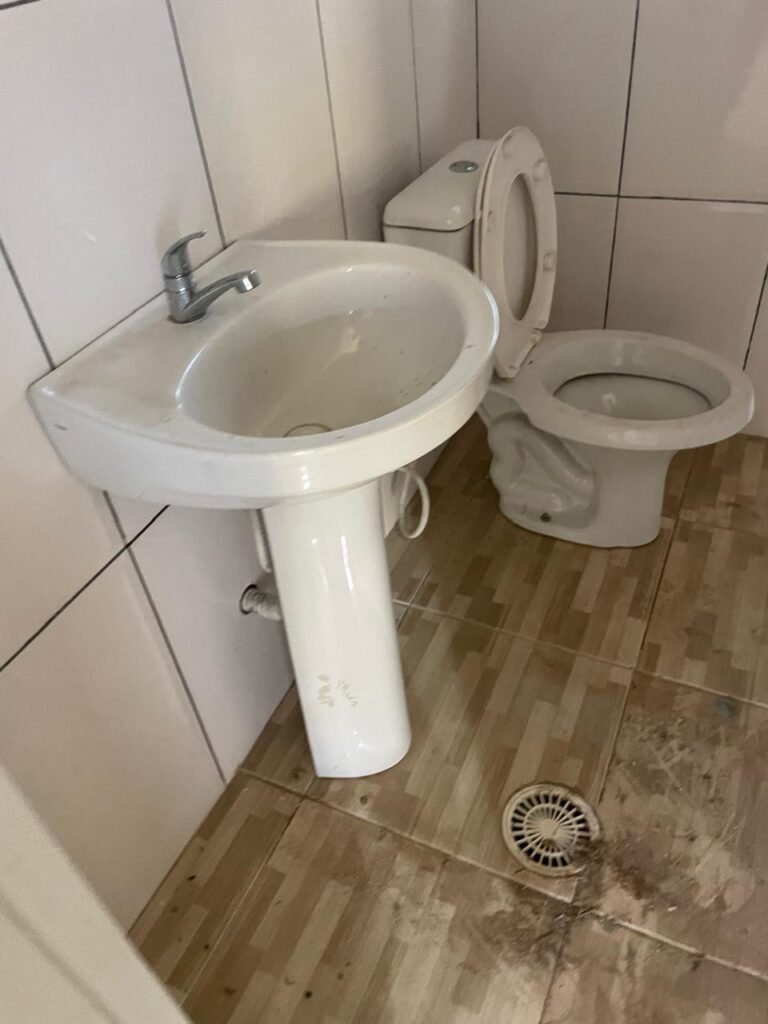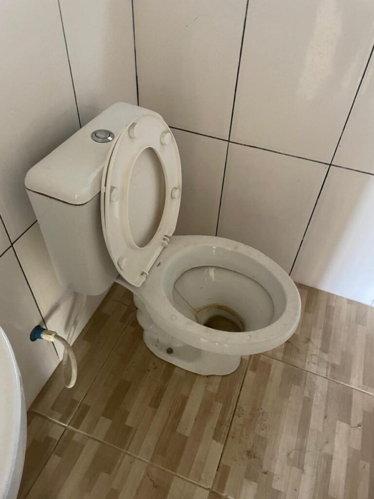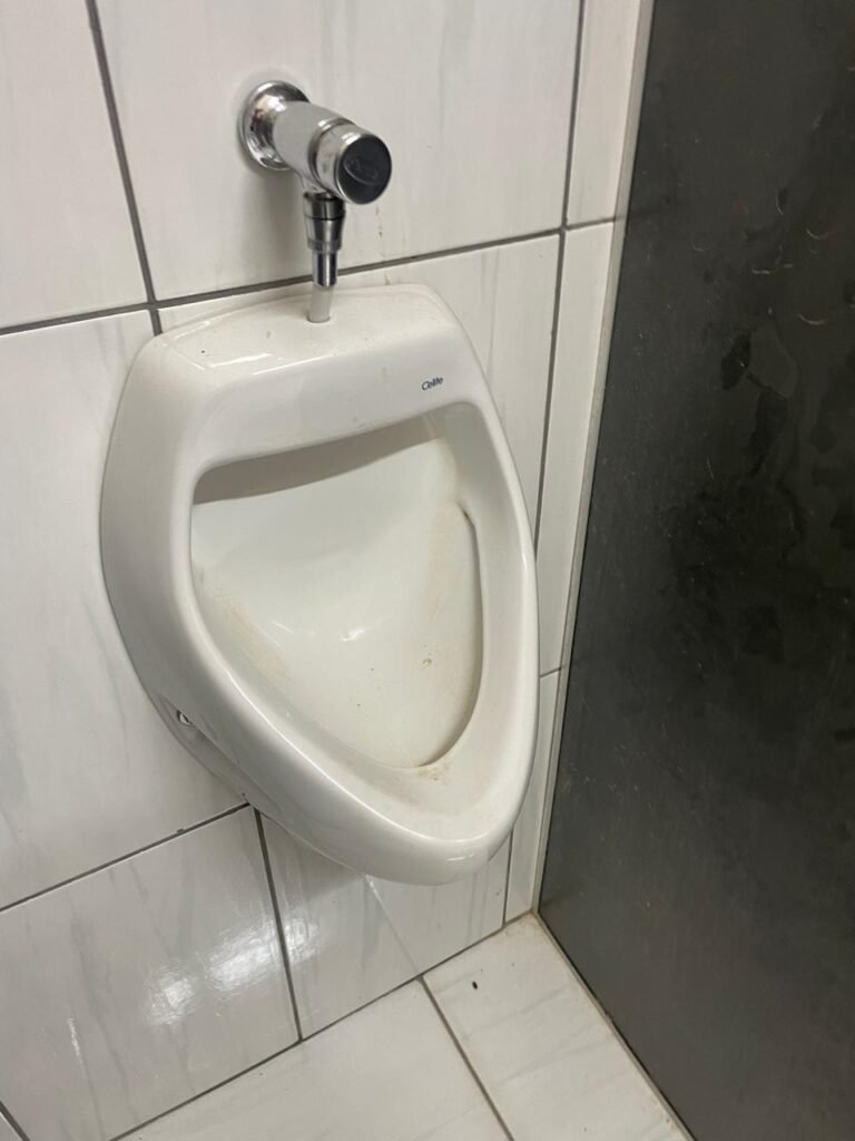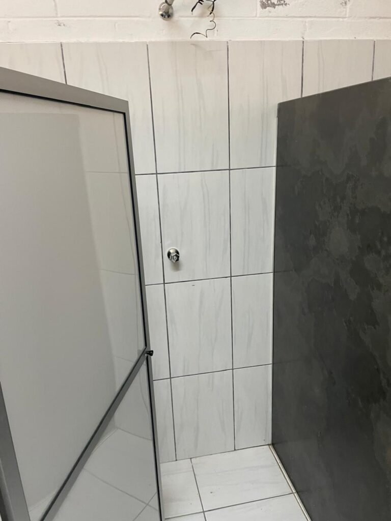 WC/3 BARRACÃO:- Piso frio cerâmica cor branco em ordem, parede com azulejos branco e cinza em ordem até meia altura e restante de bloco cor branca com desgastes naturais e descascando , 01 pia com coluna cor branca em ordem, torneira e sifão em ordem,01 mictório branco em ordem, 04 box com divisórias de ardósia cinza e portas de alumínio e acrílico branco em ordem, 02 conjuntos vaso sanitário e caixa acoplada de descarga vazando no acionamento da descarga, 02 registros de chuveiro, sem chuveiros com fios em conduites externos sem tomadas, 03 vitrôs maxim-ar de ferro cor preto com vidro ok, porta de chapa dobrada de ferro cor preto em ordem, maçanetas em ordem, fechadura e chave fixa em ordem, teto de reboco branco ok, 01 interruptor com conduite externo ok, 01 lâmpada de LED em ordem, 03 ralos sendo 01 aberto. Observação: parte hidráulica não foi testada pois está sem água.