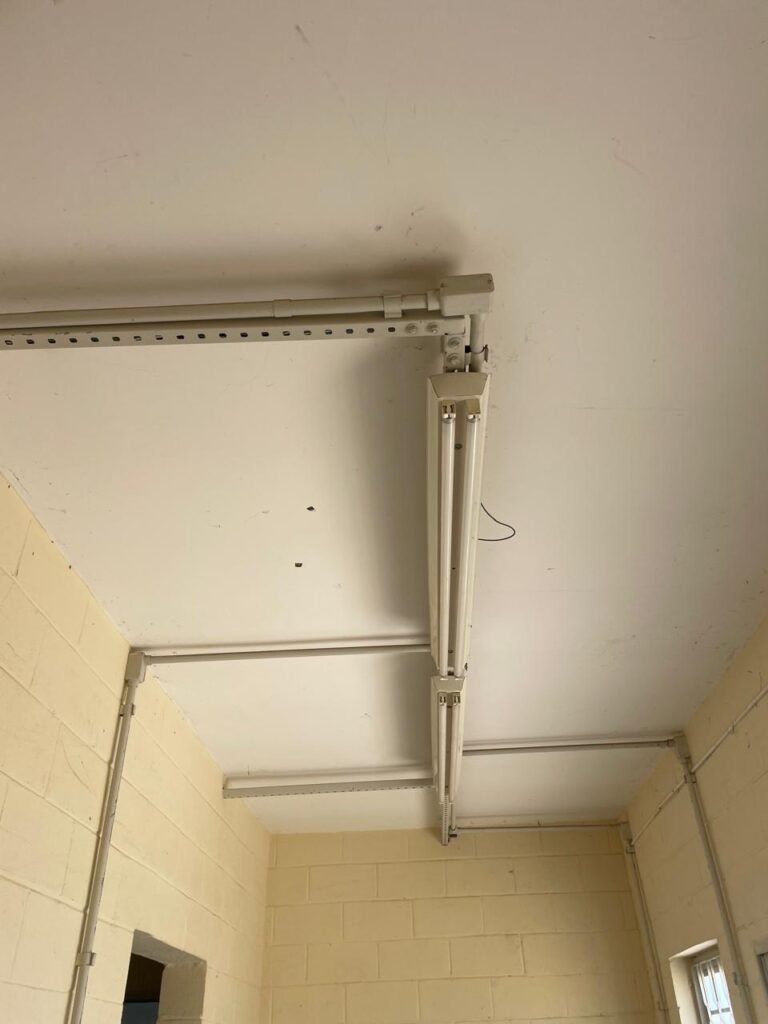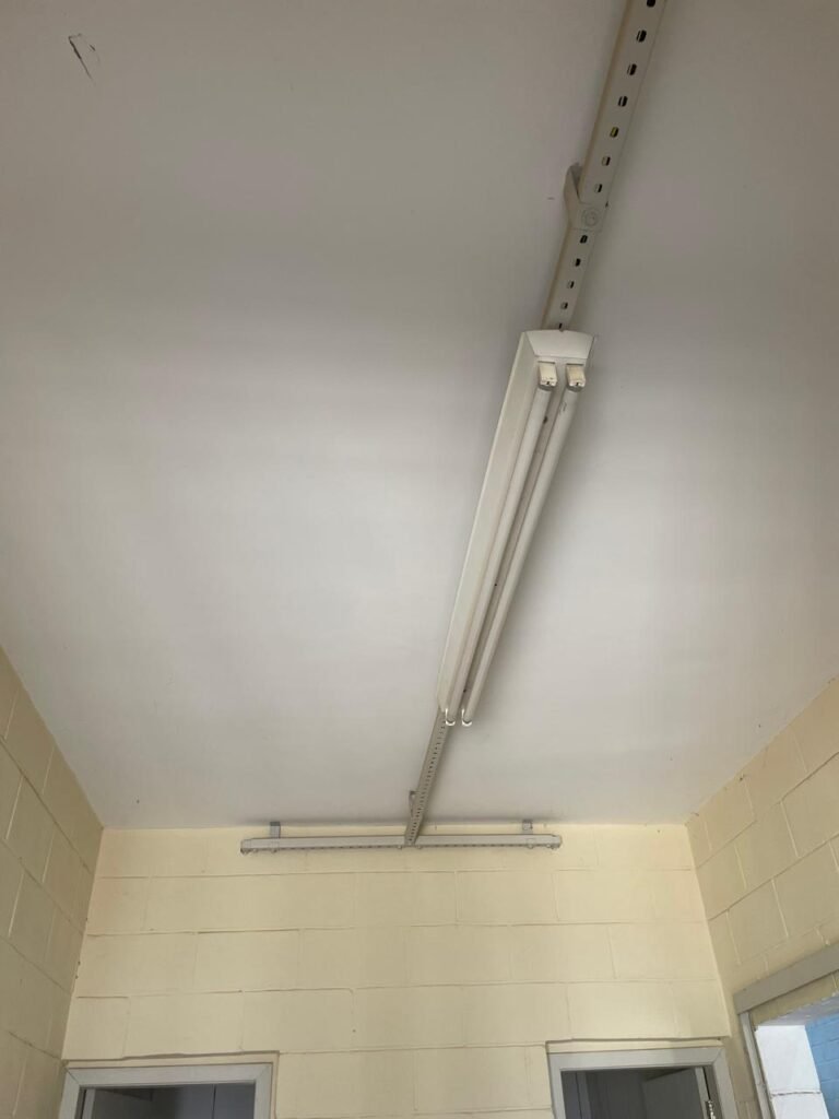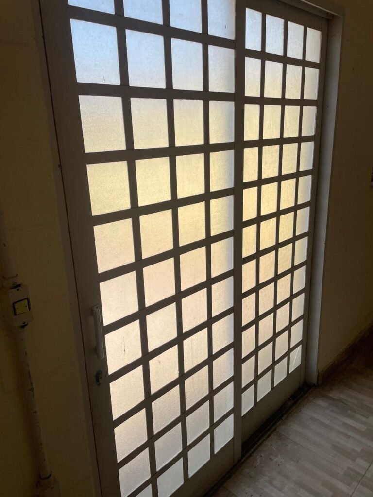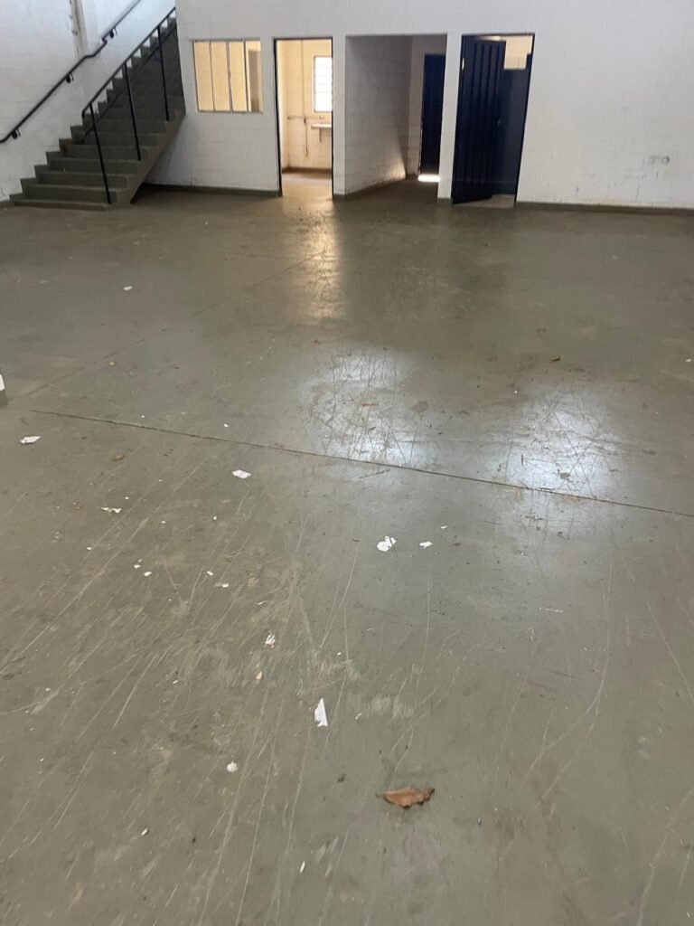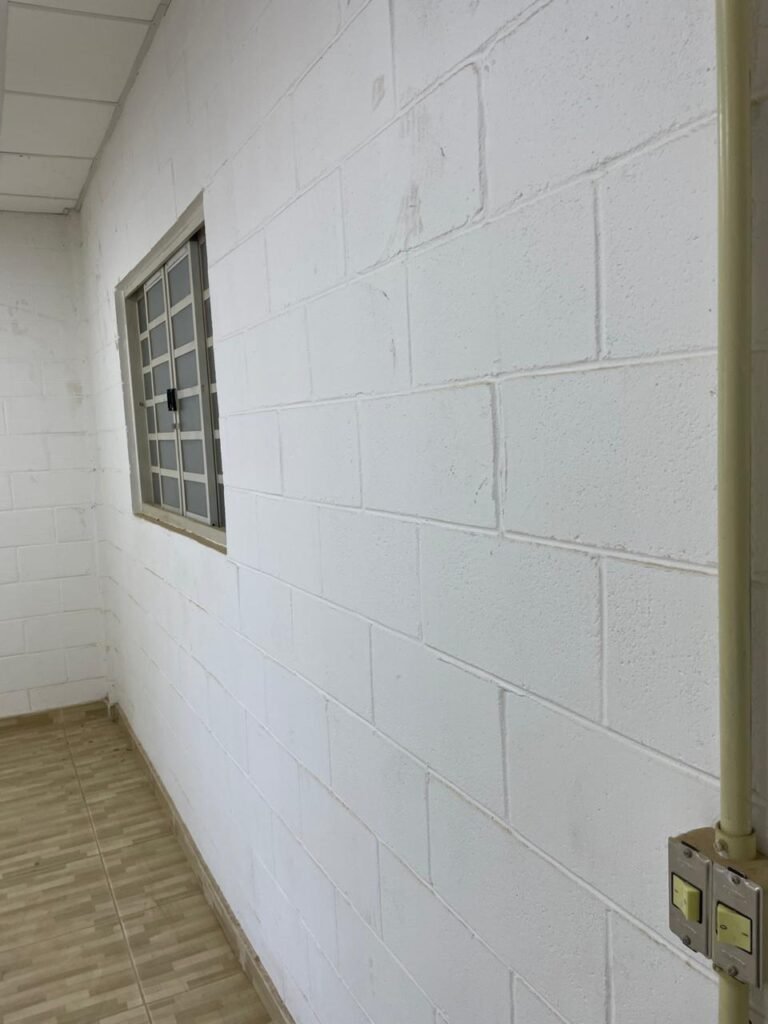 ADMINISTRATIVO/HALL:- piso cerâmico na cor bege em ordem, 01 interruptor em ordem, conduítes externos com 03 tomadas ok, paredes de bloco de concreto com pintura látex na bege com desgastes naturais, manchas e buracos com buchas pela extensão, teto de reboco cor branco em ordem, 01 luminária com lâmpadas Fluorescentes duplas em ordem (iluminação não foi testada devido a curto no disjuntor), 01 porta de correr de chapa dobrada de ferro cor branca com trincos e chaves ok, 01 vitrô de ferro cinza com grade e 24 vidros ok.