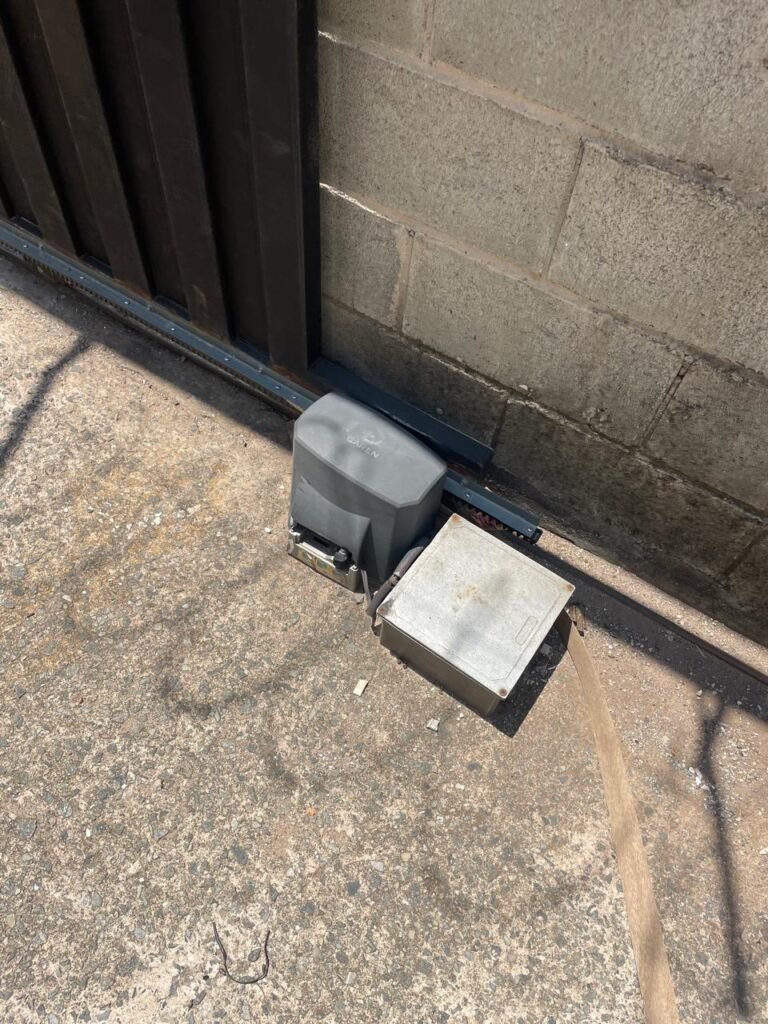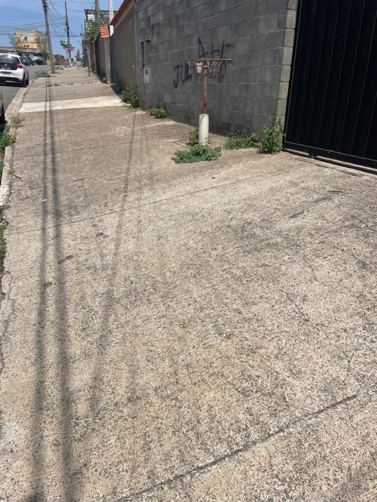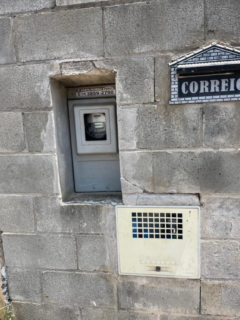 FACHADA:- Piso de concreto ok, 01 lixeira de ferro ok, muro de bloco de concreto ok, 01 portão de correr com porta social com trincos e chaves ok, confeccionados em chapa dobrada de ferro com pintura na cor um em preto e outro cinza com desgastes naturais e marcas de uso, caixa de correi padrão ok, relógio de água padrão ok, poste de luz padrão ok, cerca serpentina móvel em ordem, 01 interfone marca Alg em ordem.