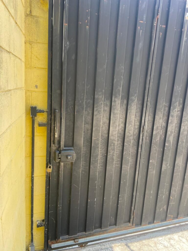 GARAGEM:- piso de concreto ok, muros e paredes frontais de blocos de concreto com pintura na cor amarela com desgastes naturais e restante em ordem (frente do barracão) ok, 01 torneira de jardim ok, 01 condutor de agua de PVC ok, 01 portão tipo carreta de chapa de chapa dobrada de ferro cor preto com porta social com trincos e chaves ok, cercado de cercas serpentinas em ordem.