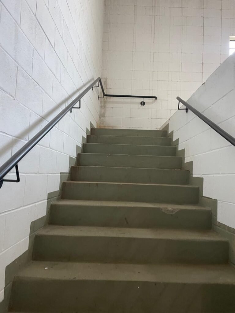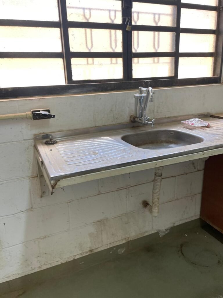 COZINHA/BARRACÃO:- piso de concreto cor cinza ok, paredes com pintura na cor branco com desgastes naturais e com manchas pela extensão, teto cor branco ok, porta de chapa dobrada de ferro cor preto ok, maçanetas ok, chaves ok, 01 vitro de alumínio e vidro ok, 03 tomadas sendo que 02 estão com acabamento solto restante ok, 01 interruptor ok, 01 luminária ok, 01 vitro de ferro cor preto com 24 vidros em ordem, 01 pia de aço inox com torneira e sifão em ordem, dispensa sob escada com 01 tomada, 01 interruptor em ordem. Observação: torneira e pia não testadas