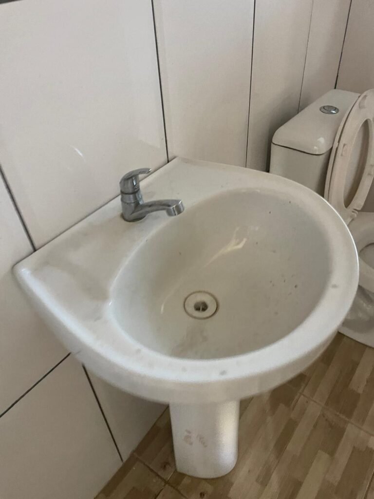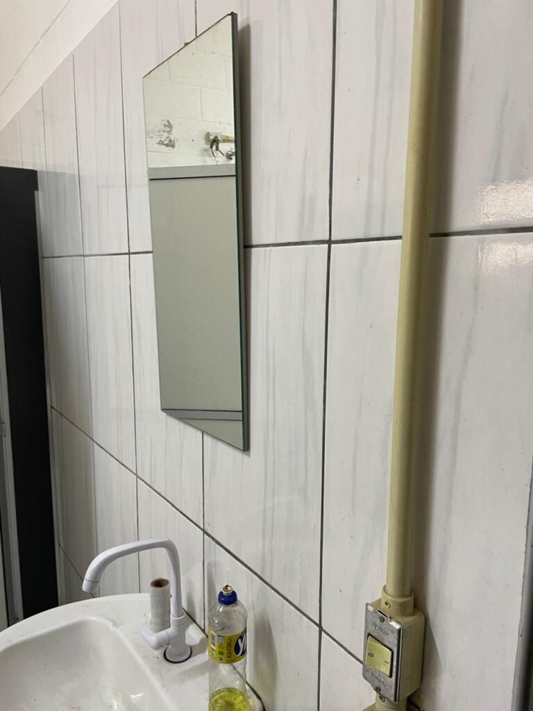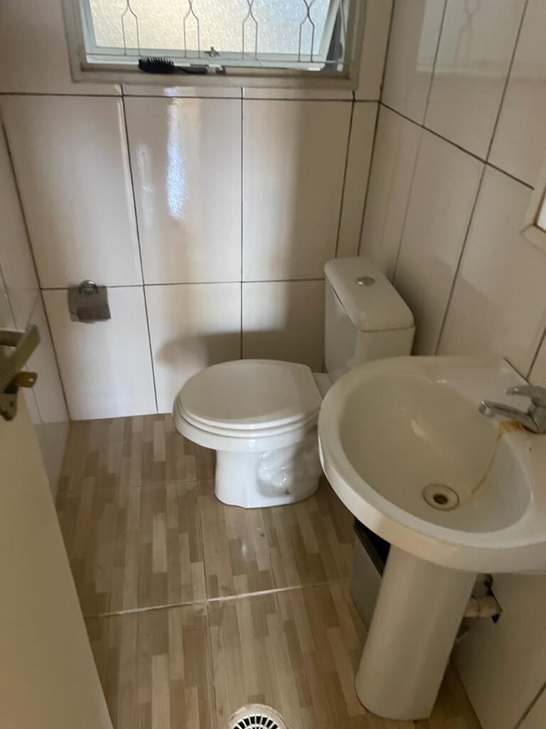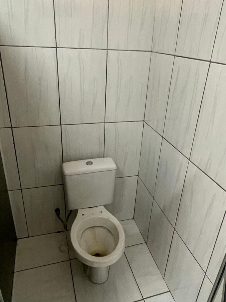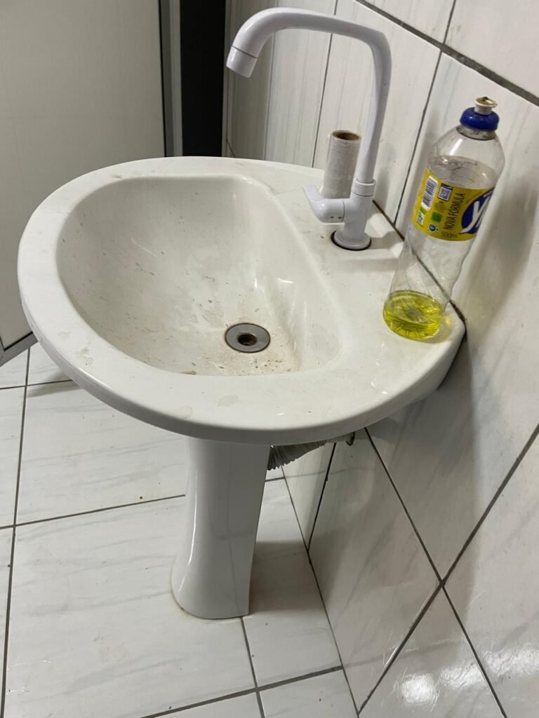 WC/2 ADMINISTRATIVO:- Piso frio cerâmica cor bege em ordem, ralo em ordem, parede com azulejos branco em ordem, 01 conjunto de vaso sanitário e caixa acoplada de descarga emperrada e tampa branca ok, 01 pia com coluna cor branca com torneira (não testada) e sifão em ordem, 01 vitrô maxim-ar de ferro cor cinza com vidro ok, porta de madeira cinza em ordem, maçanetas em ordem, fechadura e chave fixa em ordem, teto de reboco branco ok, 01 interruptor com conduíte externo ok, 01 luminária com lâmpada fluorescente de bocal ok, 01 espelho na parede ok, 01 suporte de papel higiênico ok, 01 suporte de toalha ok.