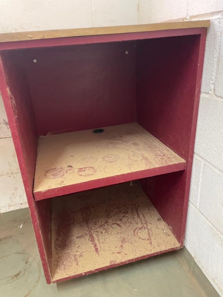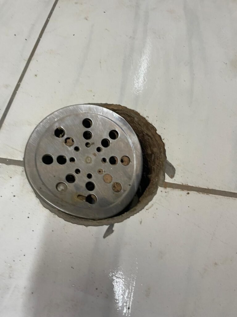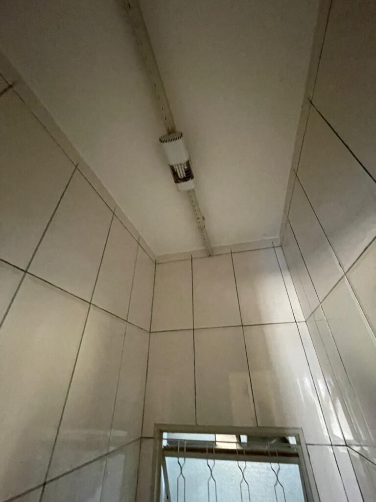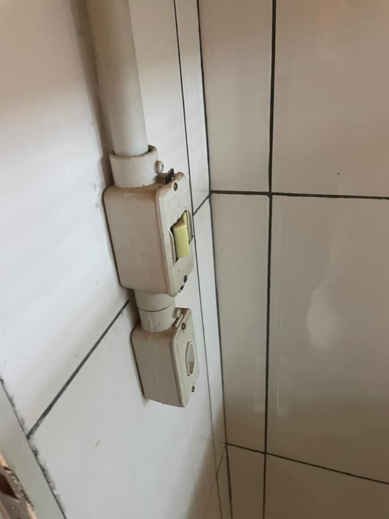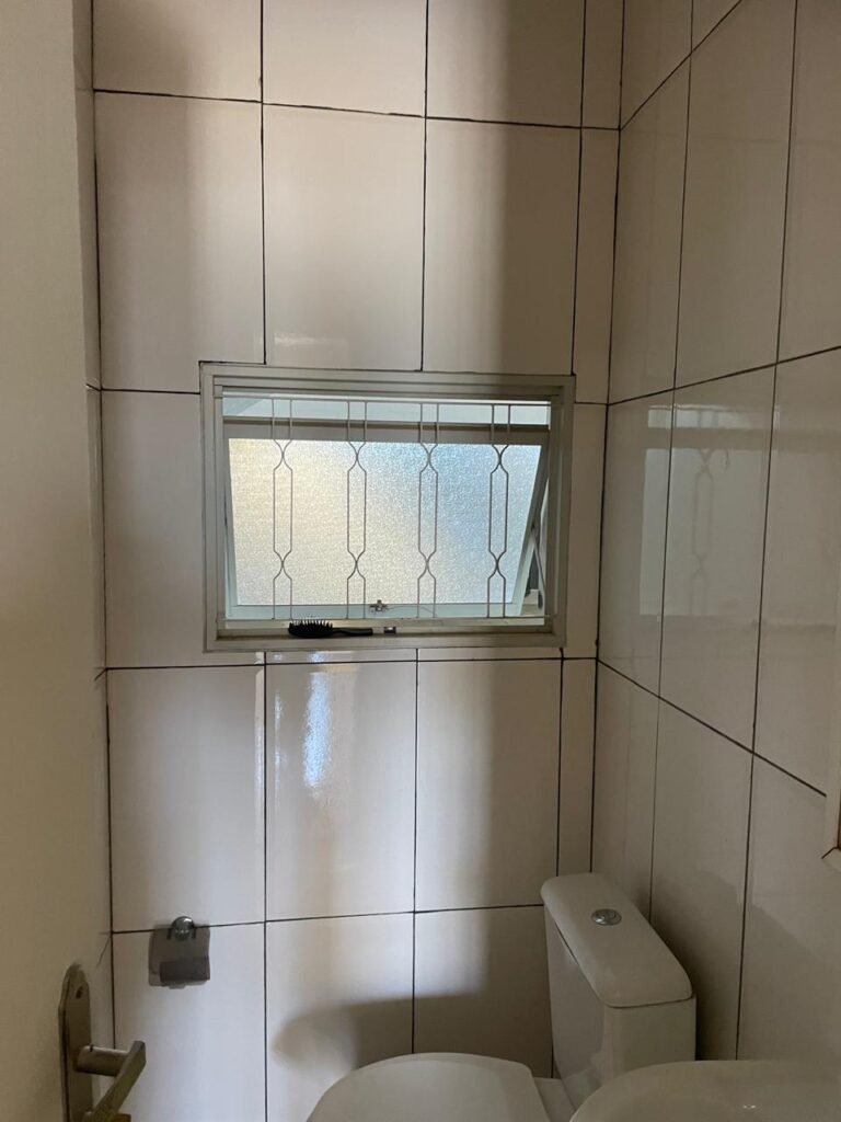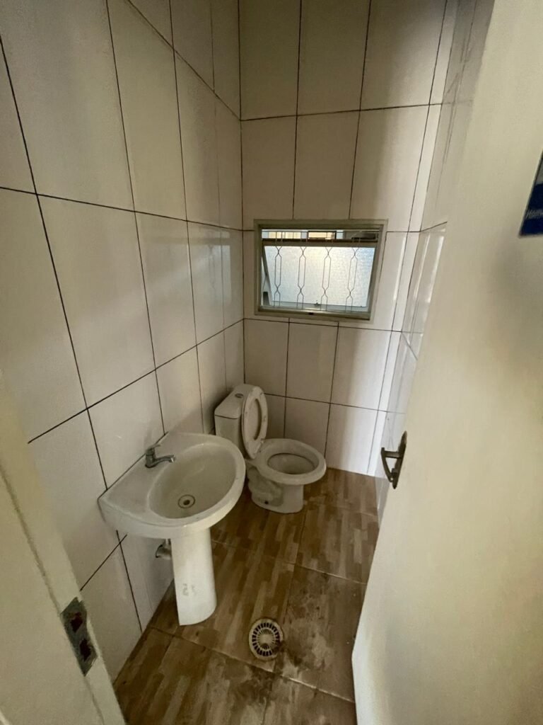 WC/2 ADMINISTRATIVO:- Piso frio cerâmica cor bege em ordem, ralo em ordem, parede com azulejos branco em ordem, 01 conjunto de vaso sanitário e caixa acoplada de descarga emperrada e tampa branca ok, 01 pia com coluna cor branca com torneira (não testada) e sifão em ordem, 01 vitrô maxim-ar de ferro cor cinza com vidro ok, porta de madeira cinza em ordem, maçanetas em ordem, fechadura e chave fixa em ordem, teto de reboco branco ok, 01 interruptor com conduíte externo ok, 01 luminária com lâmpada fluorescente de bocal ok, 01 espelho na parede ok, 01 suporte de papel higiênico ok, 01 suporte de toalha ok.