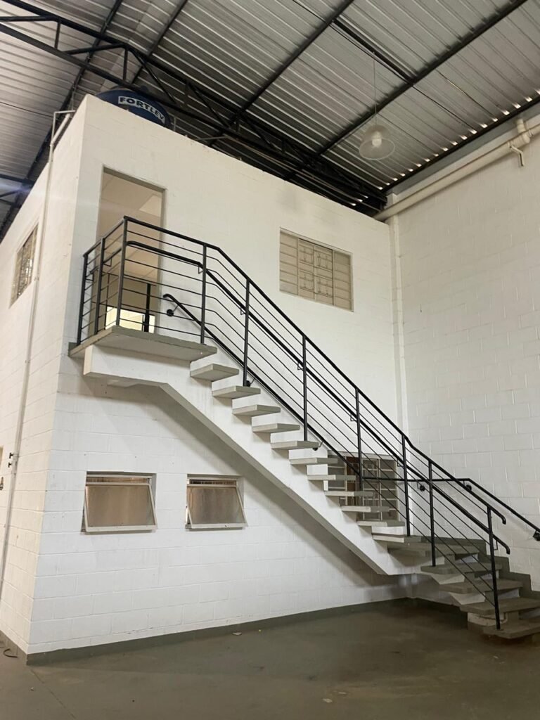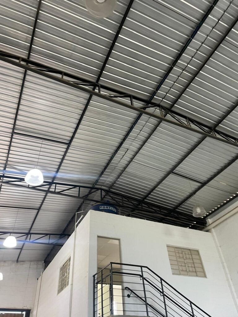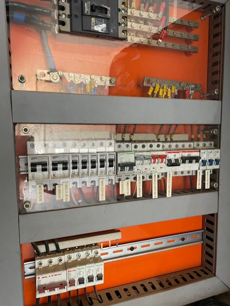 BARRACÃO:- pintura das paredes e do piso com desgastes naturais, manchas pela extensão e descasques piso de concreto polido pintado de cinza ok, 01 quadro de luz com 20 disjuntores sendo: 04 trifásico de 60/50/40/32 A, 06 bifásico de 16/16/25/16/10/10 A e 10 monofásico de 32/20/10/16/16/16/20/20/20/20 A, teto com estrutura de ferro na cor preto em ordem, telhas galvanizadas trapezoidais em ordem, 08 lustres com lâmpadas fluorescentes sendo que 05 estão em ordem, 01 interruptor, C1 luminária com lâmpada incandescente ok, 02 registro de água ok, 01 quadro de luz de PVC com 09 disjuntores: 01 trifásico de 50 A, 01 bifásico de 20 A e 07 monofásico de 20/20/10/32/32/25/25 A, 02 escadas de concreto com corrimão e guarda-corpo de ferro redondo cor preta ok, 01 tomada 220v e 02 110v ok, 02 vitrôs de ferro cor branco com 24 vidros em ordem, 01 laje com piso polido sem guarda corpo.