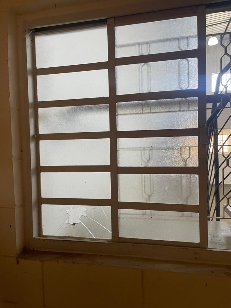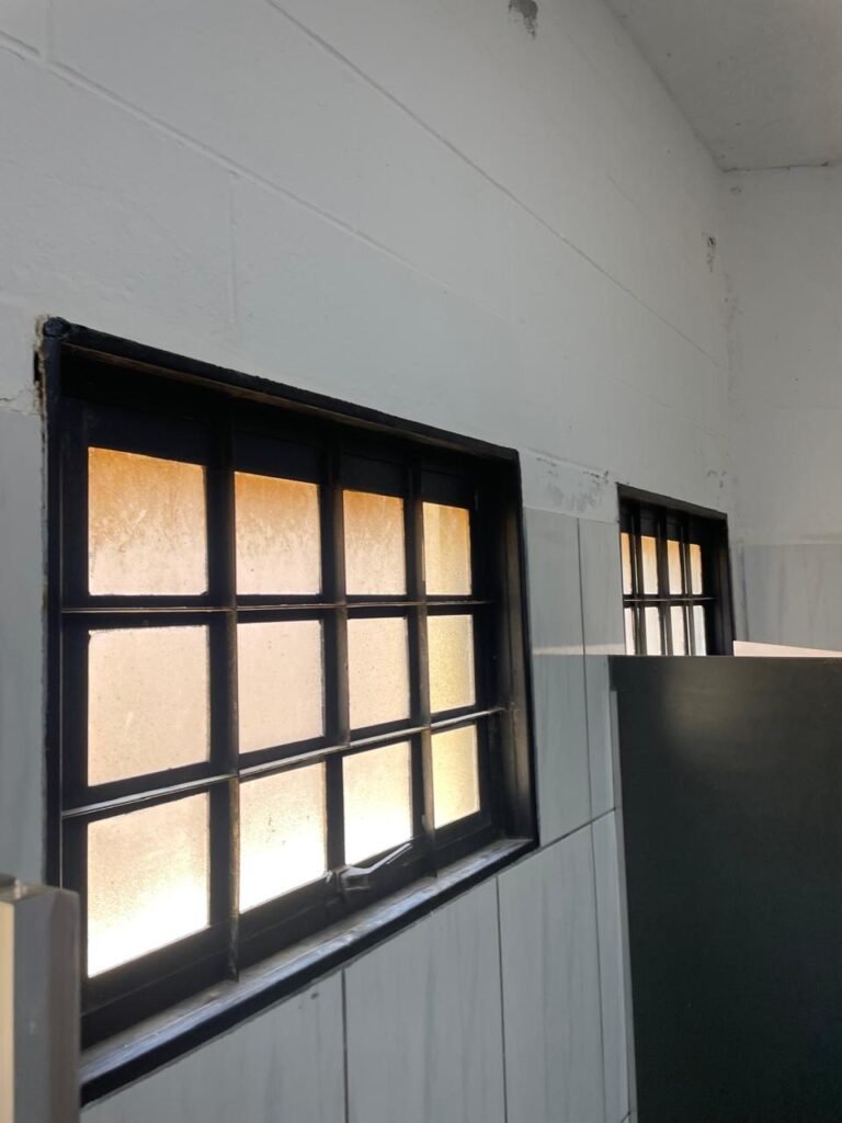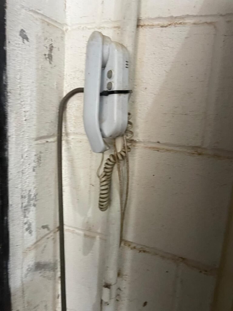ADMINISTRATIVO/RECEPÇÃO:- piso cerâmico na cor bege em ordem, 01 interruptor em ordem, conduítes externos com 06 tomadas ok, paredes de bloco de concreto com pintura látex na bege com desgastes naturais, manchas, infiltração e partes descascadas pela extensão, teto com pintura na cor branco com desgastes naturais e pequenos buracos, 02 luminárias com lâmpadas Fluorescentes duplas não testadas (devido ao curto no disjunto geral), 01 porta de correr 2 folhas de ferro cor cinza com trincos e chaves ok e 88 vidros sendo que 01 deles está trincada e restante em ordem, 02 vitrôs maxim-ar de ferro com grade e vidro ok, 02 tomadas de telefone, uma sem espelho, 01 interfone ok.