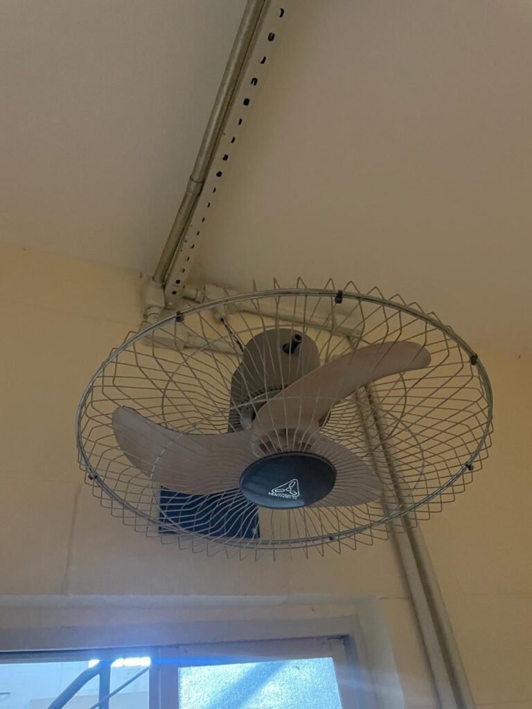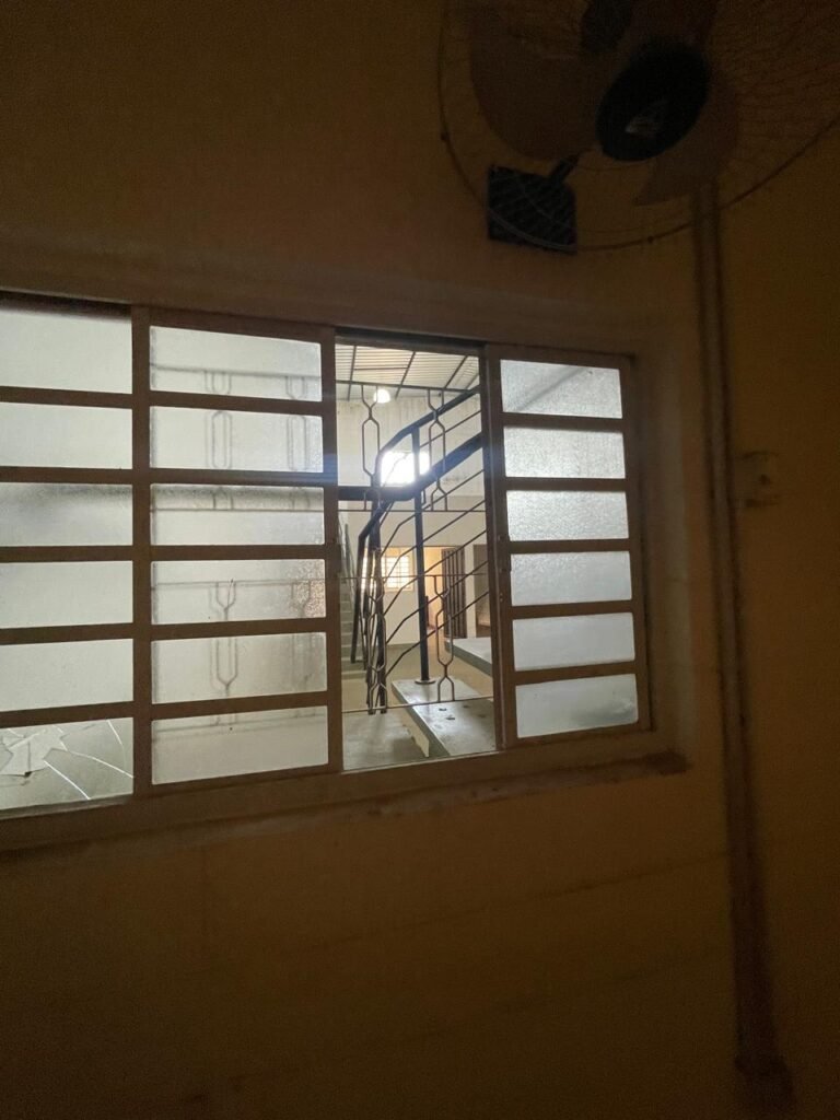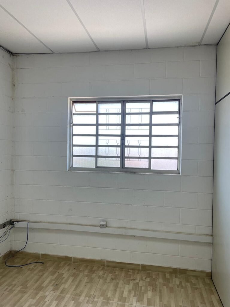 ADMINISTRATIVO TERREO/SALA:- piso cerâmico na cor bege com desgastes naturais e restante em ordem, 01 interruptor em ordem, conduítes externos com 10 tomadas e 03 de telefone ok, paredes de bloco de concreto com pintura látex na bege com desgastes naturais, com manchas e descasques pela extensão, teto de reboco cor branco em ordem, 02 luminária com lâmpadas Fluorescentes duplas (lâmpadas não testadas devido a curto no disjuntor, ventilador não testado devido a curto), 01 porta de madeira branca com lasca em baixo e trincos e chaves em ordem, 01 vitrô de ferro com grade e 24 vidros sendo 01 quebrado e restante em ordem, 01 ventilador de parede marca Delta ok.