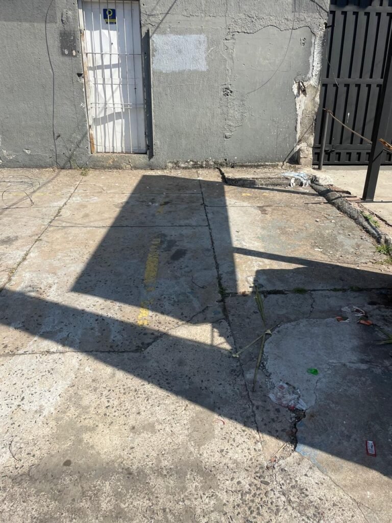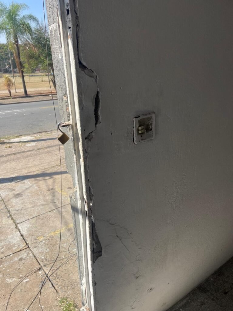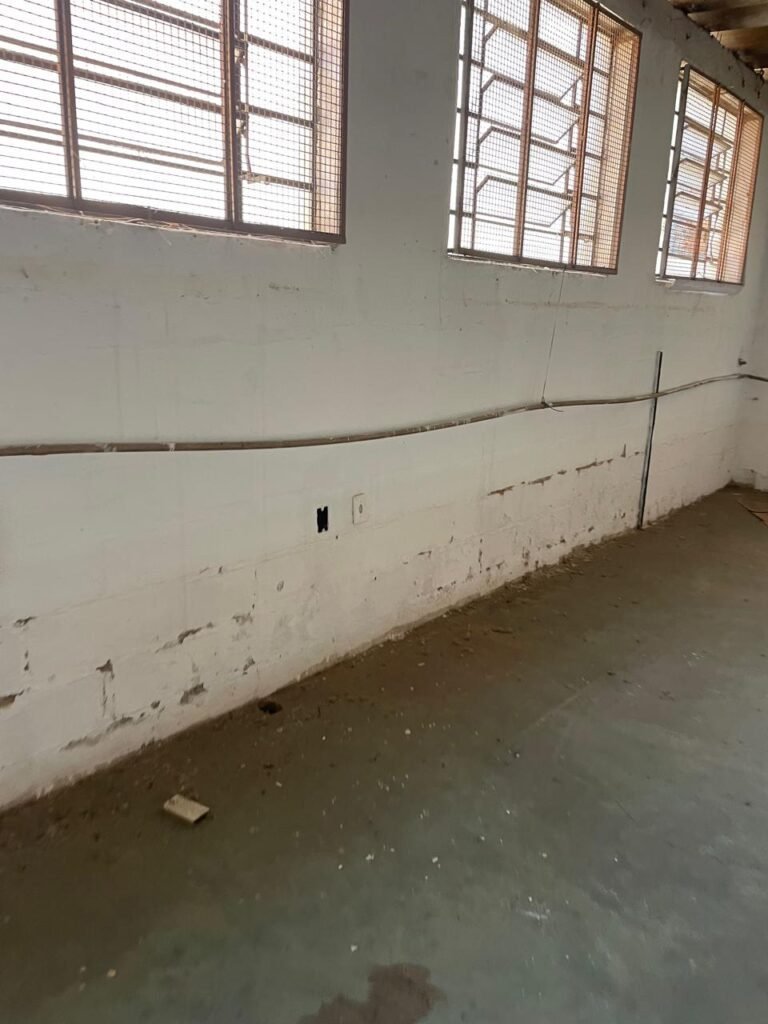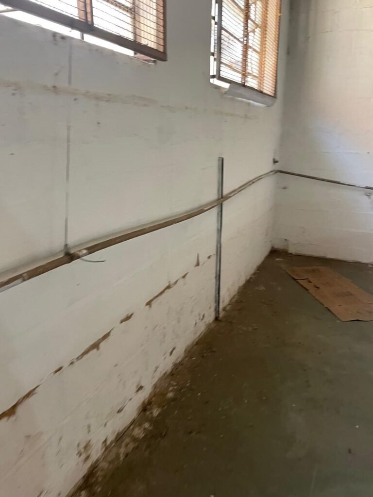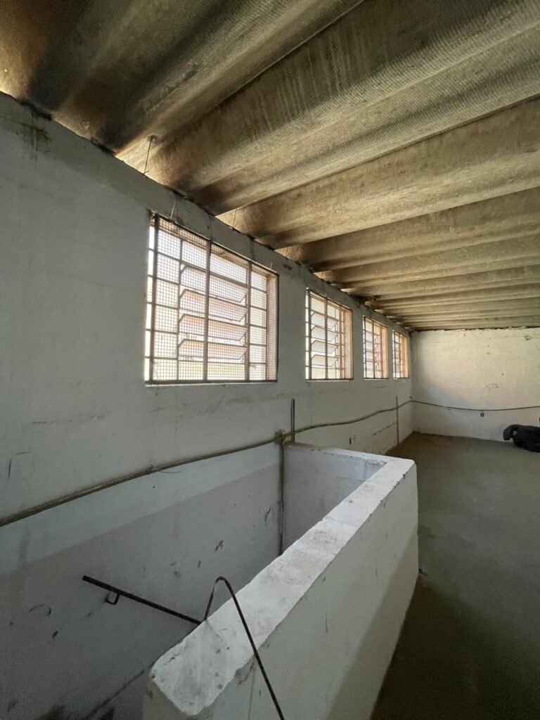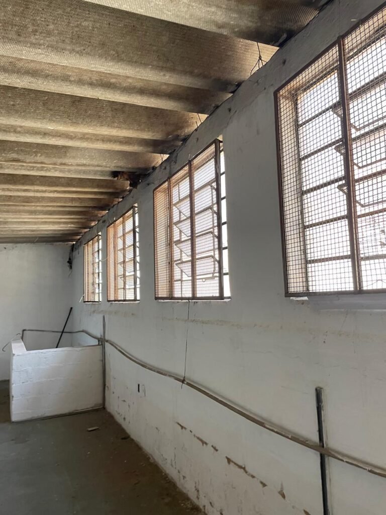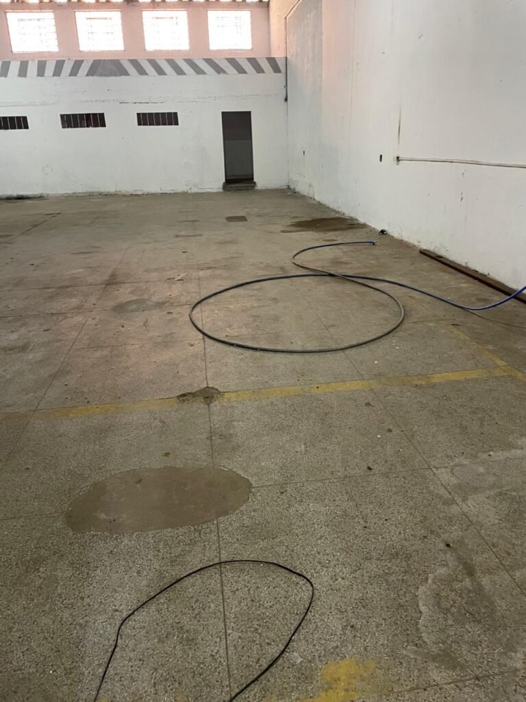 BARRACÃO:- Piso de granilite sujos com remendos, partes faltando e linhas amarelas, paredes com pintura na cor branca com manchas e partes desgastadas, na parte de dentro do portão possui 02 trincos para cadeado porem estão sem cadeados, 02 trincos em ordem, estrutura metálica para suporte das telhas em ordem, telhas de fibrocimento aparentemente em ordem, 05lâmpadas de led em ordem, no fundo 01 interruptor e 01 espelho cego danificado.