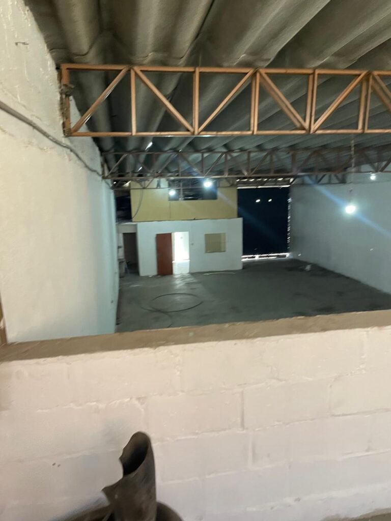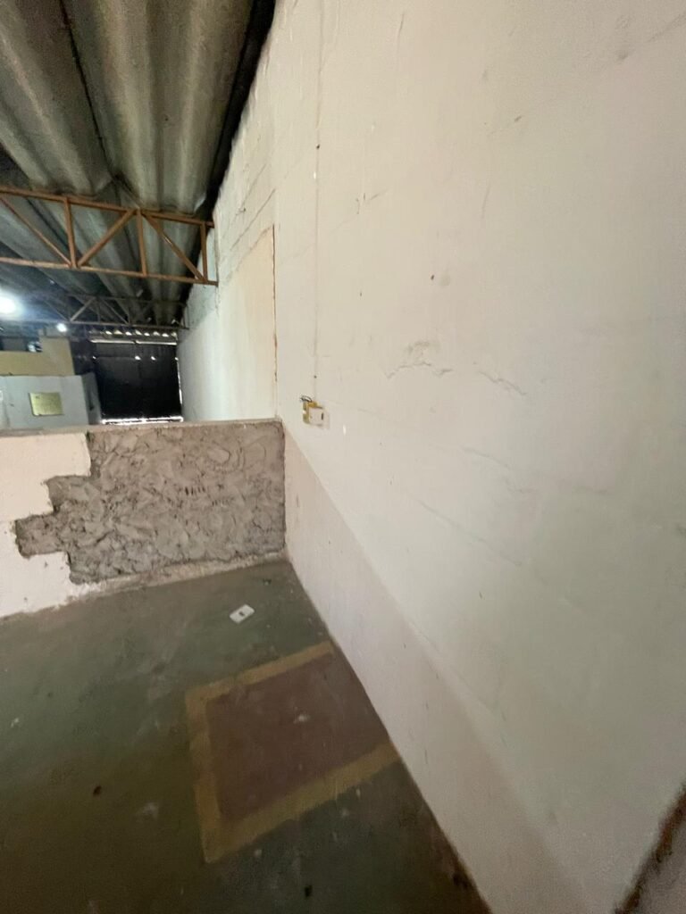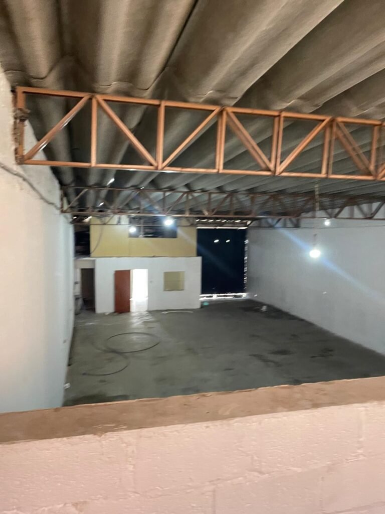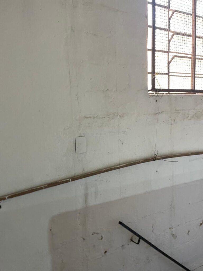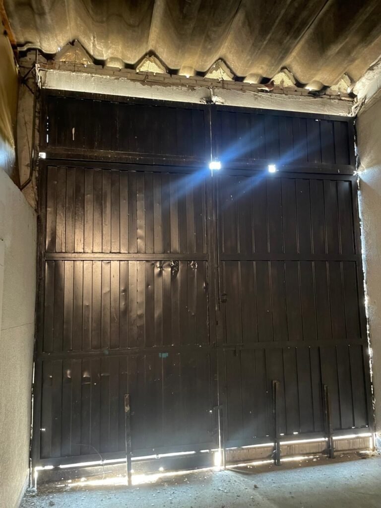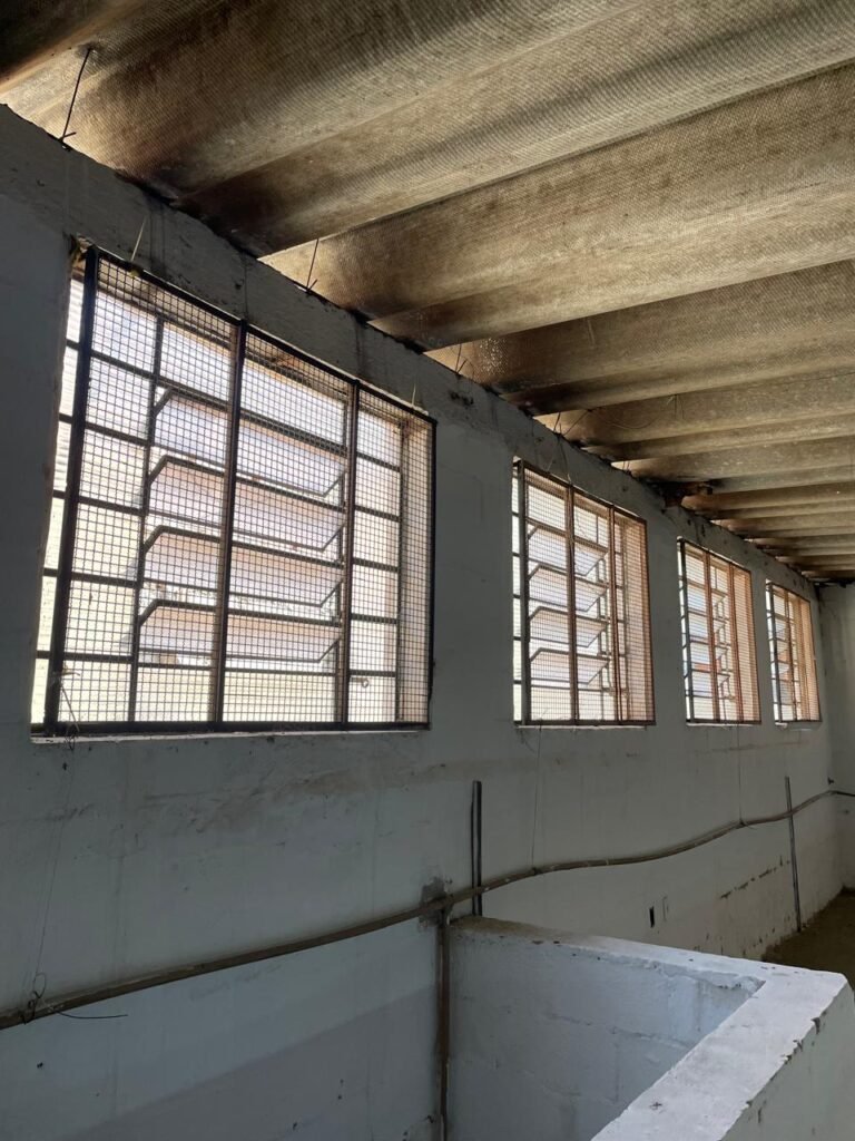 BARRACÃO:- Piso de granilite sujos com remendos, partes faltando e linhas amarelas, paredes com pintura na cor branca com manchas e partes desgastadas, na parte de dentro do portão possui 02 trincos para cadeado porem estão sem cadeados, 02 trincos em ordem, estrutura metálica para suporte das telhas em ordem, telhas de fibrocimento aparentemente em ordem, 05lâmpadas de led em ordem, no fundo 01 interruptor e 01 espelho cego danificado.