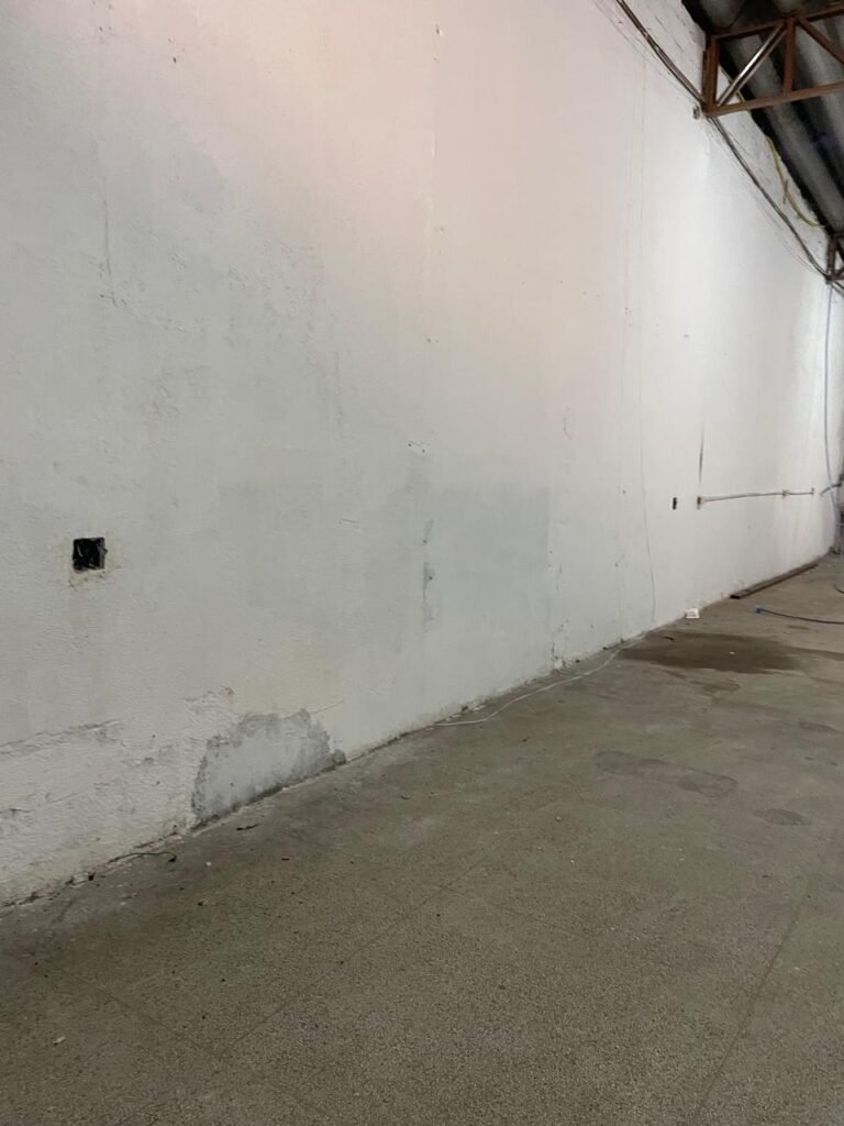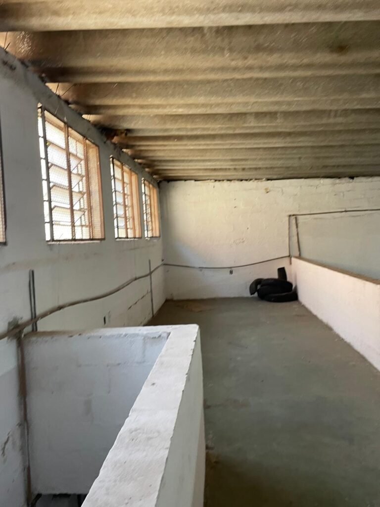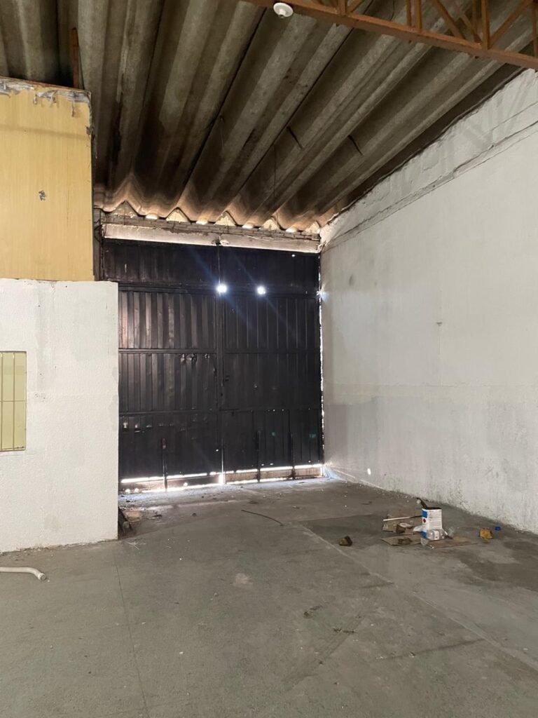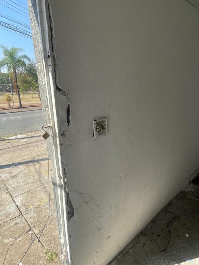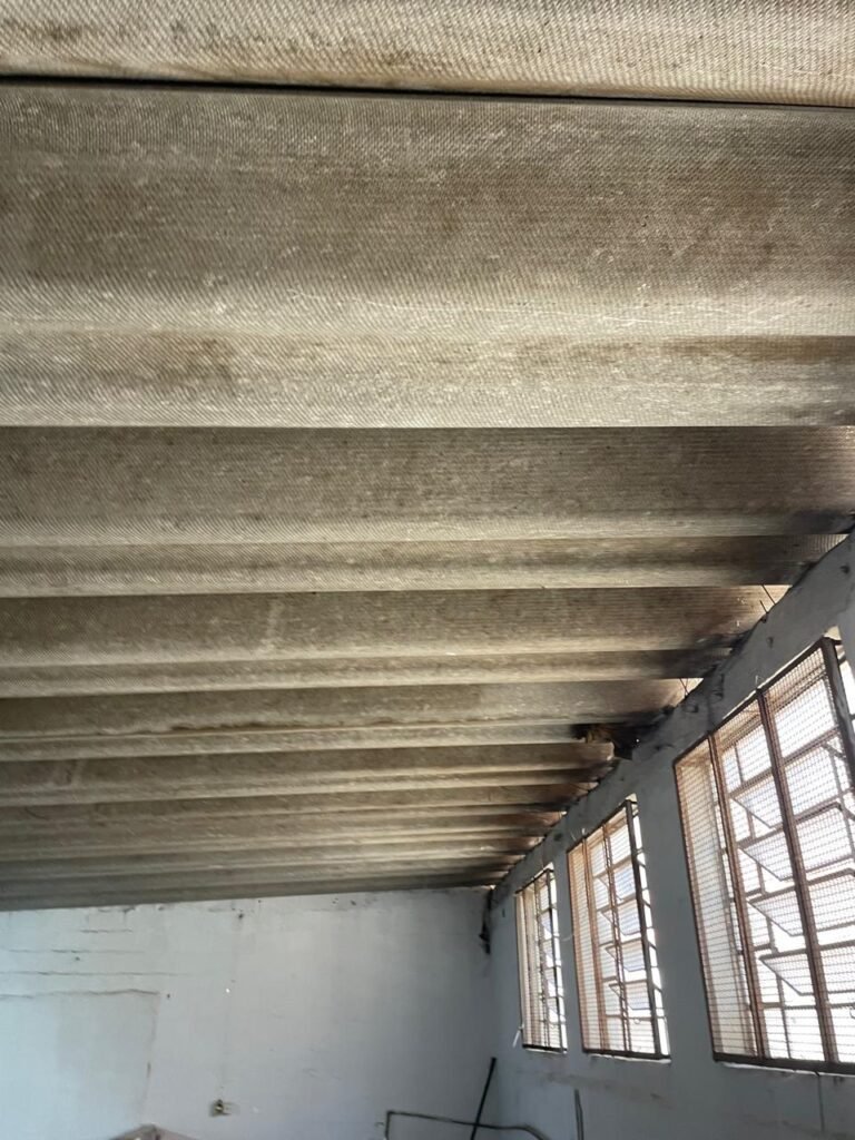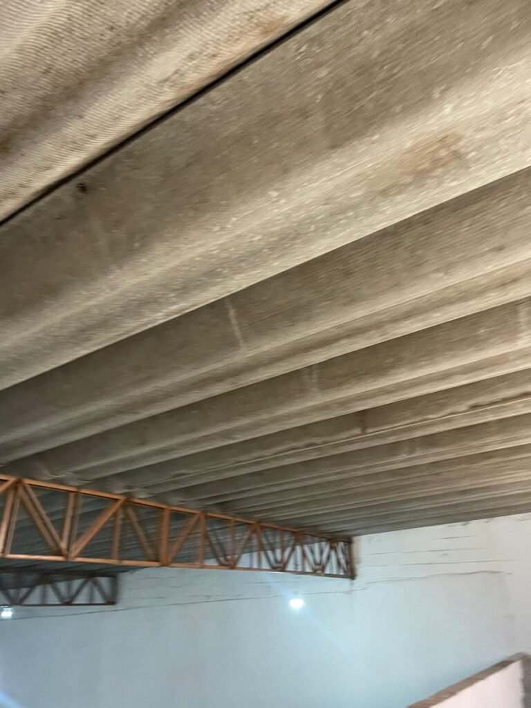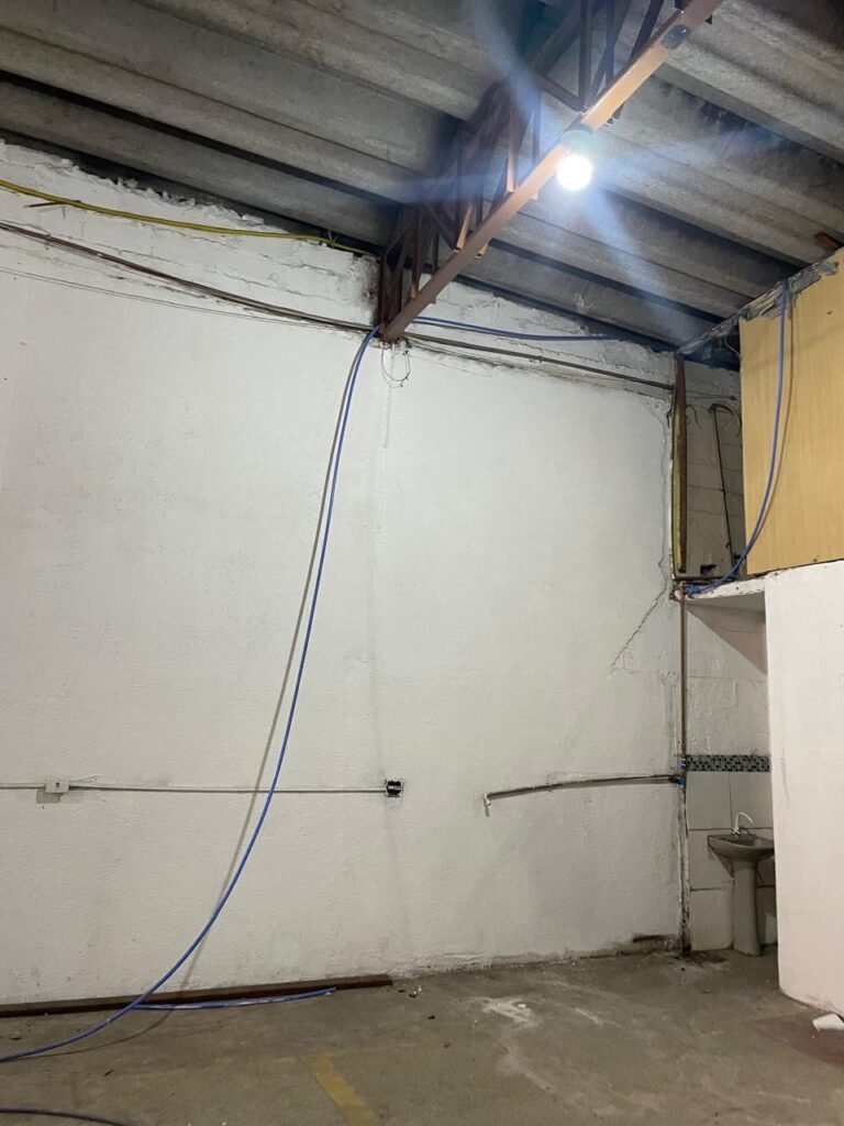 BARRACÃO:- Piso de granilite sujos com remendos, partes faltando e linhas amarelas, paredes com pintura na cor branca com manchas e partes desgastadas, na parte de dentro do portão possui 02 trincos para cadeado porem estão sem cadeados, 02 trincos em ordem, estrutura metálica para suporte das telhas em ordem, telhas de fibrocimento aparentemente em ordem, 05lâmpadas de led em ordem, no fundo 01 interruptor e 01 espelho cego danificado.