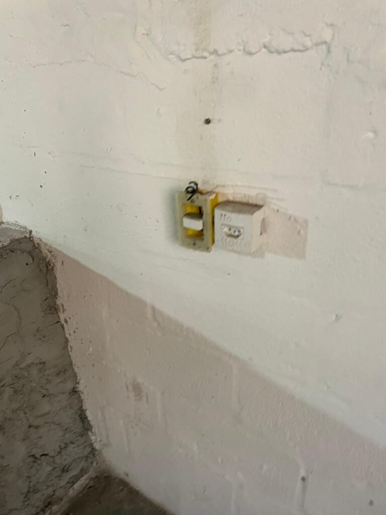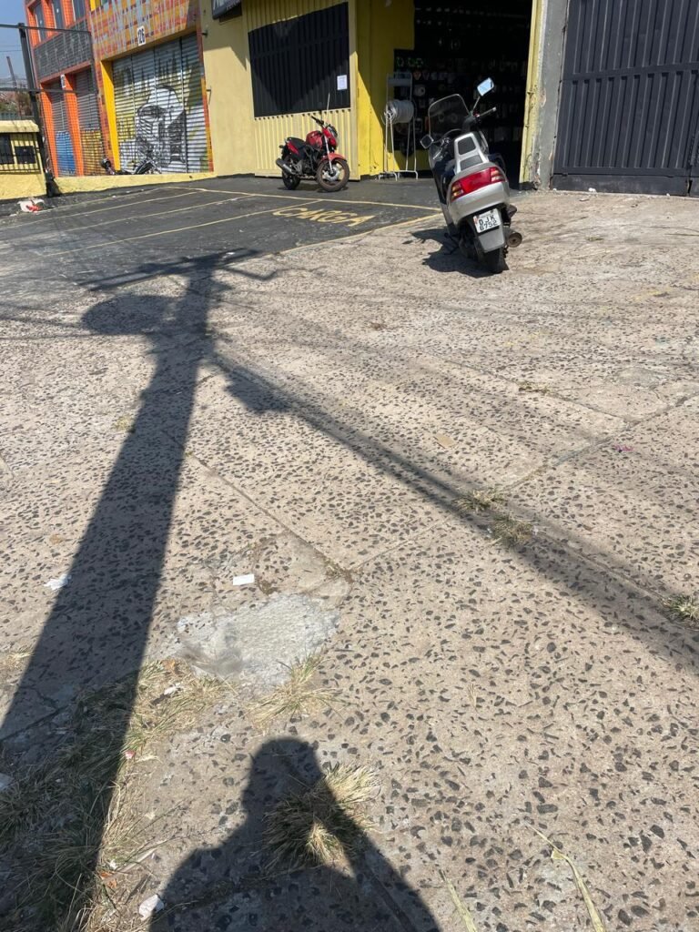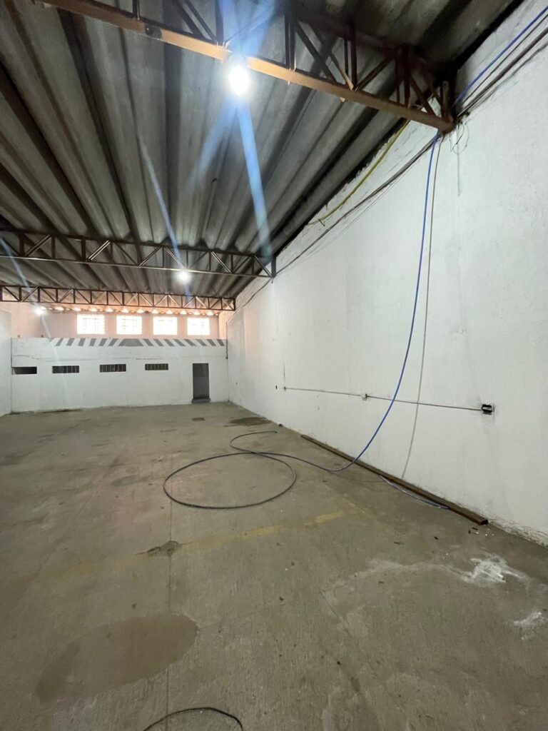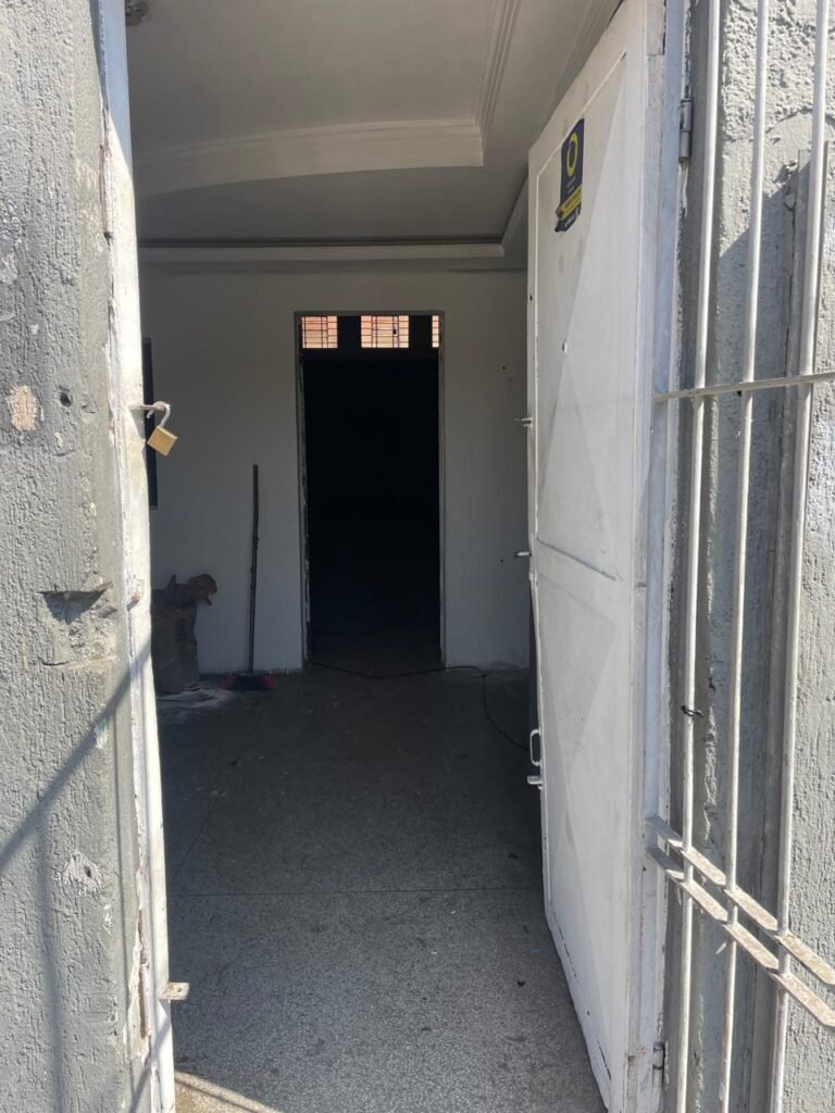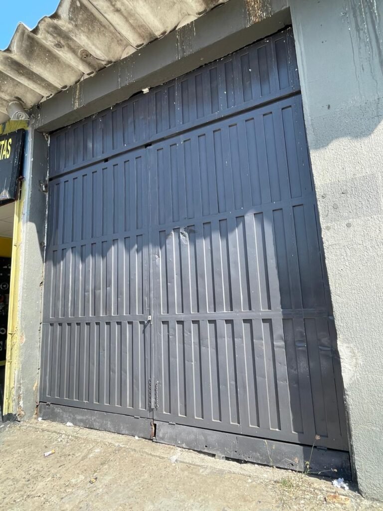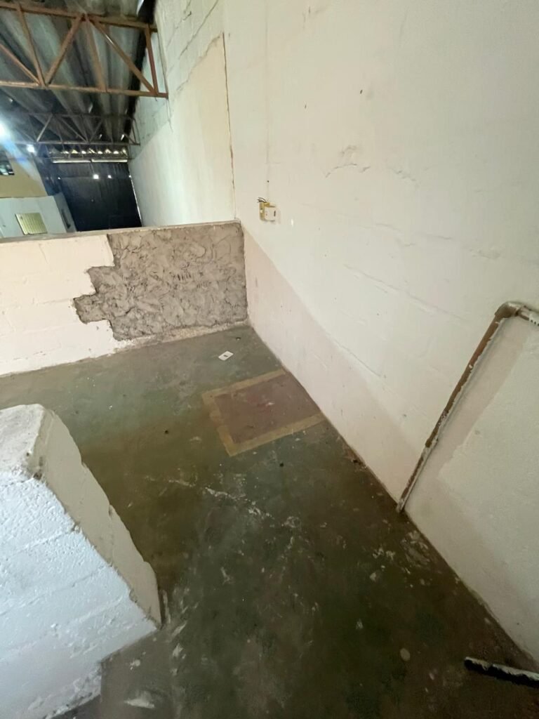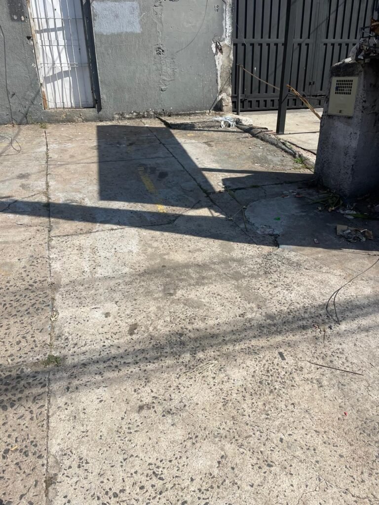 BARRACÃO:- Piso de granilite sujos com remendos, partes faltando e linhas amarelas, paredes com pintura na cor branca com manchas e partes desgastadas, na parte de dentro do portão possui 02 trincos para cadeado porem estão sem cadeados, 02 trincos em ordem, estrutura metálica para suporte das telhas em ordem, telhas de fibrocimento aparentemente em ordem, 05lâmpadas de led em ordem, no fundo 01 interruptor e 01 espelho cego danificado.