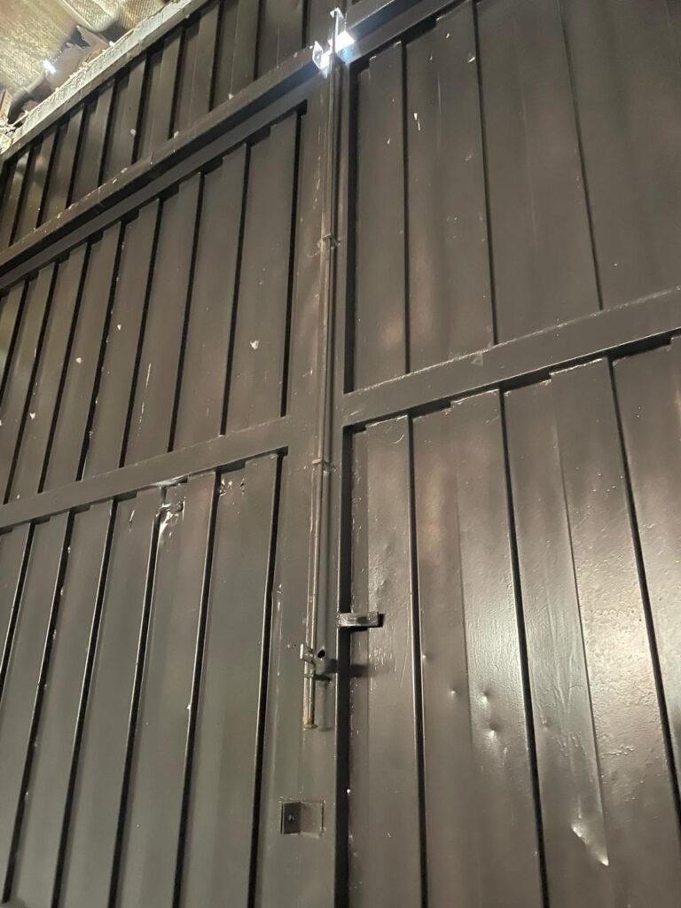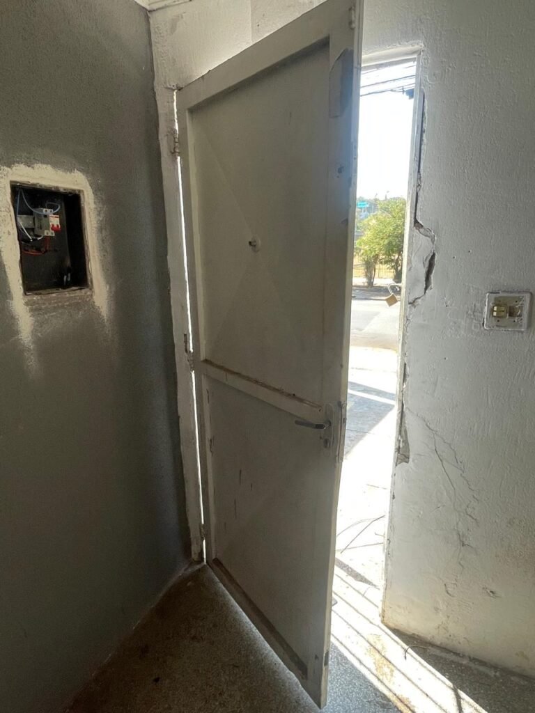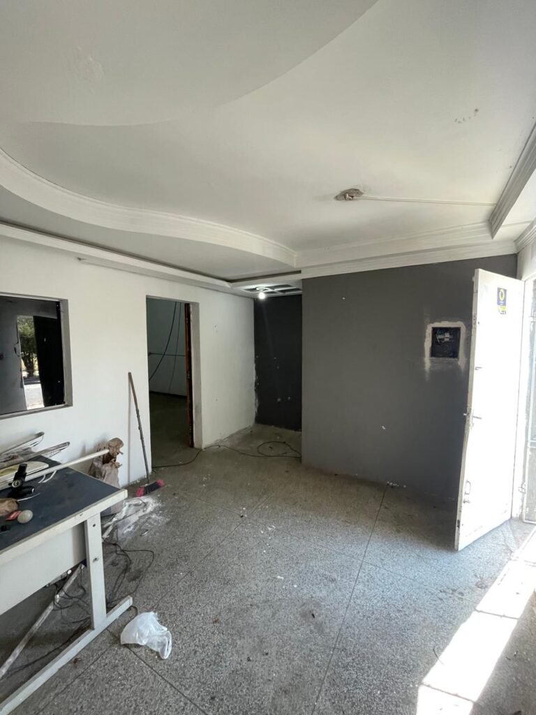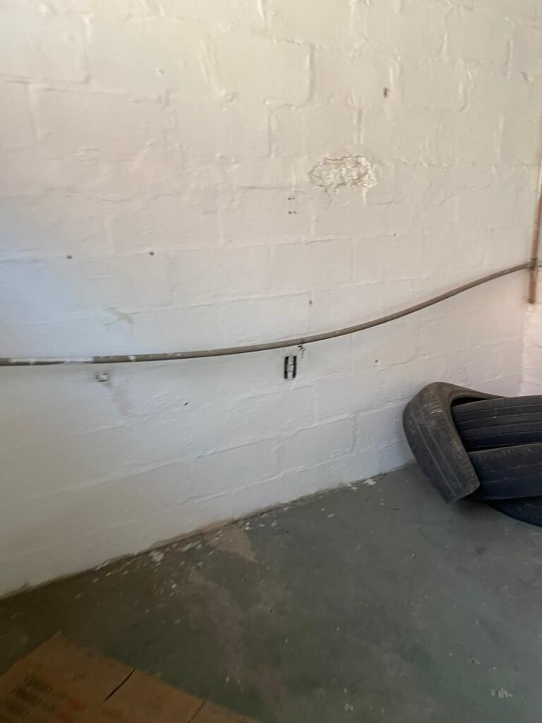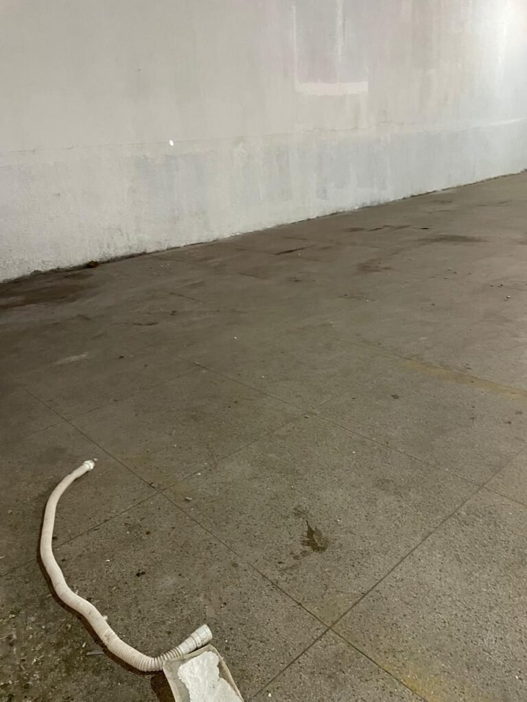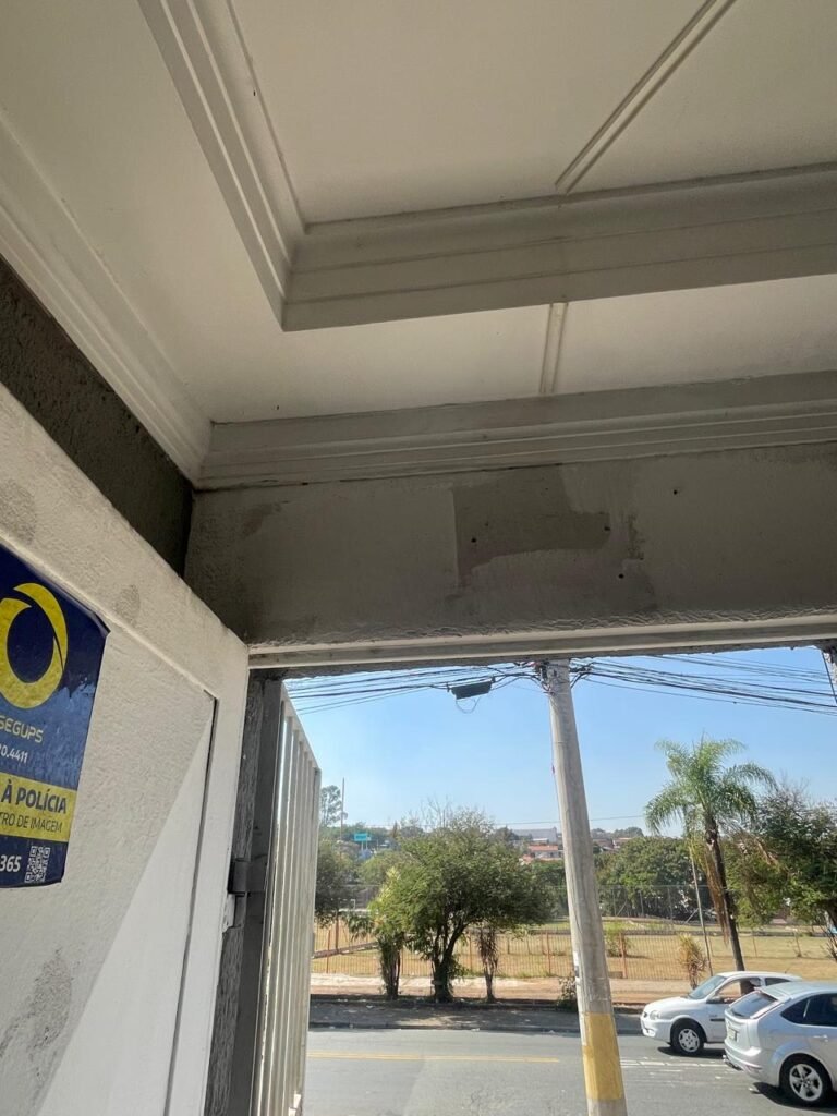 BARRACÃO:- Piso de granilite sujos com remendos, partes faltando e linhas amarelas, paredes com pintura na cor branca com manchas e partes desgastadas, na parte de dentro do portão possui 02 trincos para cadeado porem estão sem cadeados, 02 trincos em ordem, estrutura metálica para suporte das telhas em ordem, telhas de fibrocimento aparentemente em ordem, 05lâmpadas de led em ordem, no fundo 01 interruptor e 01 espelho cego danificado.