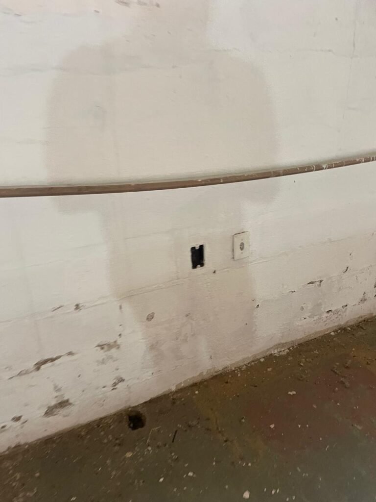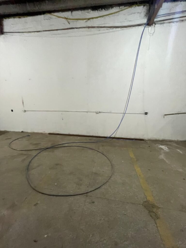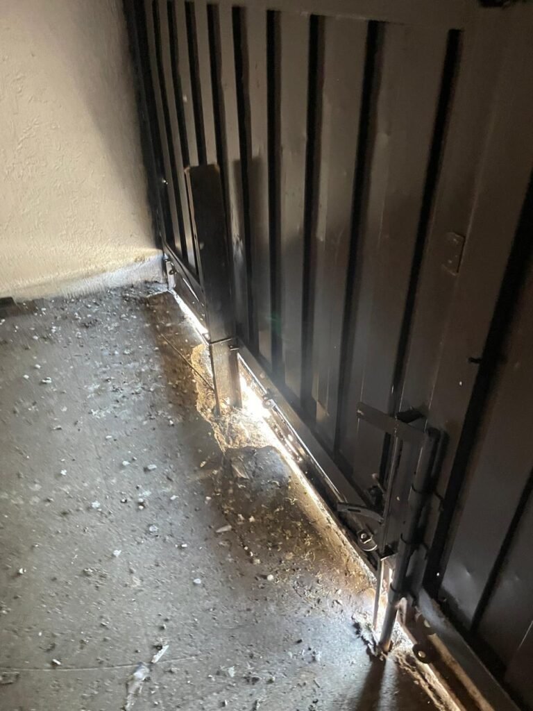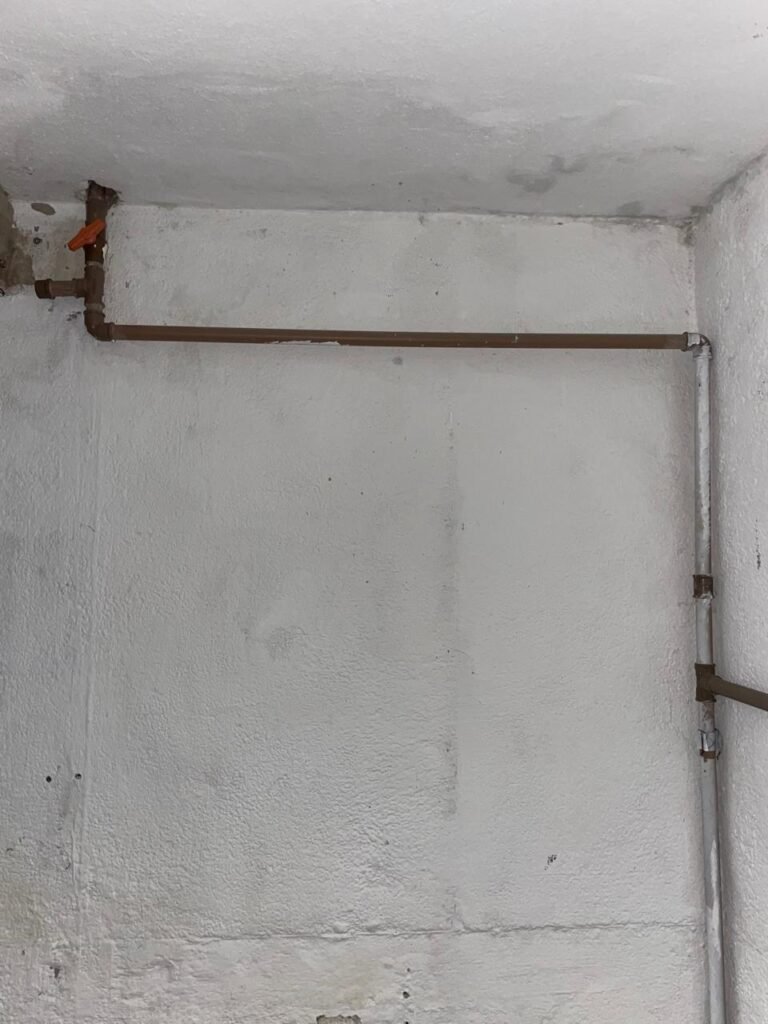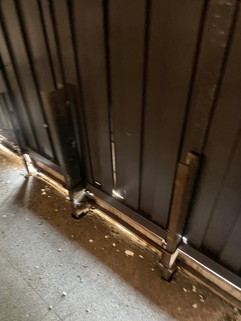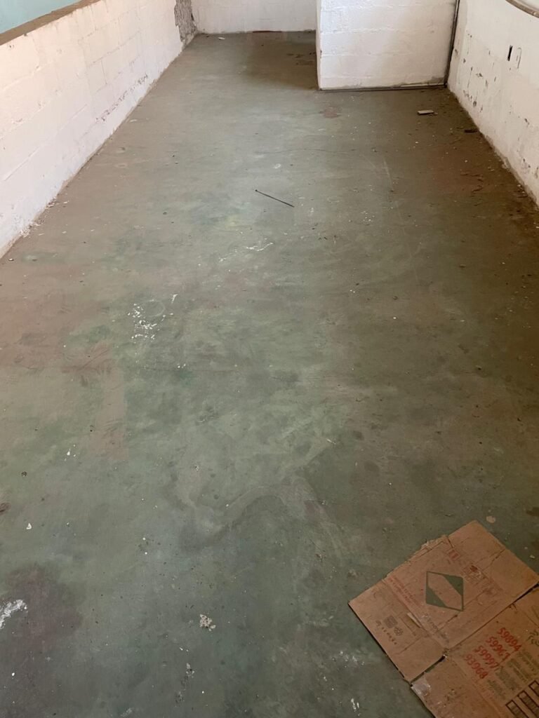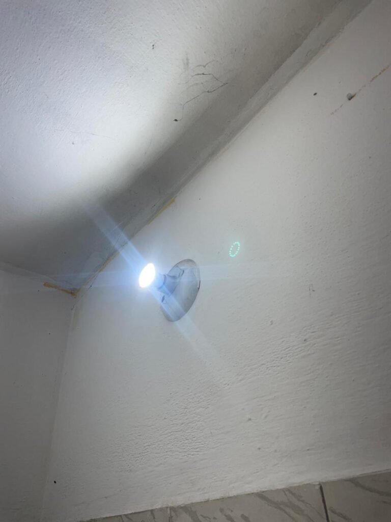 BARRACÃO:- Piso de granilite sujos com remendos, partes faltando e linhas amarelas, paredes com pintura na cor branca com manchas e partes desgastadas, na parte de dentro do portão possui 02 trincos para cadeado porem estão sem cadeados, 02 trincos em ordem, estrutura metálica para suporte das telhas em ordem, telhas de fibrocimento aparentemente em ordem, 05lâmpadas de led em ordem, no fundo 01 interruptor e 01 espelho cego danificado.