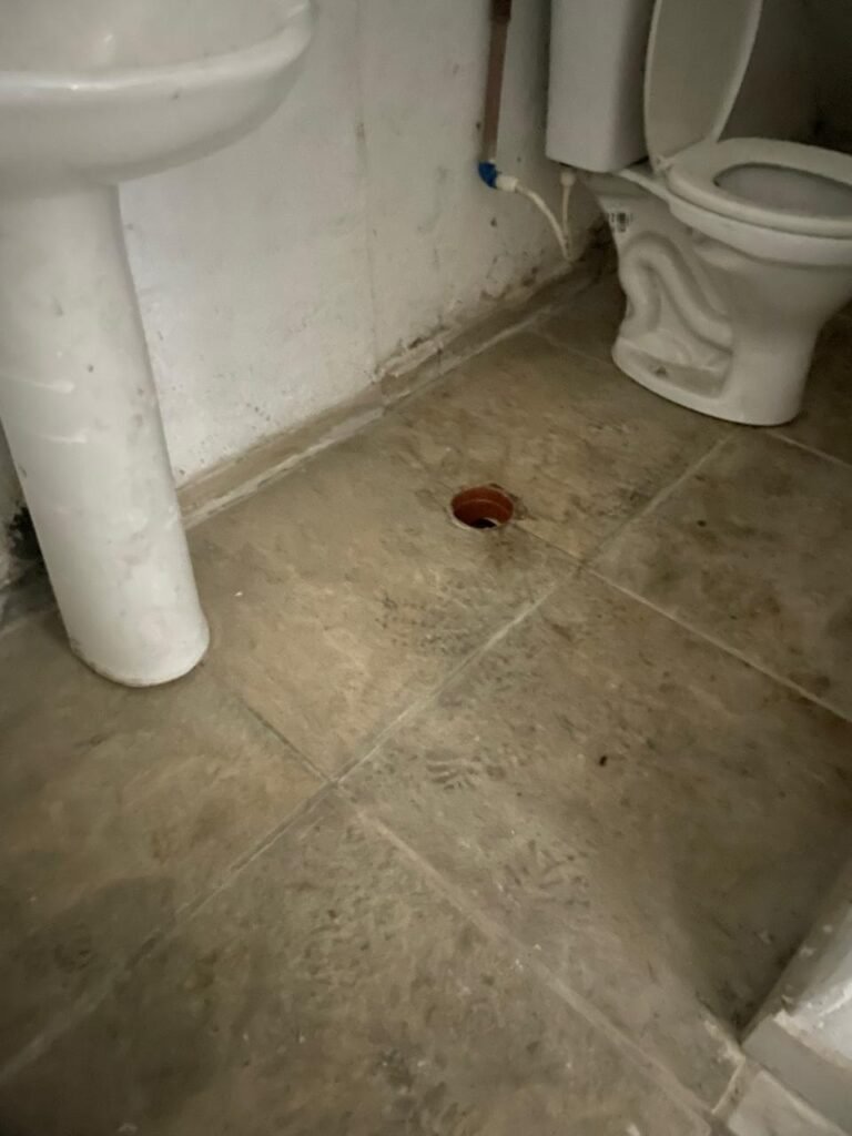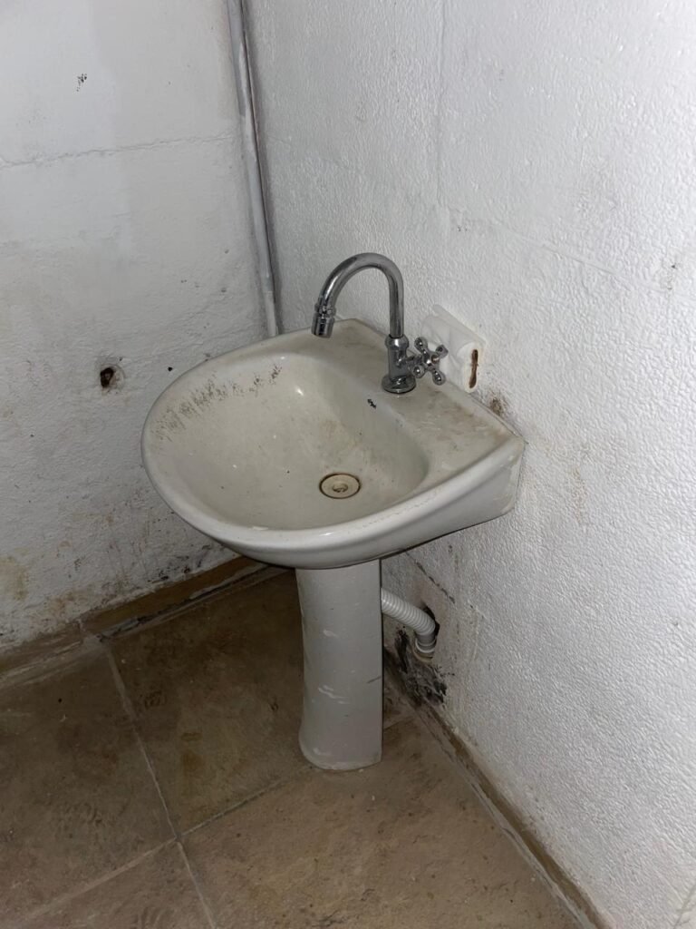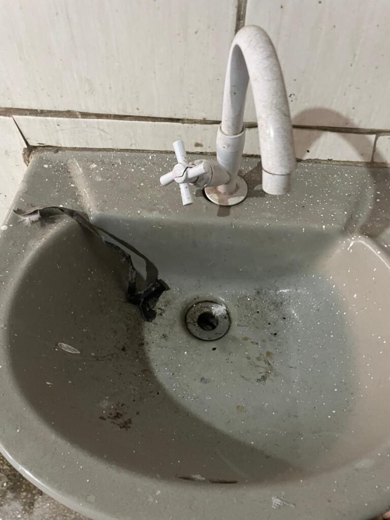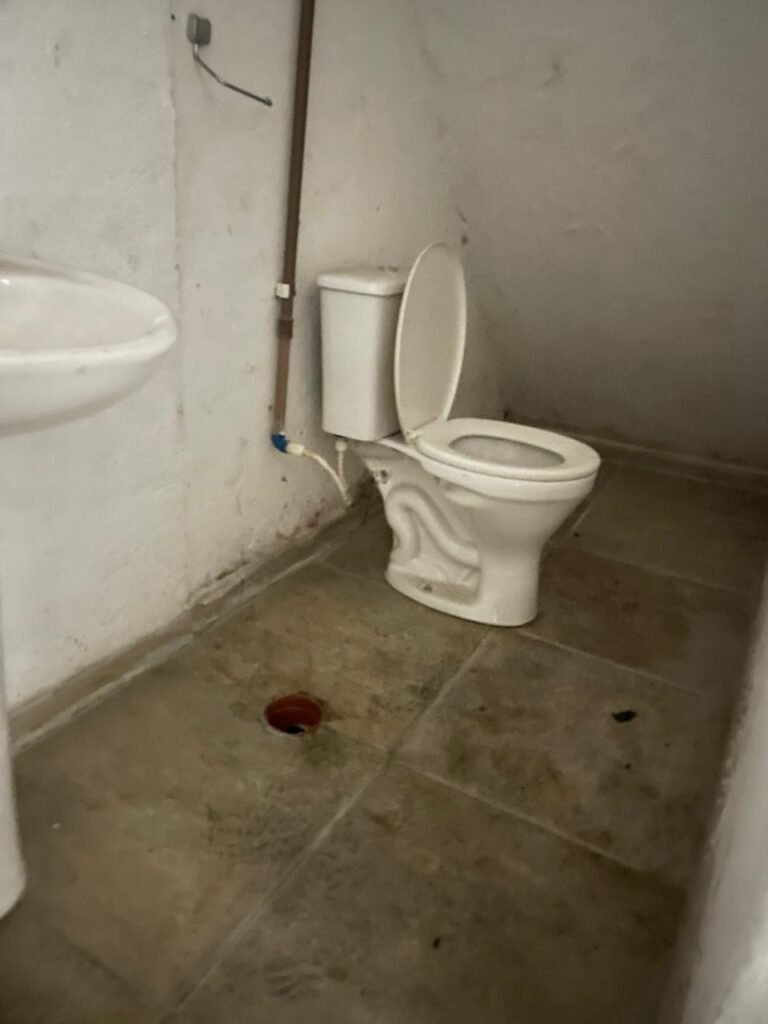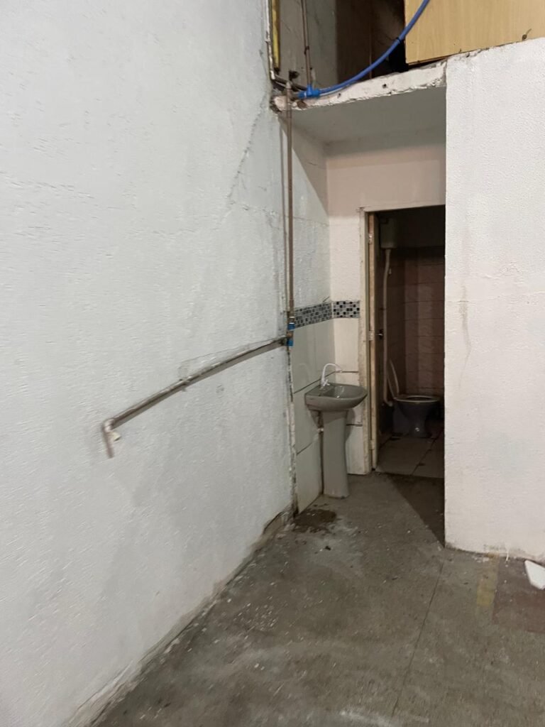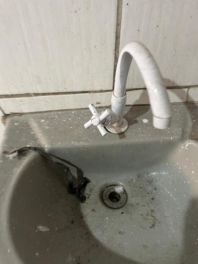 WC BARRACÃO:- 01 Pia cerâmica com coluna na cor cinza em ordem, 01 tornei na cor branca em ordem, parede ½ revestida de ceramida com piso estufado e restante em ordem, divoria de pastilhas em ordem, restante da parede com textura e pintura na cor branca em ordem, 01 porta de madeira com destes naturais e manchas,, piso revestido de frio ceramico com manchas, tincados e partes faltando, conjunto sanitário ceramico na cor cinza em ordem, com tampa e acento na cor branco em ordem, caixa de descarga em ordem.