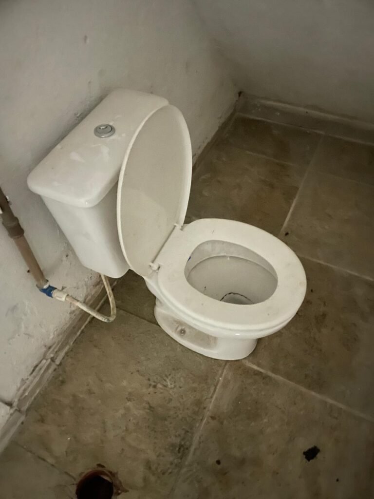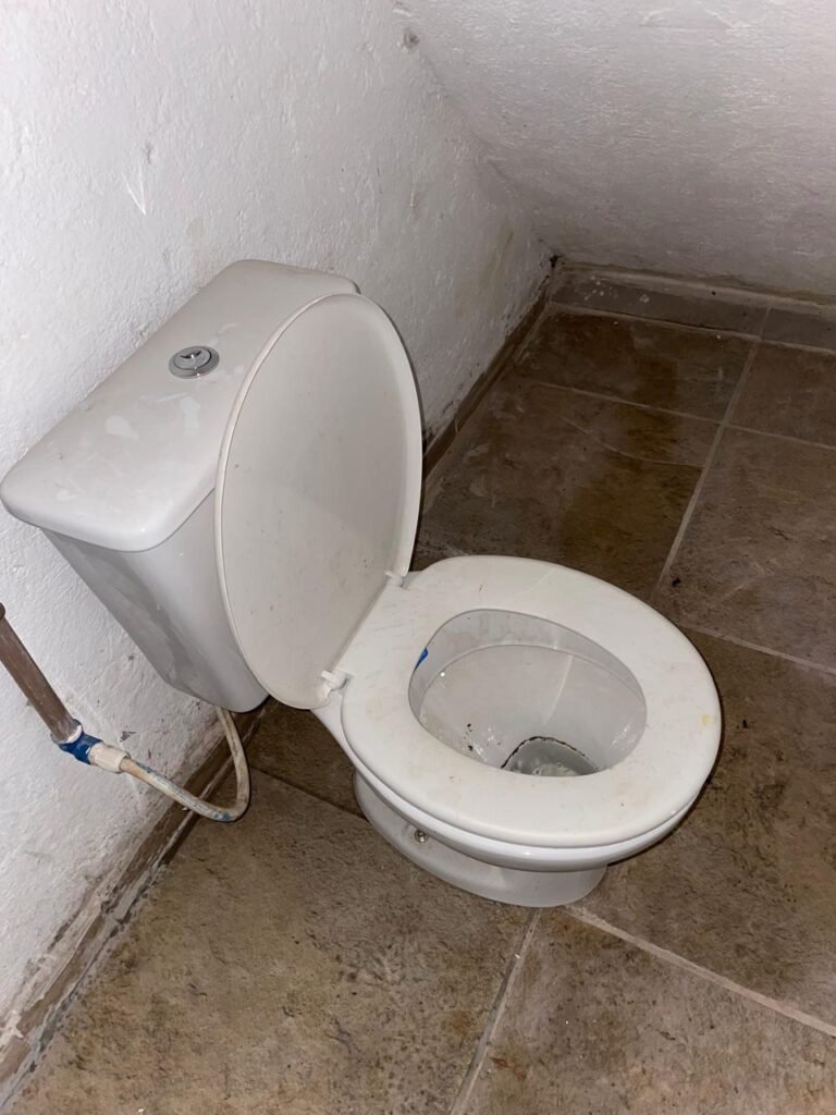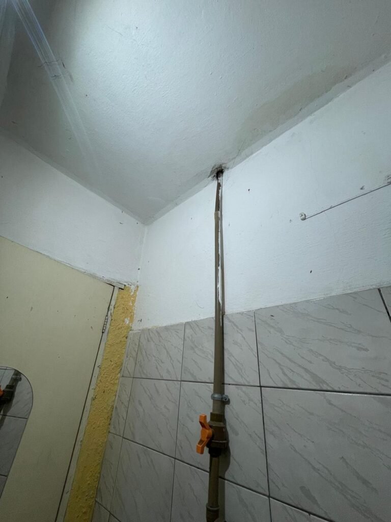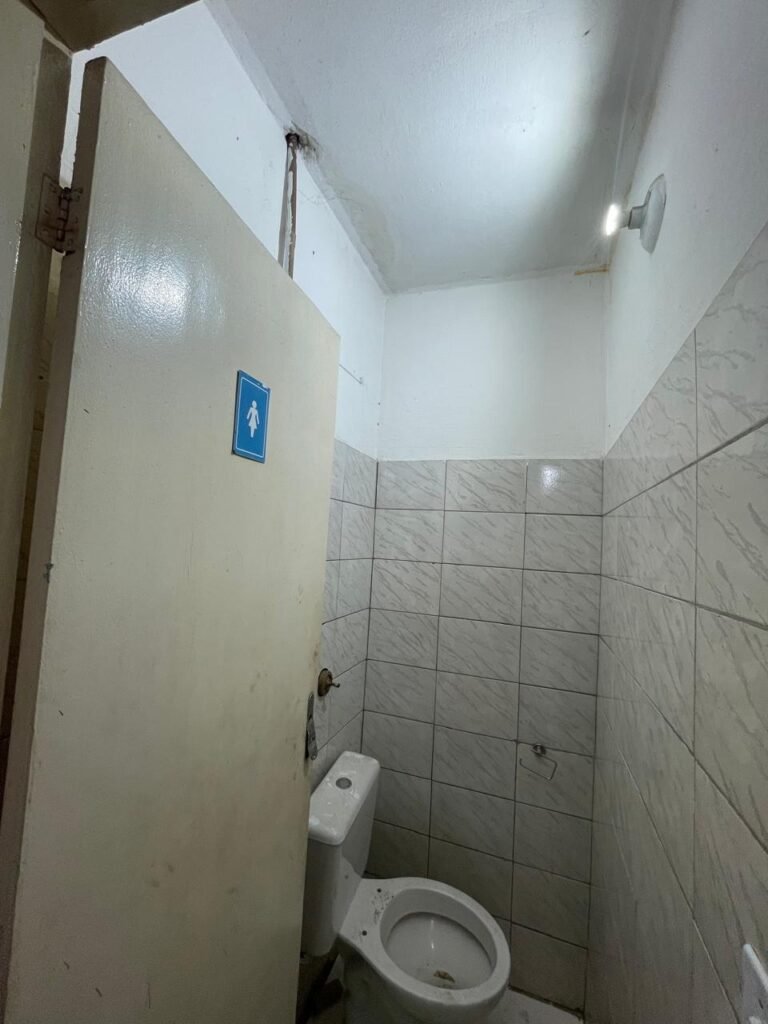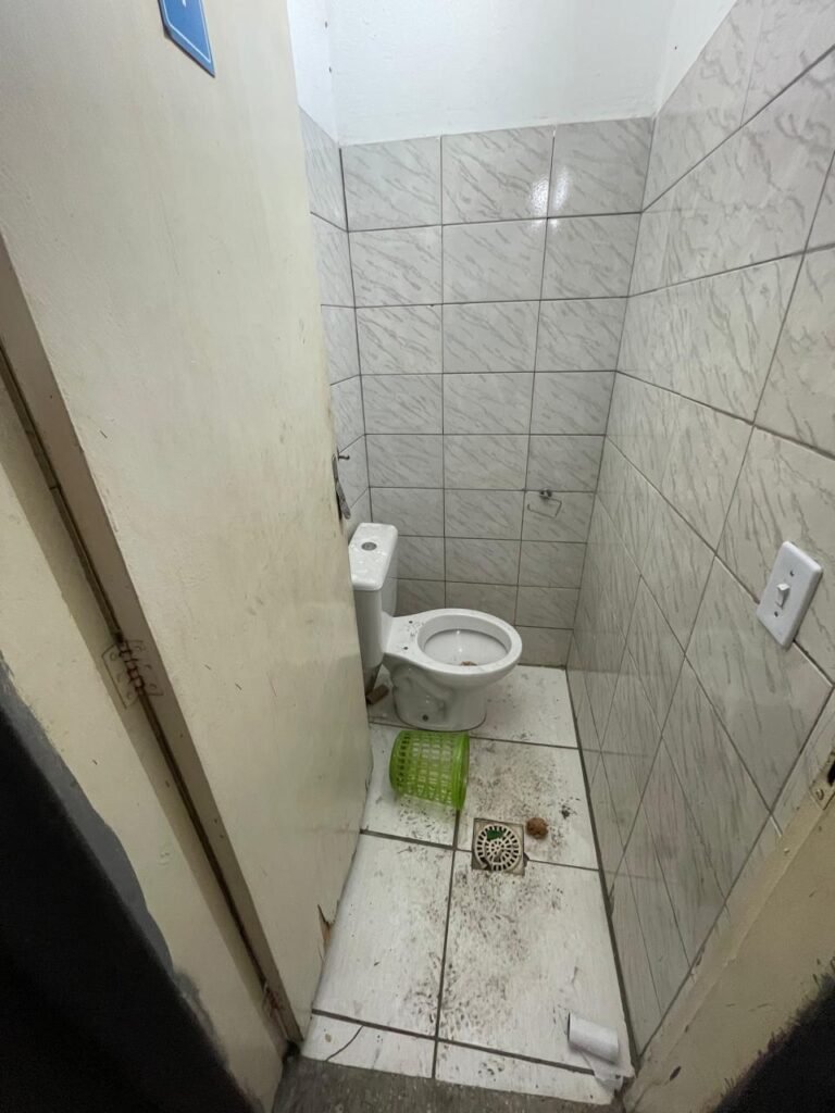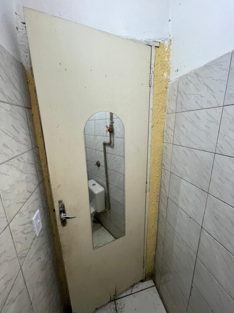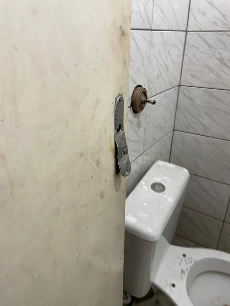 WC RECEPÇÃO:- 01 Porta de madeira na com bege claro com manchas, rachaduras e saindo lascas, sem maçaneta do lado de fora e sem chaves, apenas o acabamento amassado, 01 ralo de plástico em ordem, paredes revestidas de cerâmica fria com 01 peça faltando um pedaço até a 1,70 de altura e restante com pintura na cor branca, 01 suporte para papel em ordem, 01 conjunto sanitário na cor branco em ordem, sem tampa e descarga não testada, 01 interruptor em ordem, 01 bocal com lâmpada em funcionamento, 01 registro para descarga sem funcionamento, canos de pvc com registro em ordem, 01 espelho atrás d a porta em ordem, parede lateral da porta com pintura na cor amarela, teto com pintura na cor branca com manchas e marcas de infiltração.