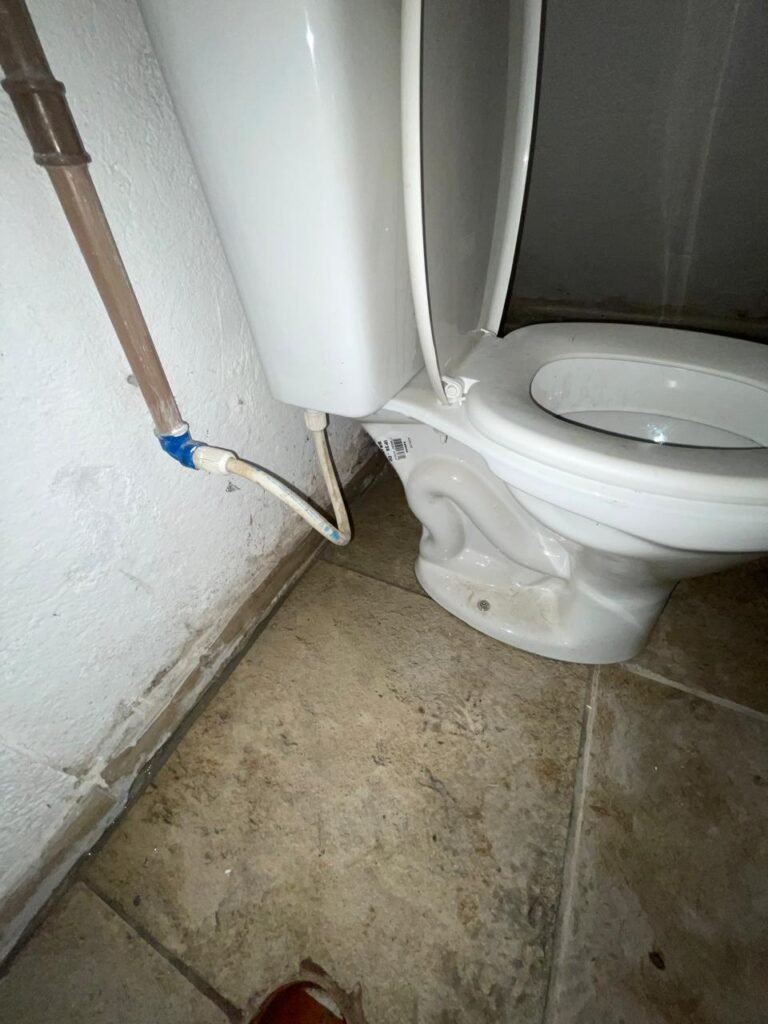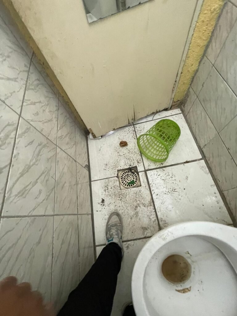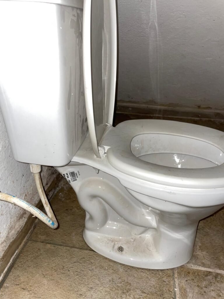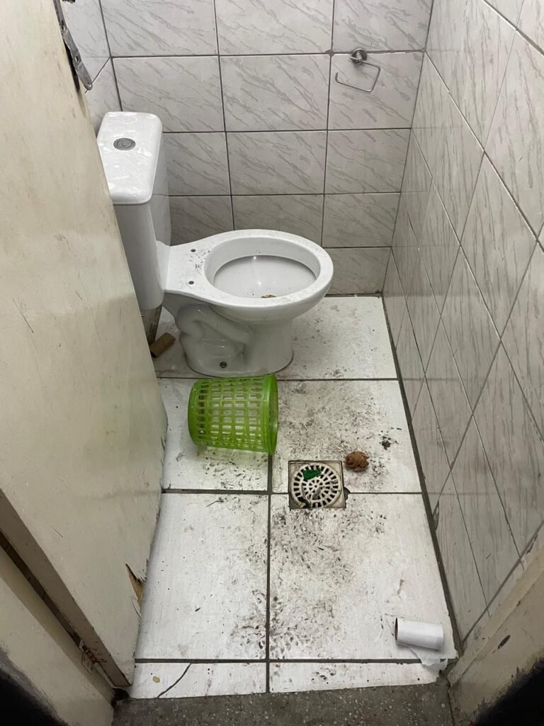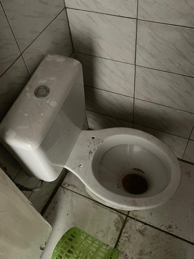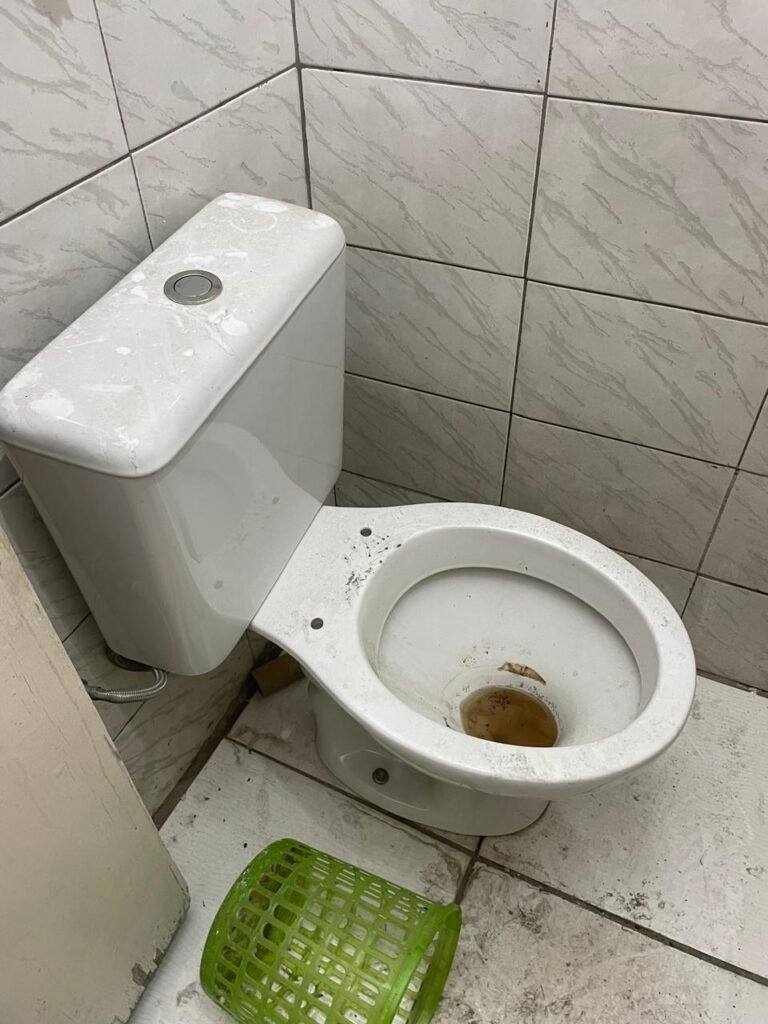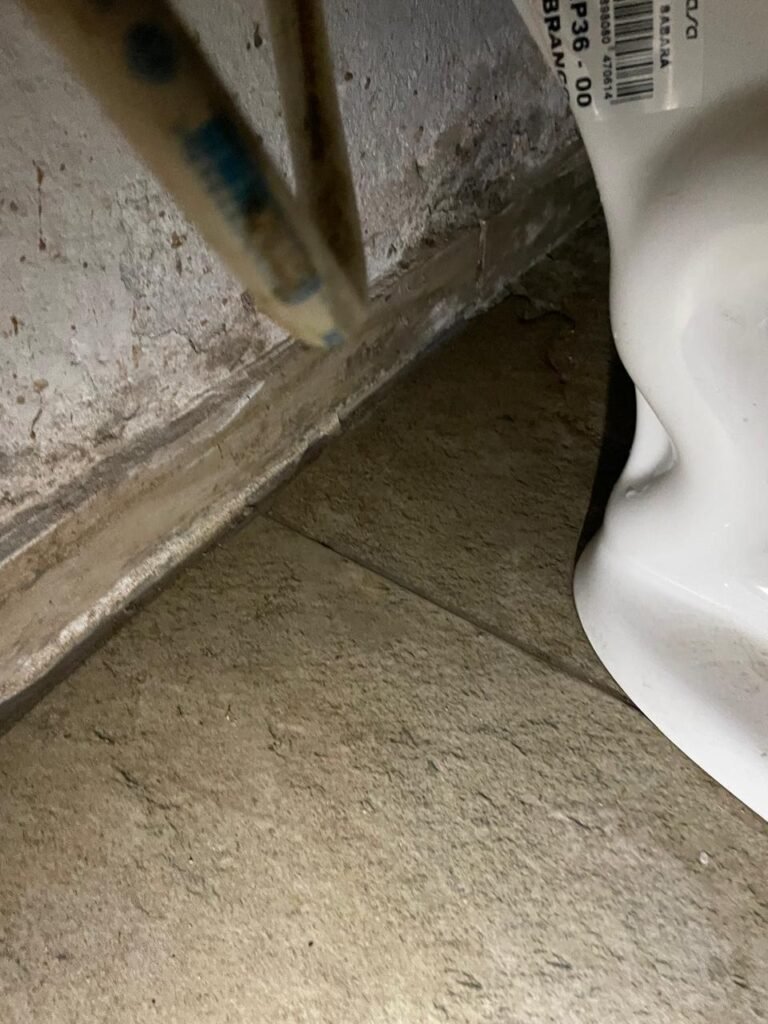 WC RECEPÇÃO:- 01 Porta de madeira na com bege claro com manchas, rachaduras e saindo lascas, sem maçaneta do lado de fora e sem chaves, apenas o acabamento amassado, 01 ralo de plástico em ordem, paredes revestidas de cerâmica fria com 01 peça faltando um pedaço até a 1,70 de altura e restante com pintura na cor branca, 01 suporte para papel em ordem, 01 conjunto sanitário na cor branco em ordem, sem tampa e descarga não testada, 01 interruptor em ordem, 01 bocal com lâmpada em funcionamento, 01 registro para descarga sem funcionamento, canos de pvc com registro em ordem, 01 espelho atrás d a porta em ordem, parede lateral da porta com pintura na cor amarela, teto com pintura na cor branca com manchas e marcas de infiltração.