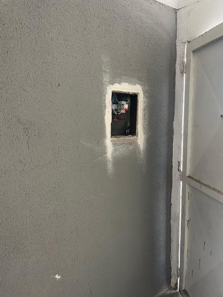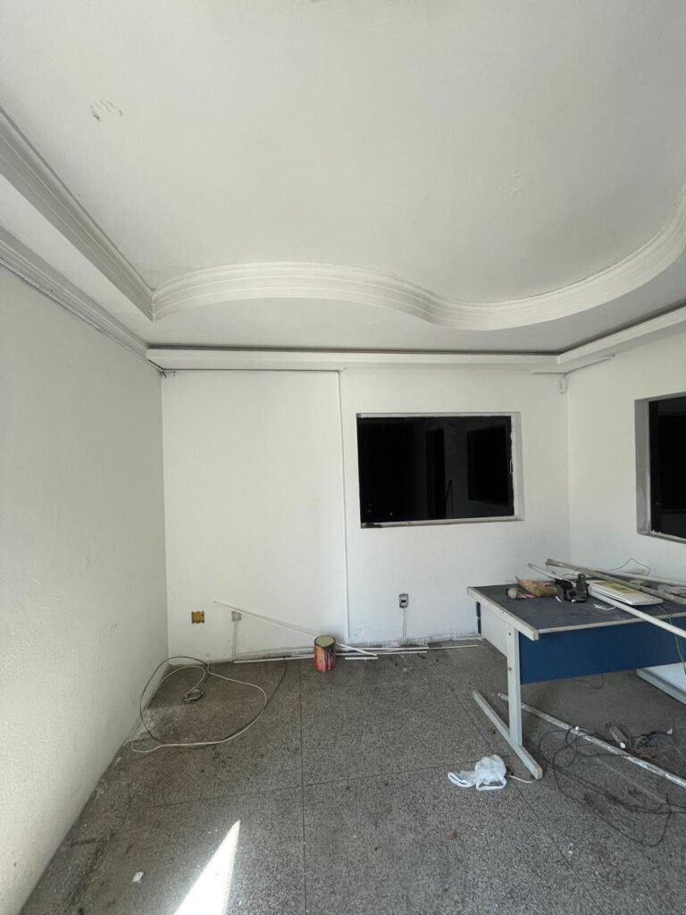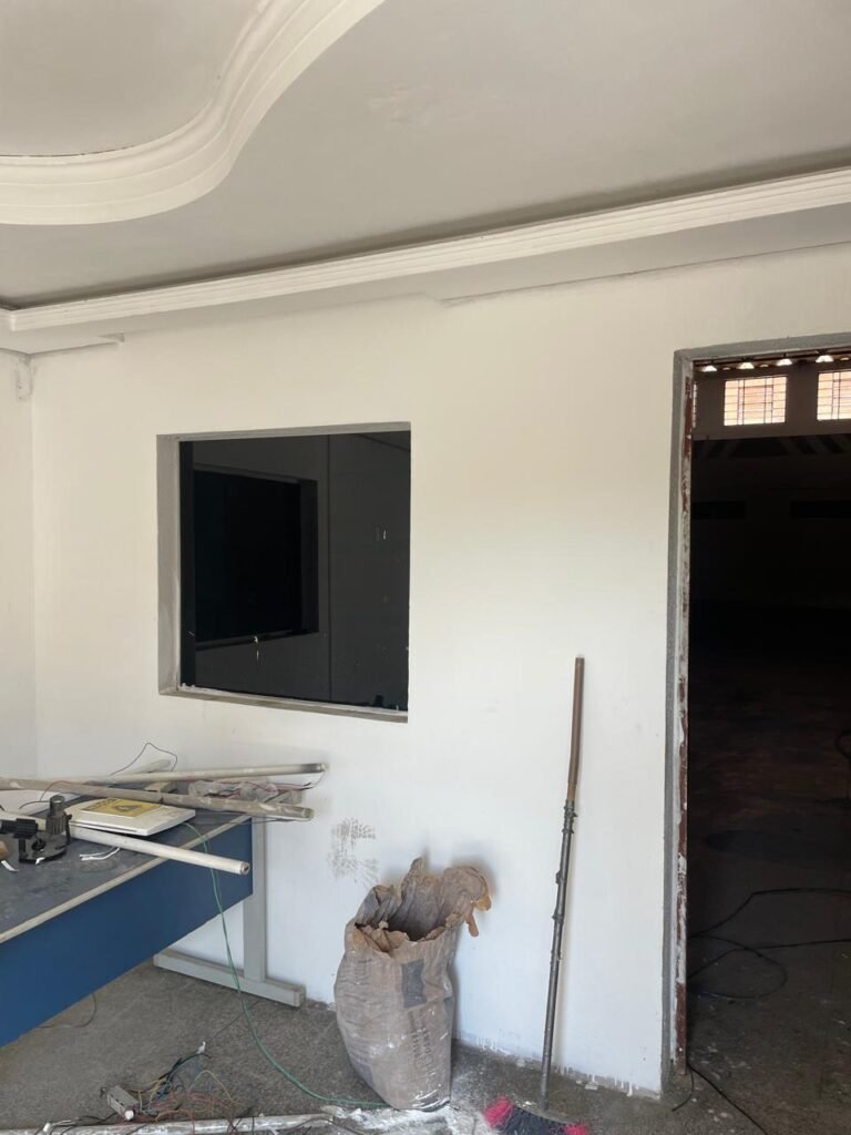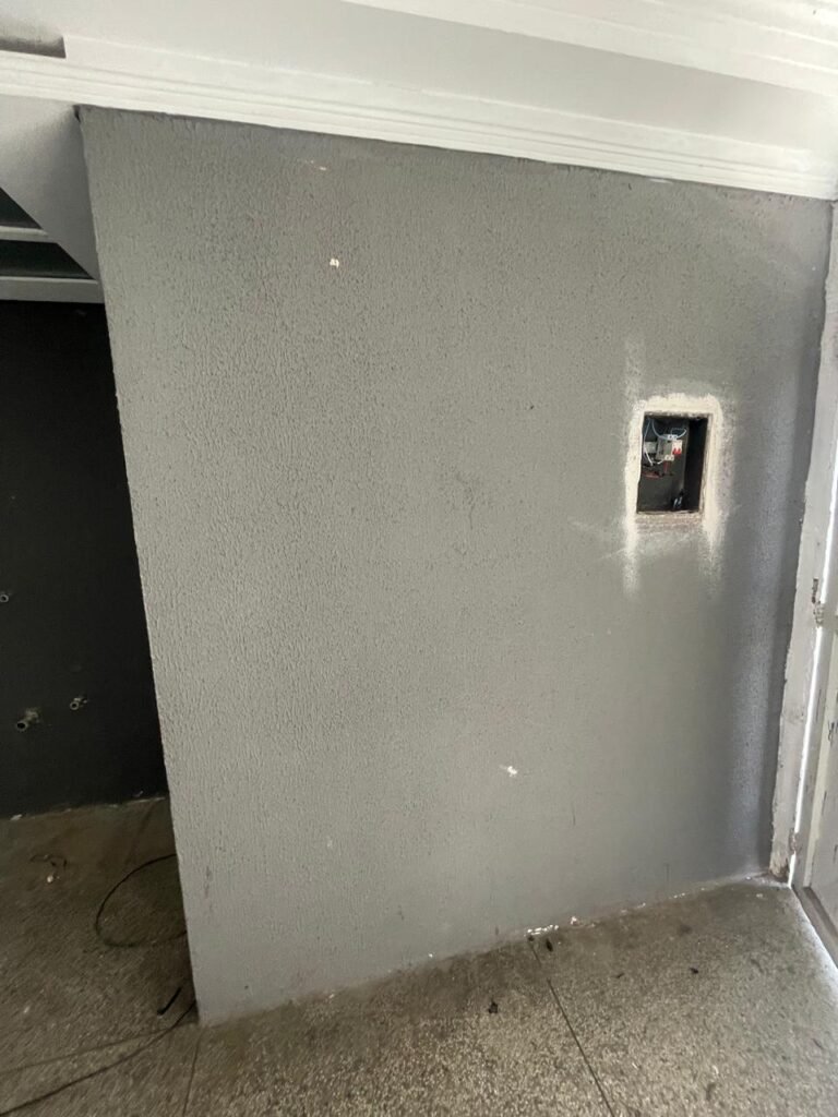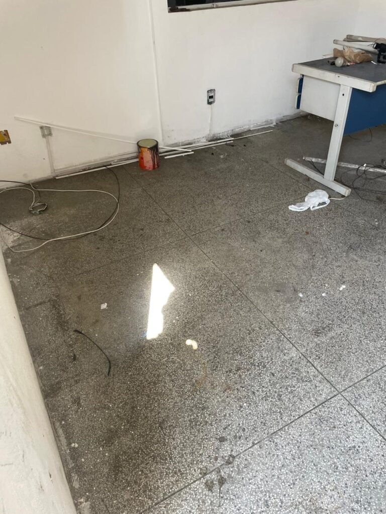 RECEPÇÃO:- Piso granilite sujo e com manchas de tinta, 02 vidros blindex na cor preta com esquadrias brancas em ordem, parede com pintura na cor branca com manchas e desgastes, parede ao lado da porta está com trincas e rachaduras e restante das paredes em ordem, 01 quadro com 01 disjuntor duplo sem tampa em ordem, 01 ponto de instalação para lâmpada sem lâmpada, 01 espelho com 02 interruptores em ordem, 01 espelho com 02 tomadas, 01 bocal com 01 lâmpada em ordem.