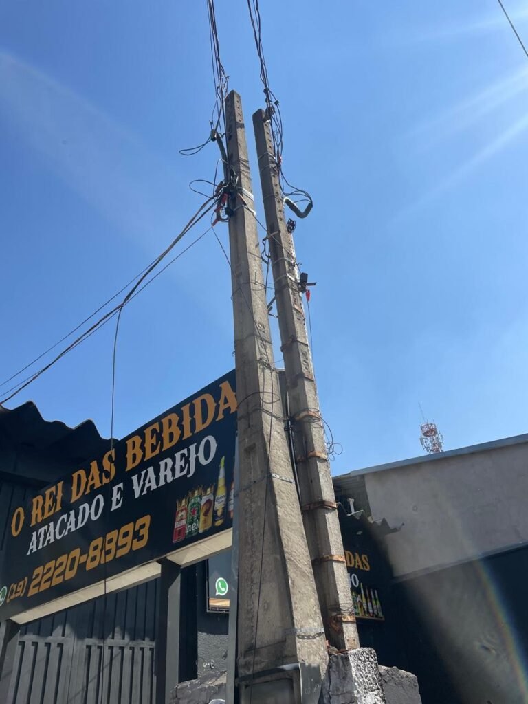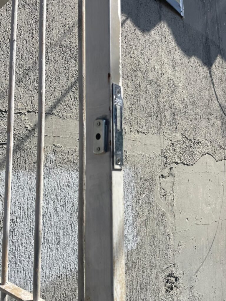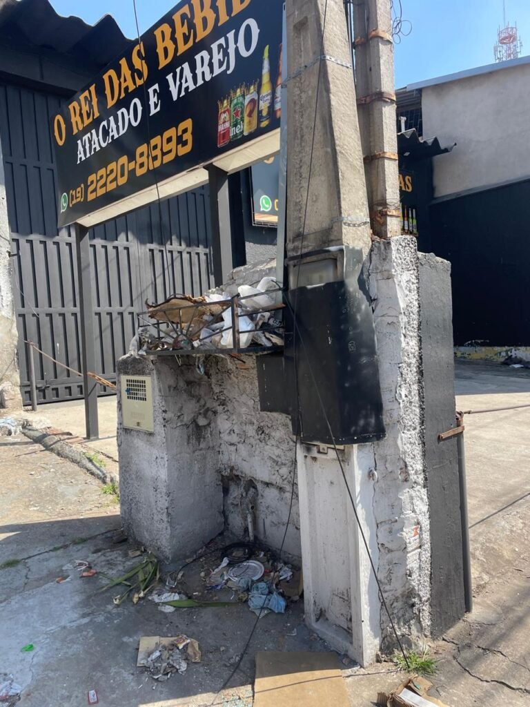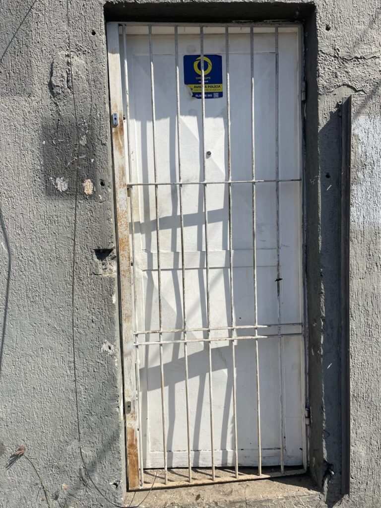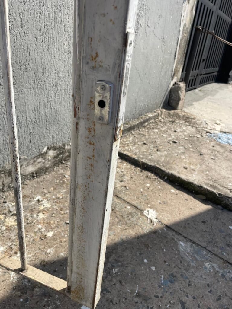 FACHADA:- Calçada de concreto e pedregulhos com rachaduras, remendo e matos pela extensão, 01 relógio padrão sanasa com lacre em ordem, 01 lixeira de ferro na cor cinza com desgastes naturais e restante em ordem, 01 poste padrão cpfl com pintura branca desgastada até a altura do relógio, 01tampa de proteção para o relógio de energia em ordem e 01 proteção de alumínio com pintura na cor preta desgastada, com manchas e marcas na cor branca em cima da tampa de proteção da cpfl ,parede com pintura na coz cinza desgastada, com manchas e partes sem pintar, 01 portão social com pintura na cor cor branca suja e com manchas, 01 olho magico, 02 trincos para cadeado sendo que some 01 deles está com cadeado em ordem, maçaneta está quebrada, 01 grade de ferro de proteção no portão social com pintura na cor branca com desgastes e manchas, 02 fechaduras tipo tetra em ordem, 01 portão com pintura na cor preta com amassados e manchas pela extensão e restante em ordem, 01 corrente em ordem, 01 trinco para cadeado, 03 barras de proteção na parte de baixo do portão em ordem e 04 fechaduras ferrolho.